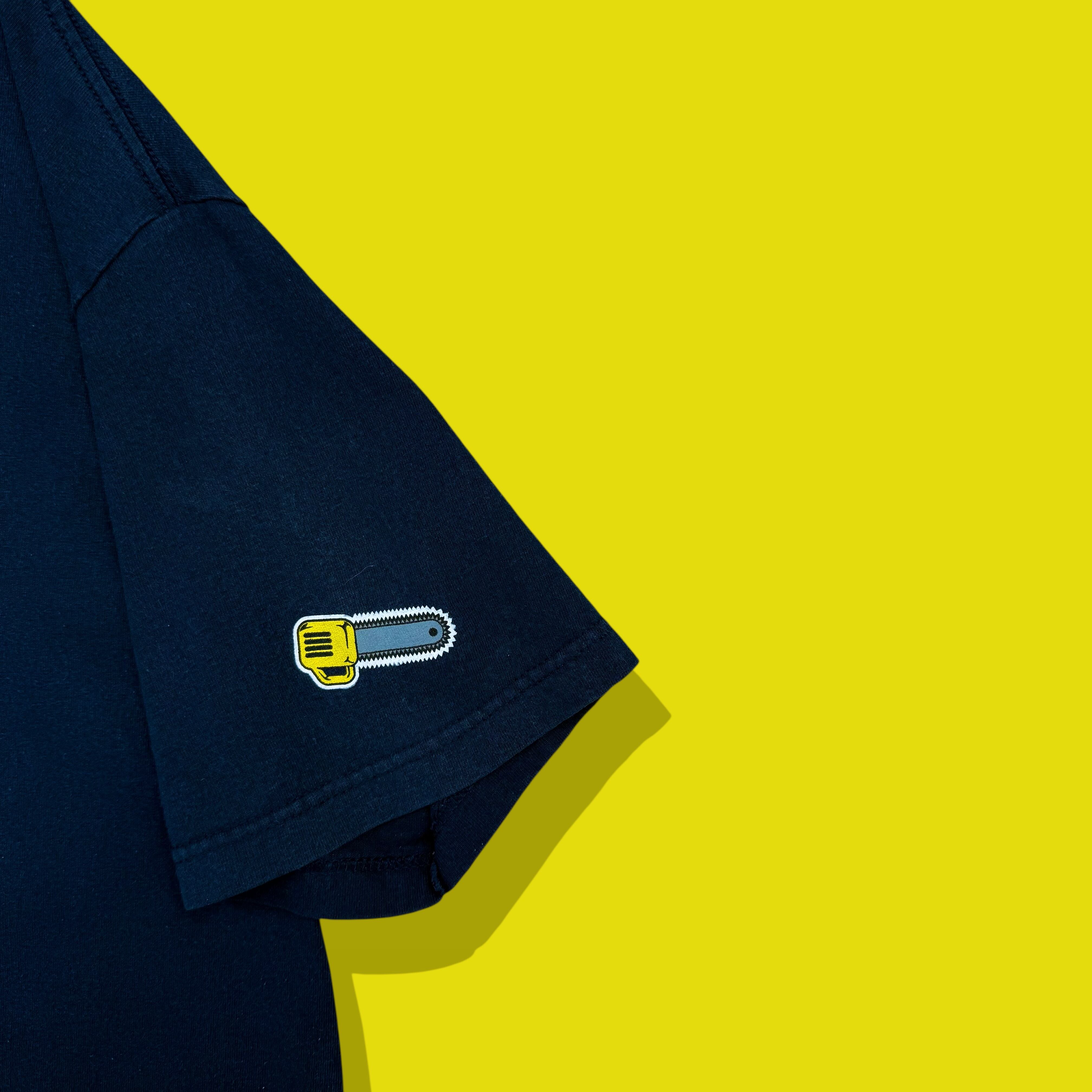ボディは深みのあるネイビー。袖にはチェーンソーのワンポイント刺繍、背面にはキャラクターの後ろ姿がプリントされ、前後左右すべてにギミックが施された構成。カートゥーン調ながらもどこか毒気を帯びた世界観は、アメリカン・サブカルチャーのエッセンスを色濃く反映しています。