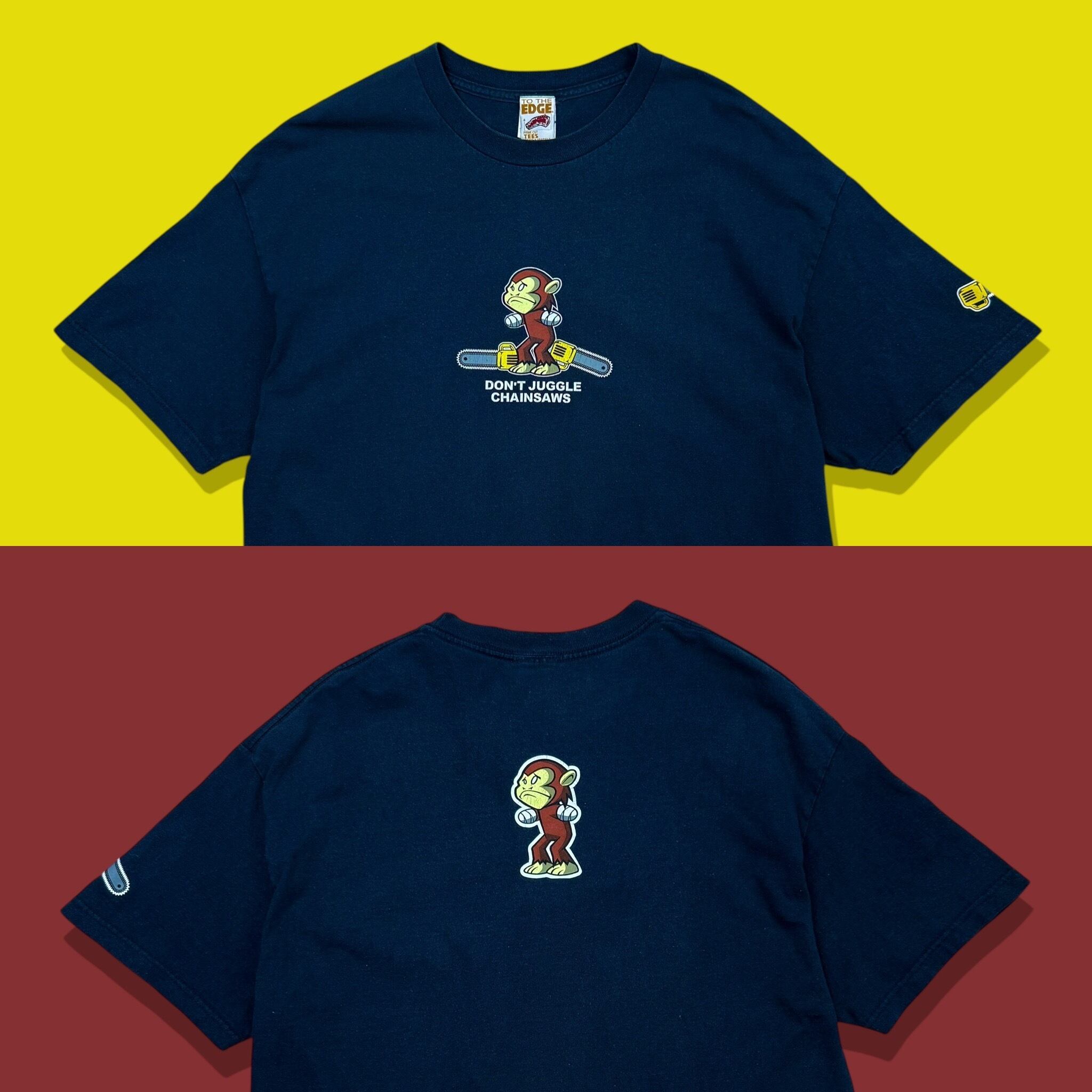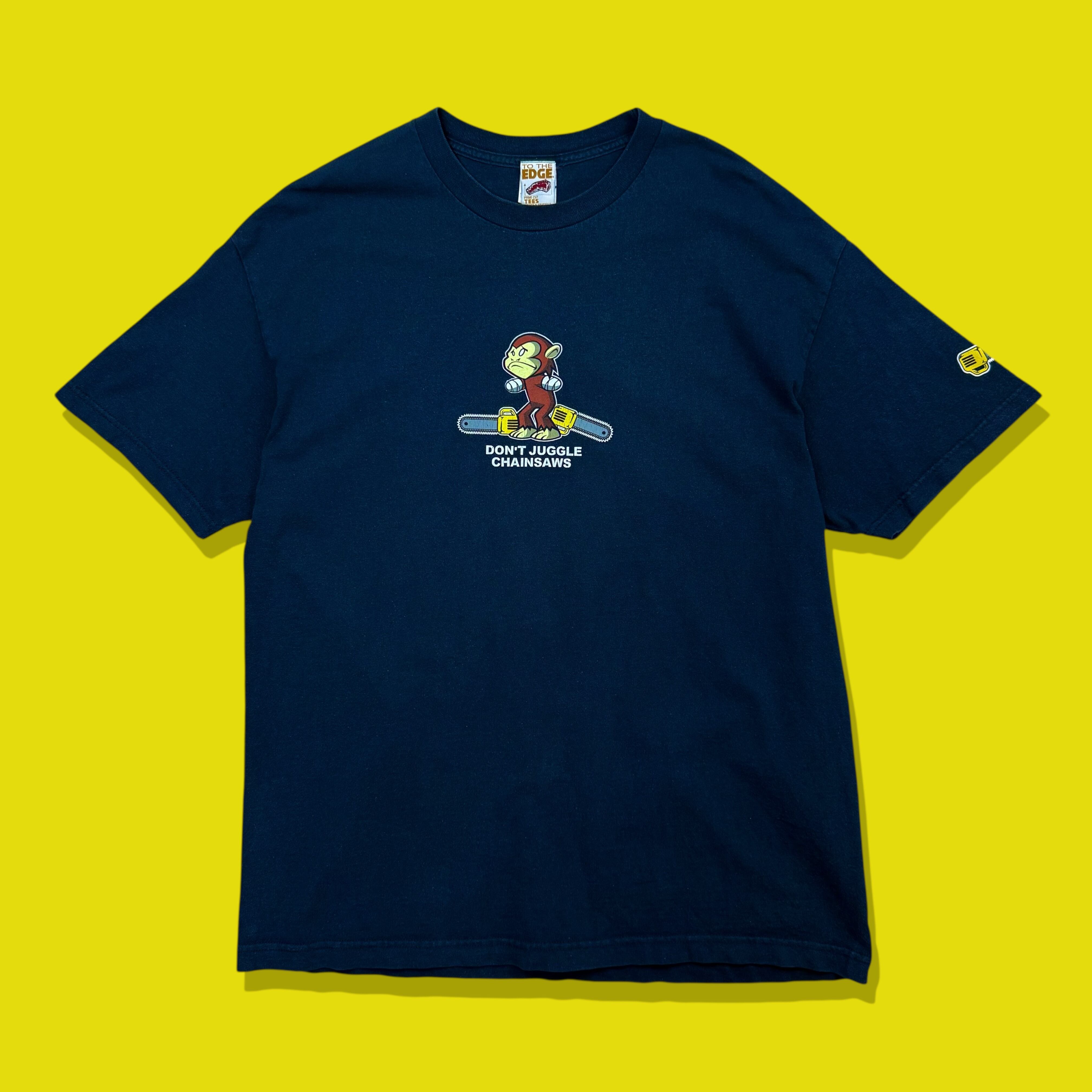 怒ったような表情のサルがチェーンソーを両手に持つ、インパクト抜群のキャラクターグラフィックに、「DON’T JUGGLE CHAINSAWS(チェーンソーをジャグリングするな)」というブラックユーモアあふれるメッセージを添えた、遊び心満載の一枚です。