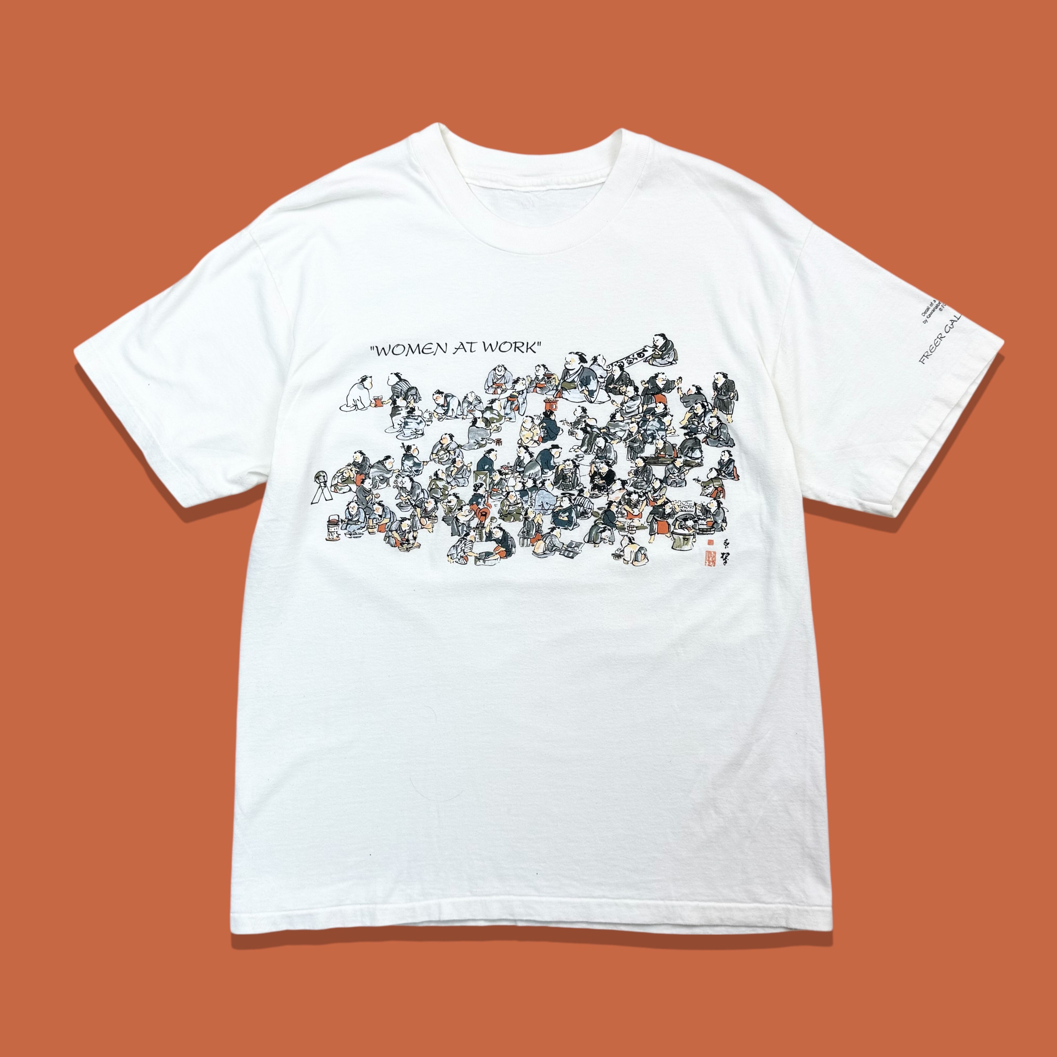 フロントには「WOMEN AT WORK」のタイトルとともに、大勢の女性たちが働く様子を描いた浮世絵がプリントされています。繊細な描線と構図に加え、アクセントとして使われたシエナ色がデザイン全体を引き締め、和の美意識と現代的なグラフィックTが調和した一着です。