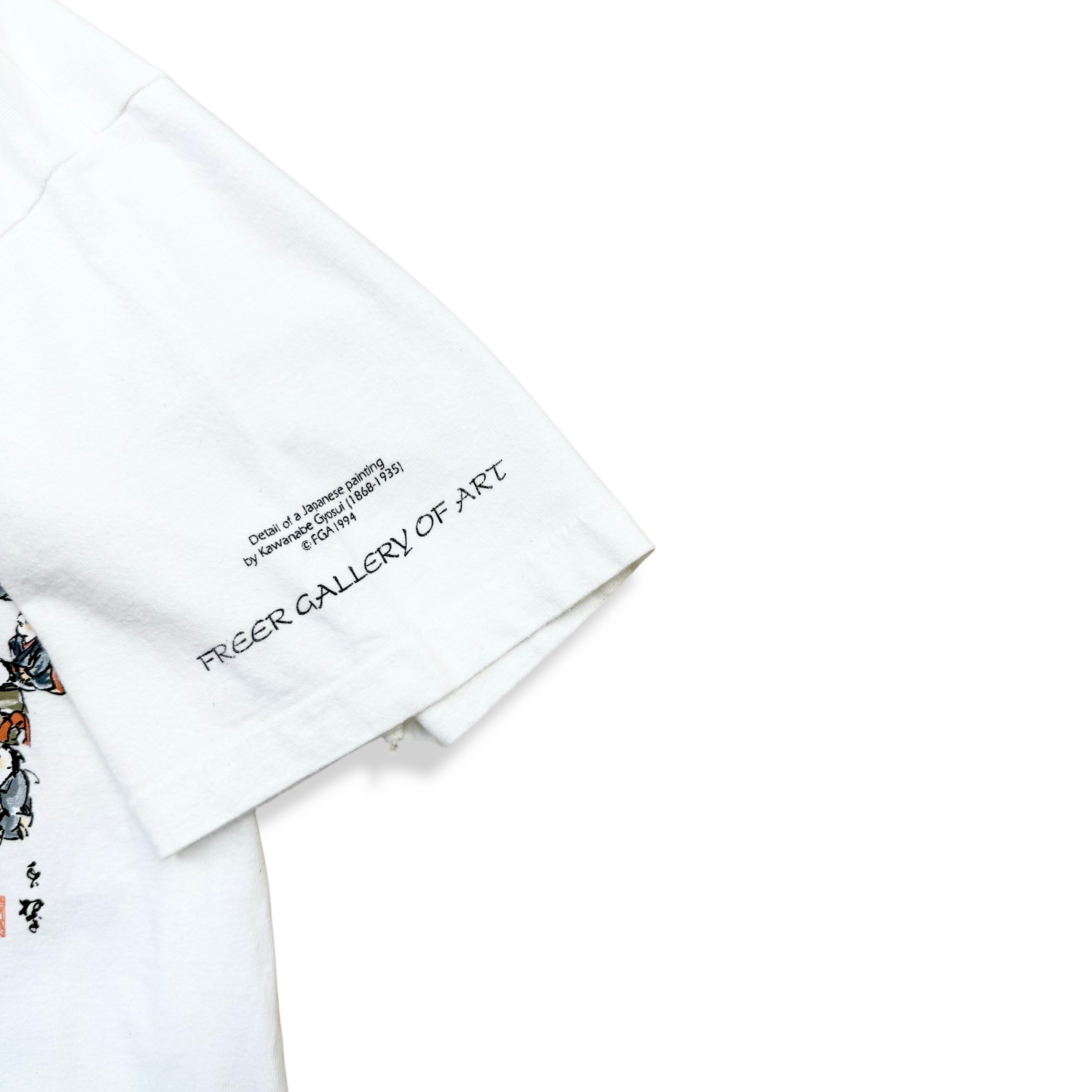 左袖には “Detail of a Japanese painting by Kawanabe Gyosui (1868–1935) ©FGA 1994” のコピーが入り、ワシントンD.C.のスミソニアン傘下「FREER GALLERY OF ART(フリーア美術館)」によって1994年に製作されたオフィシャルなアートTシャツであることがわかります(タグは欠損していますが、袖のプリントより1994年製と判断できます)。