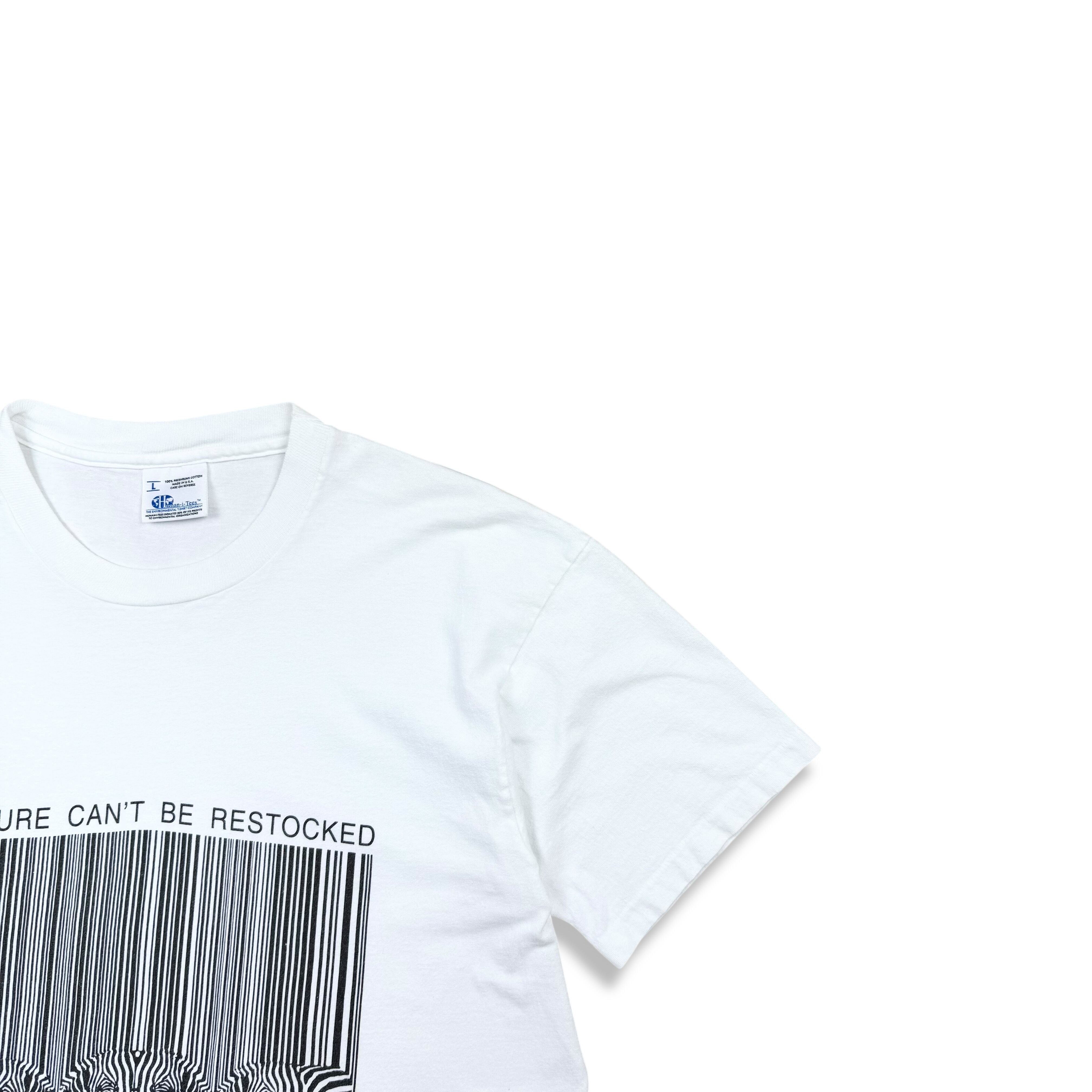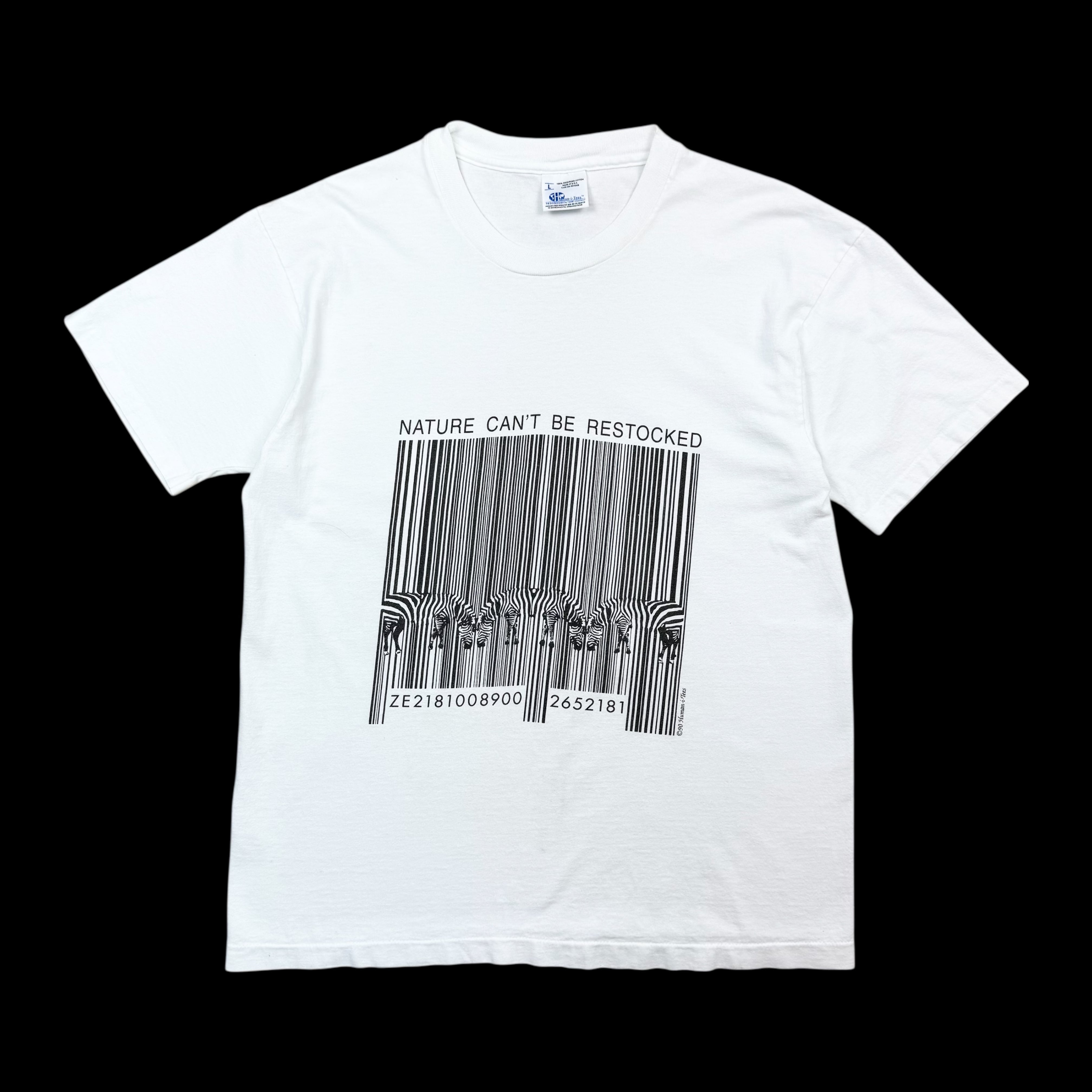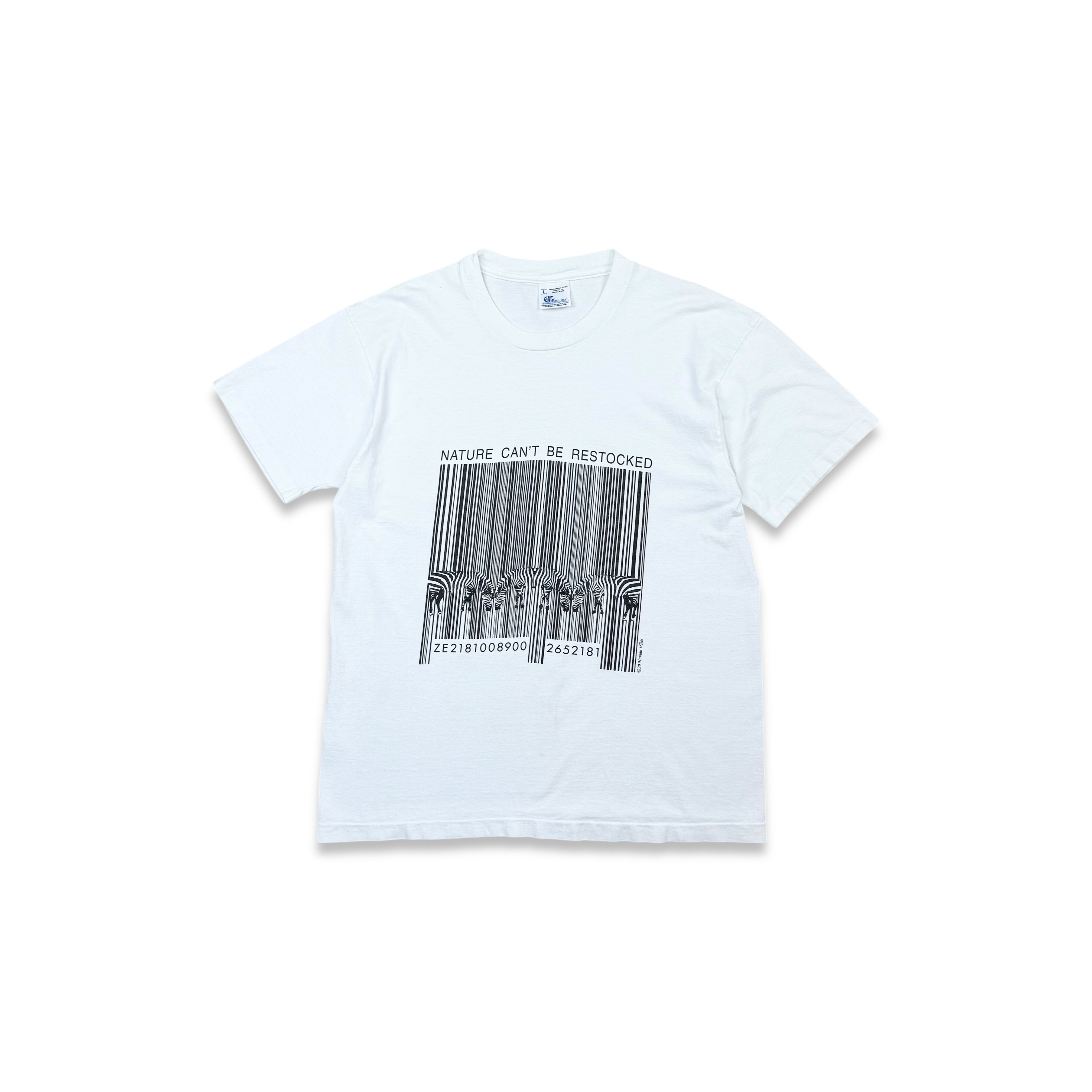 「NATURE CAN’T BE RESTOCKED(自然は再入荷できない)」という鋭いコピーとともに、バーコードのラインに溶け込むように描かれたシマウマの群れ。自然の美しさとその喪失に対する警鐘を、強烈なビジュアルで訴えかける、コンセプチュアルなグラフィックTシャツです。
