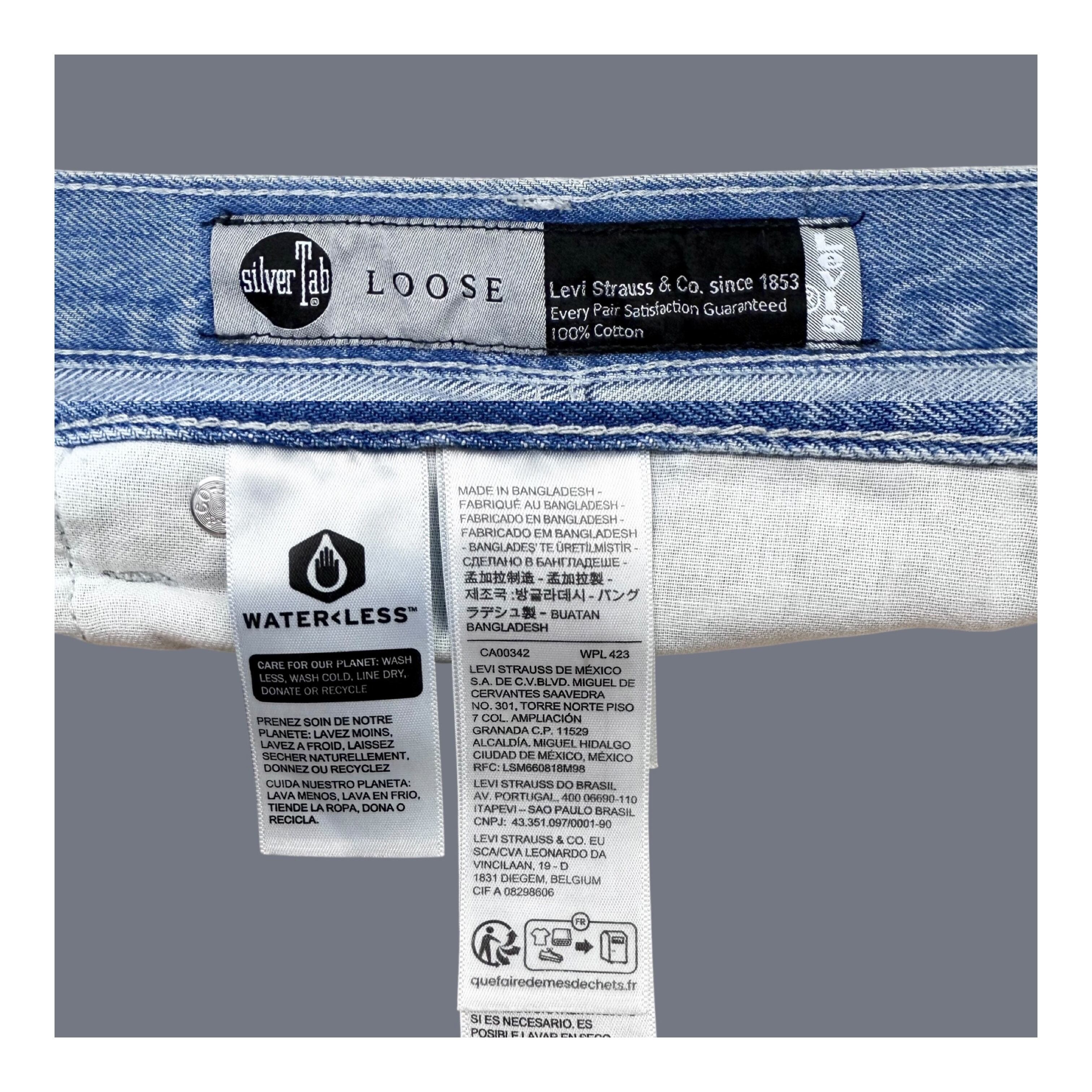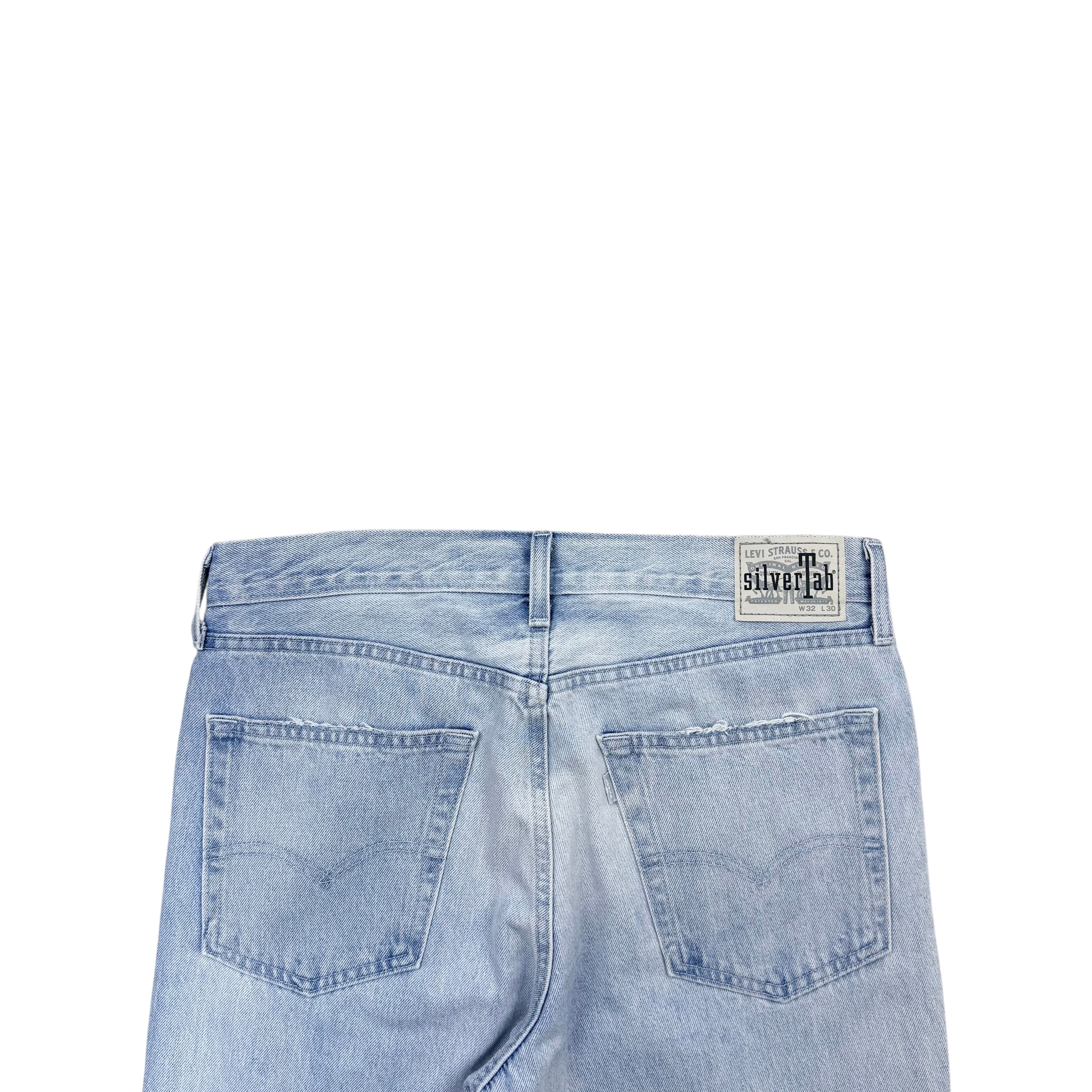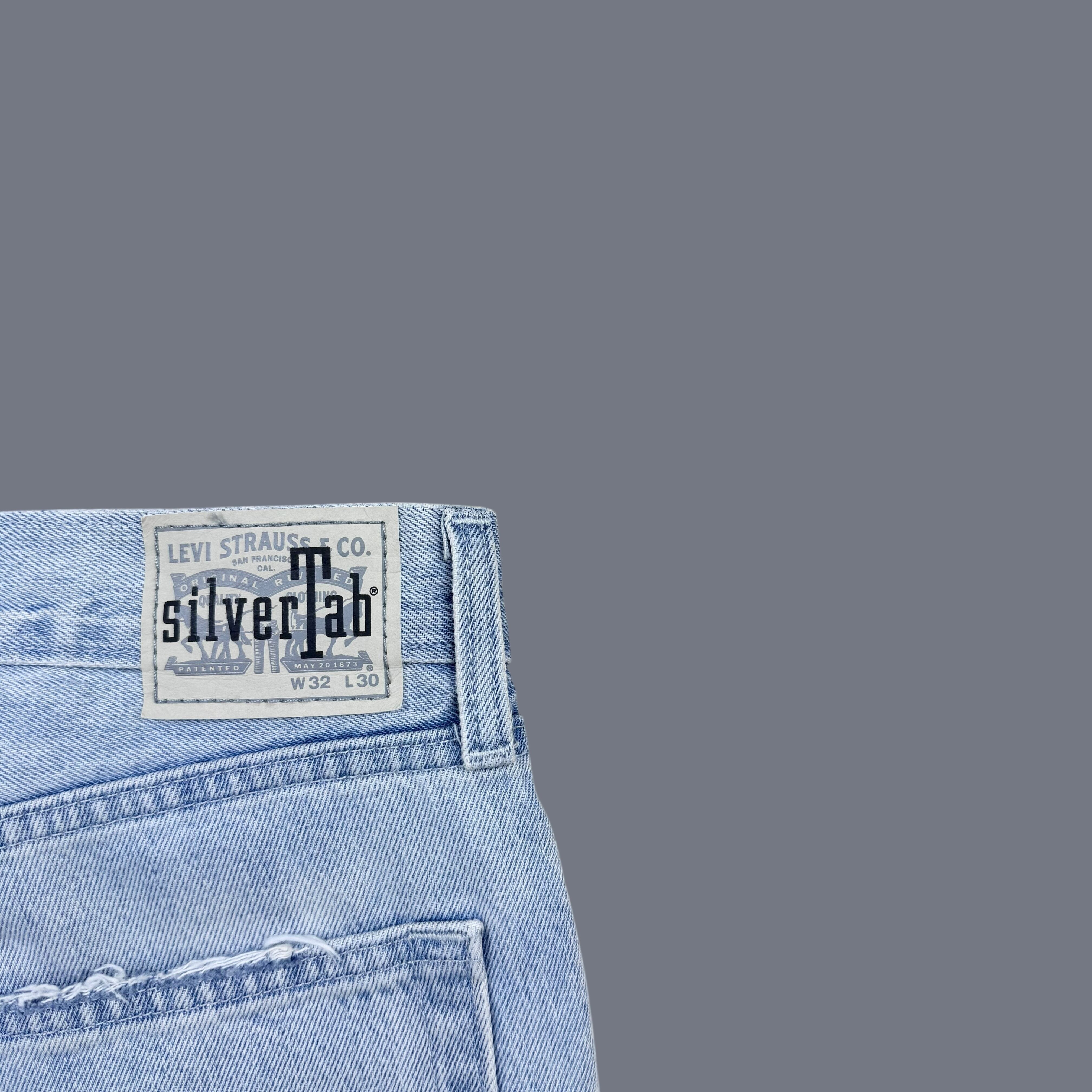 シルエットはシルバータブを象徴するルーズフィットで、腰回りから裾までゆとりを持たせたストレートライン。90年代のストリートやスケートカルチャーを思わせる仕上がりです。フロントはジップフライ仕様で、サイズはW32 L30のゴールデンサイズ。