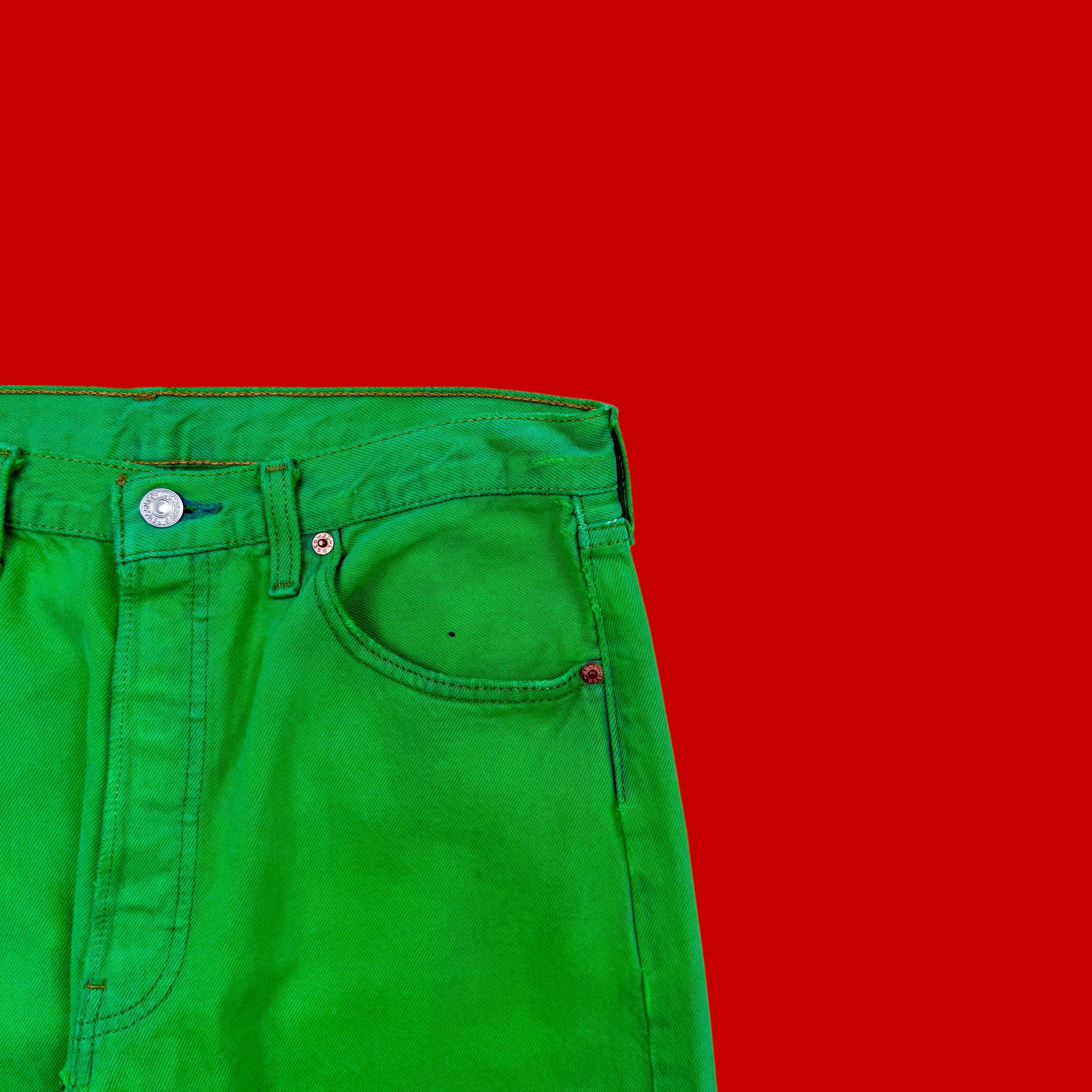 ライムグリーンの501は出回りが少なく、 90年代当時のストリートやスケートカルチャーともリンク。差し色としてコーディネートに取り入れるだけで強い存在感を放つカラーデニムです。