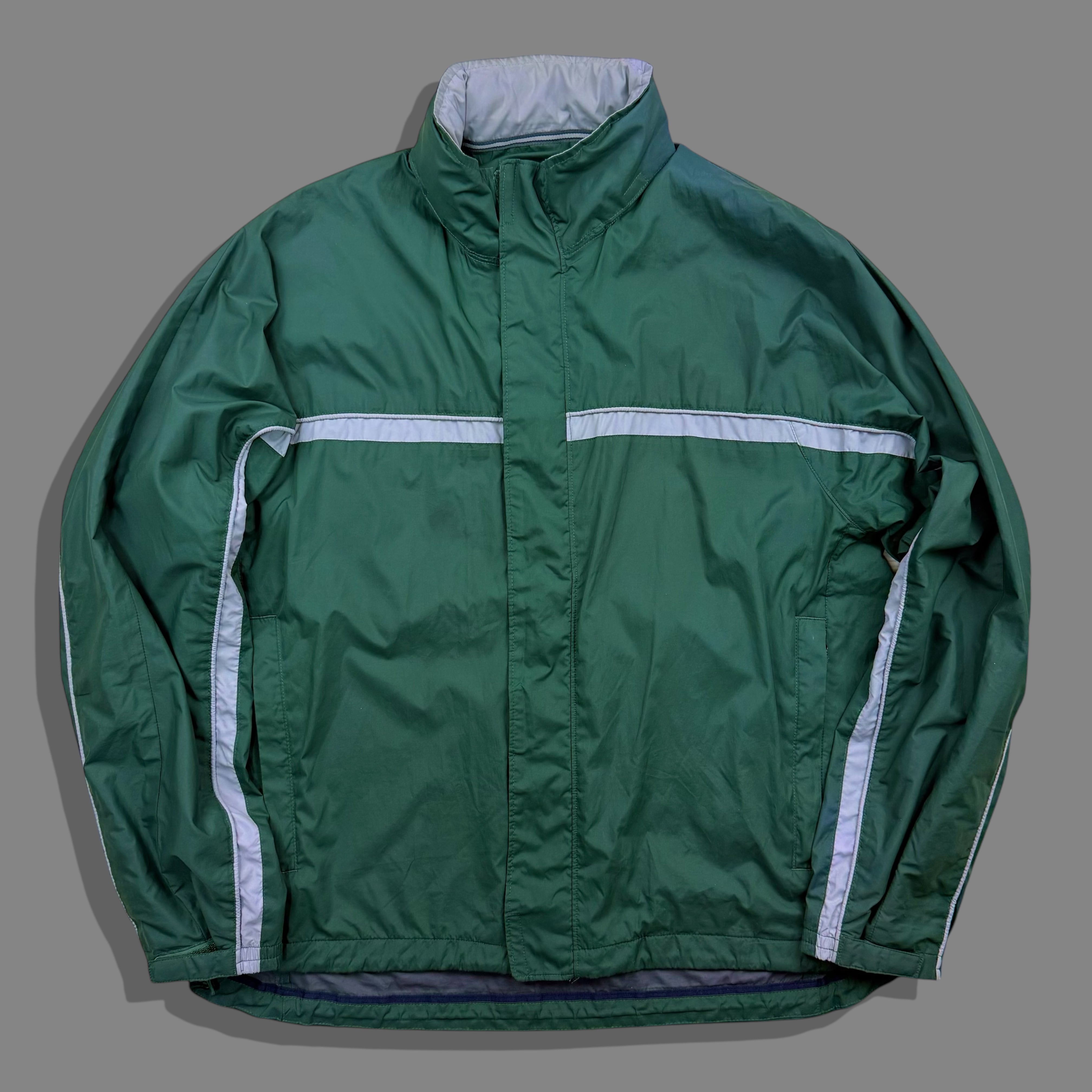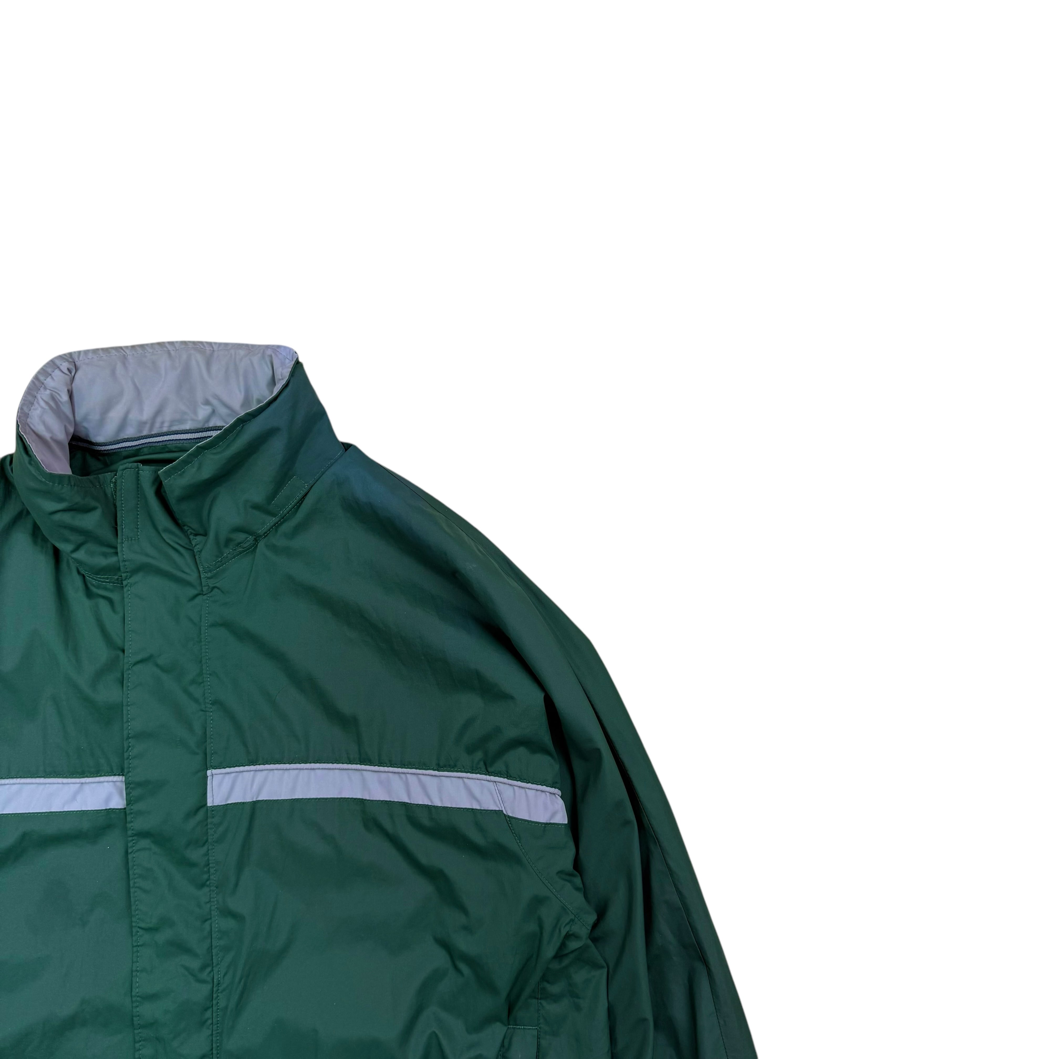 フォレストグリーンとグレーのツートンカラーが印象的な、オールドギャップらしいスポーティーなジャケット。深みのあるフォレストグリーンに直線的なグレーパネルを切り替えたデザインは、シンプルながら存在感があり、Y2Kのアウトドアやストリートの空気を感じさせます。