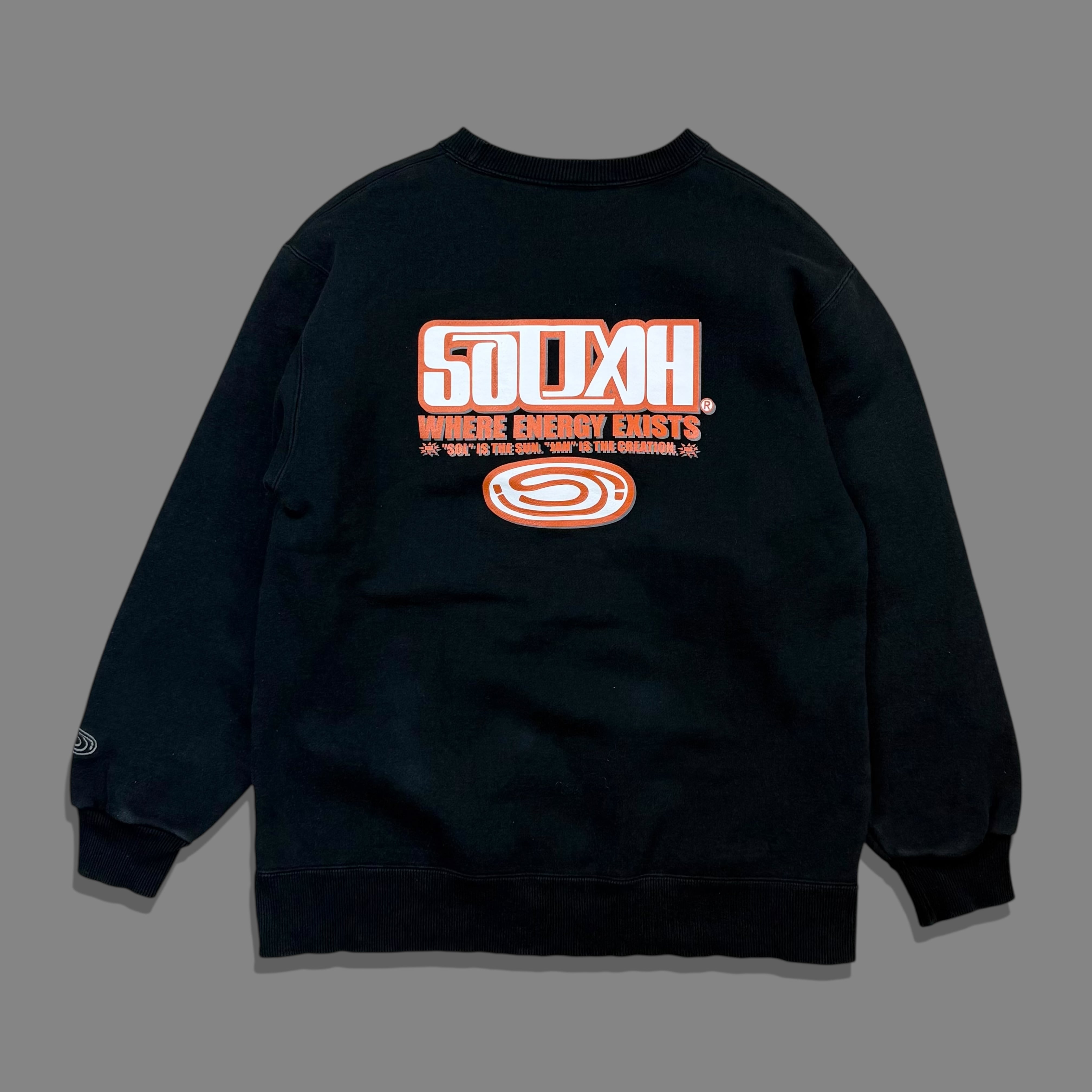 2000年代、ハワイ発のブランド SOLJAH(ソルジャー) のクルーネックスウェット。フロントとバックに大きく「SOLJAH」ロゴとメッセージがプリントされた存在感ある一枚です。袖口にはブランドアイコンのワンポイント刺繍入り。