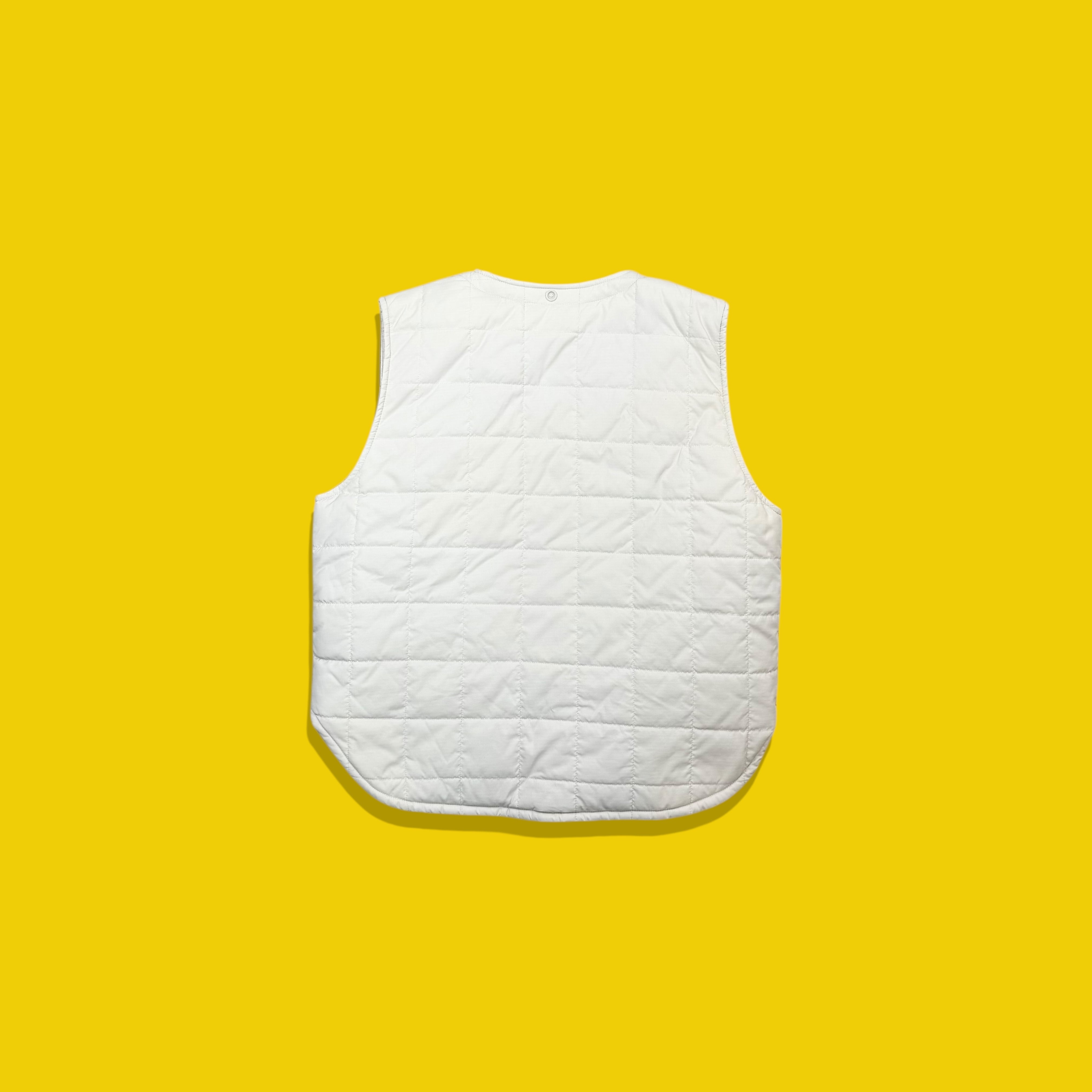 チャコールグレーのナイロンシェルに、内側はアイボリーのキルティングベストを組み合わせた2in1仕様。ベスト単体はもちろん、ジャケット側にも中綿が入っており、ジャケットのみでも十分な保温性を備えています。