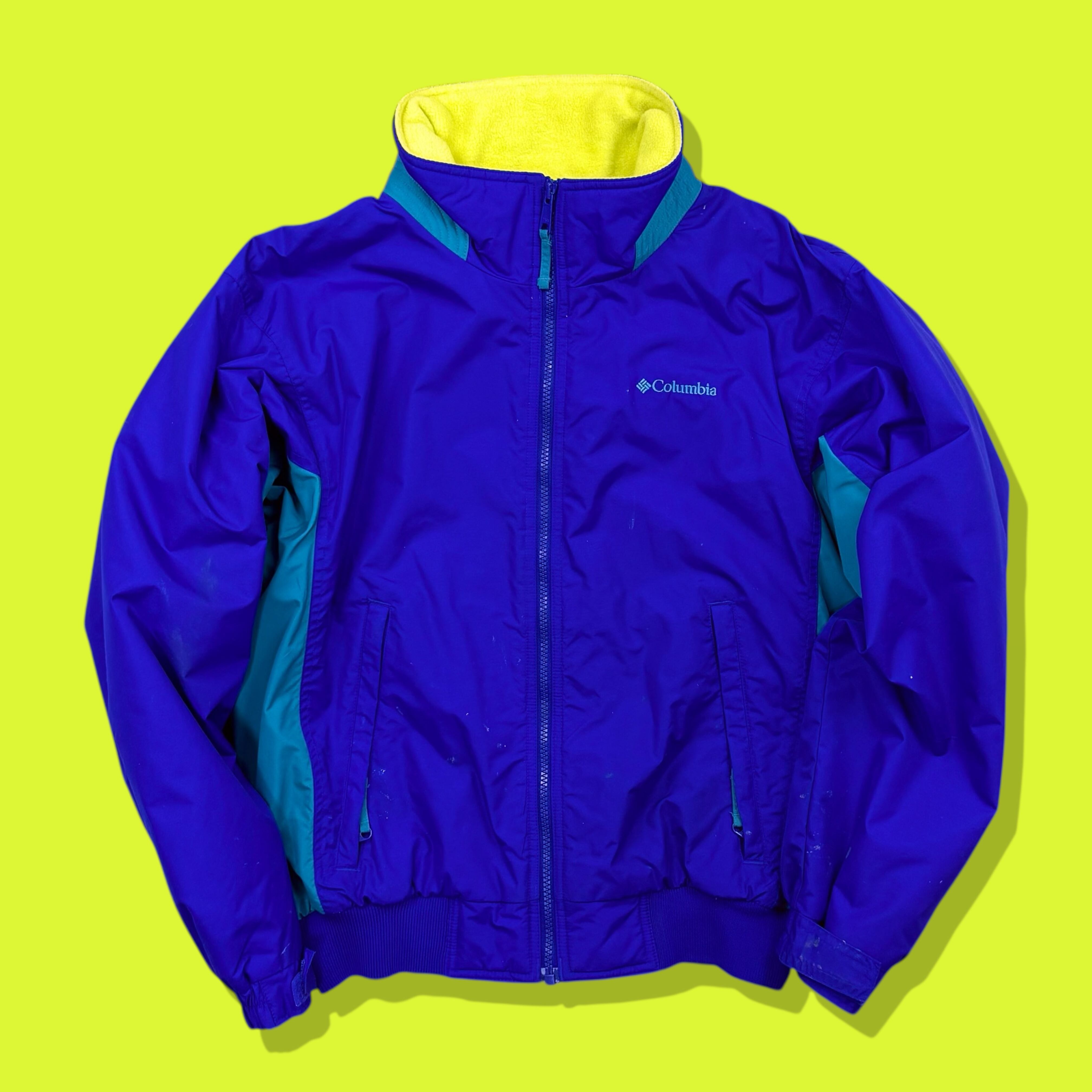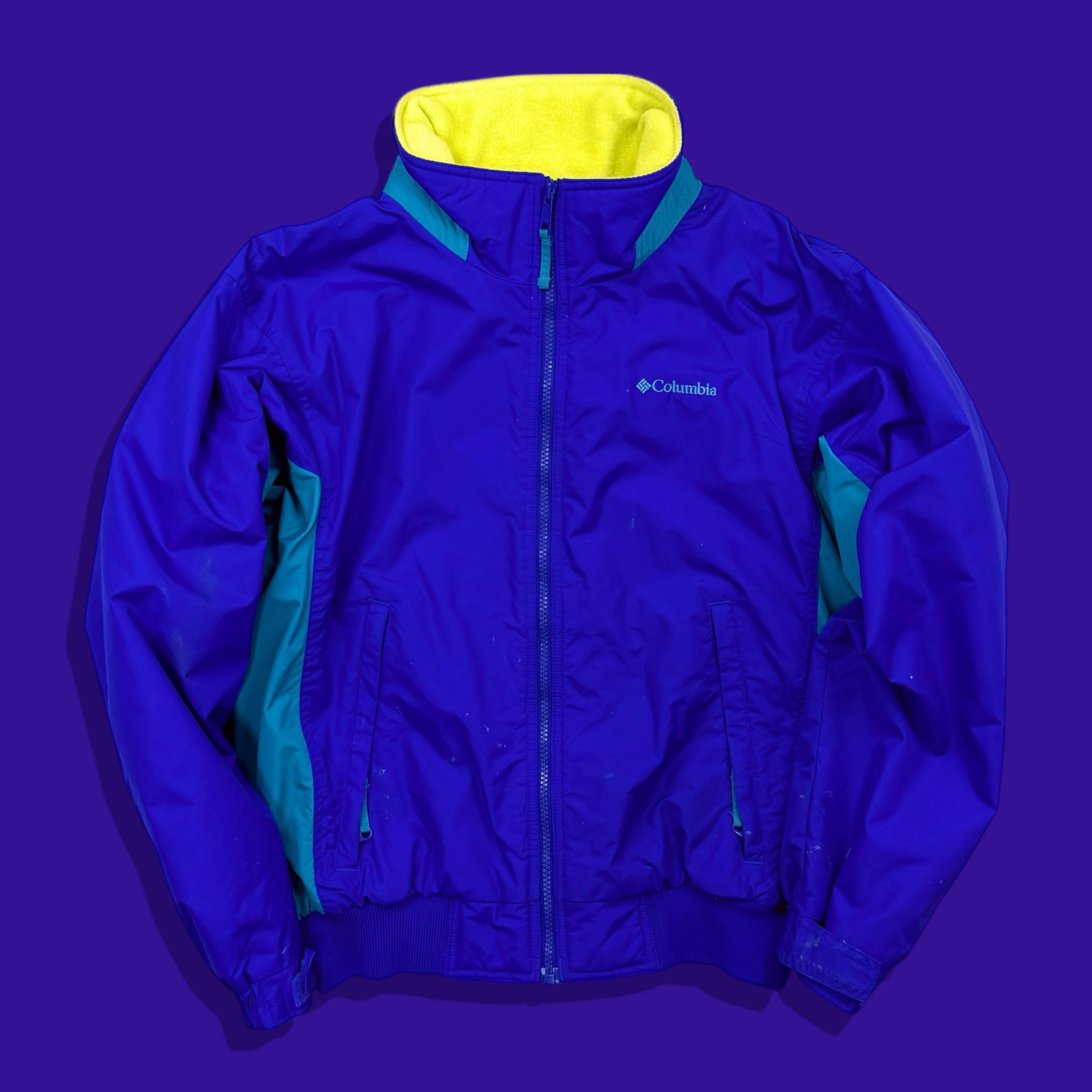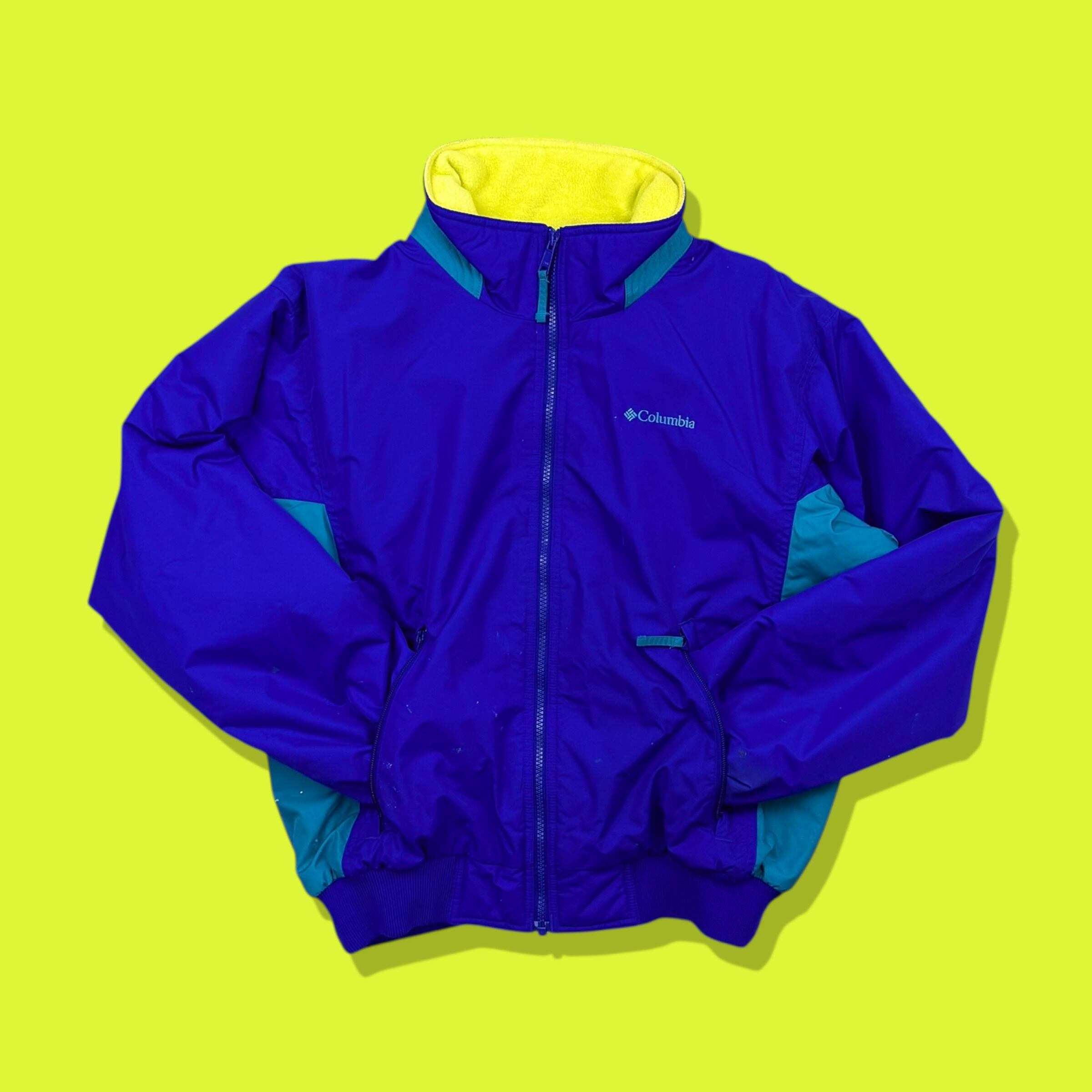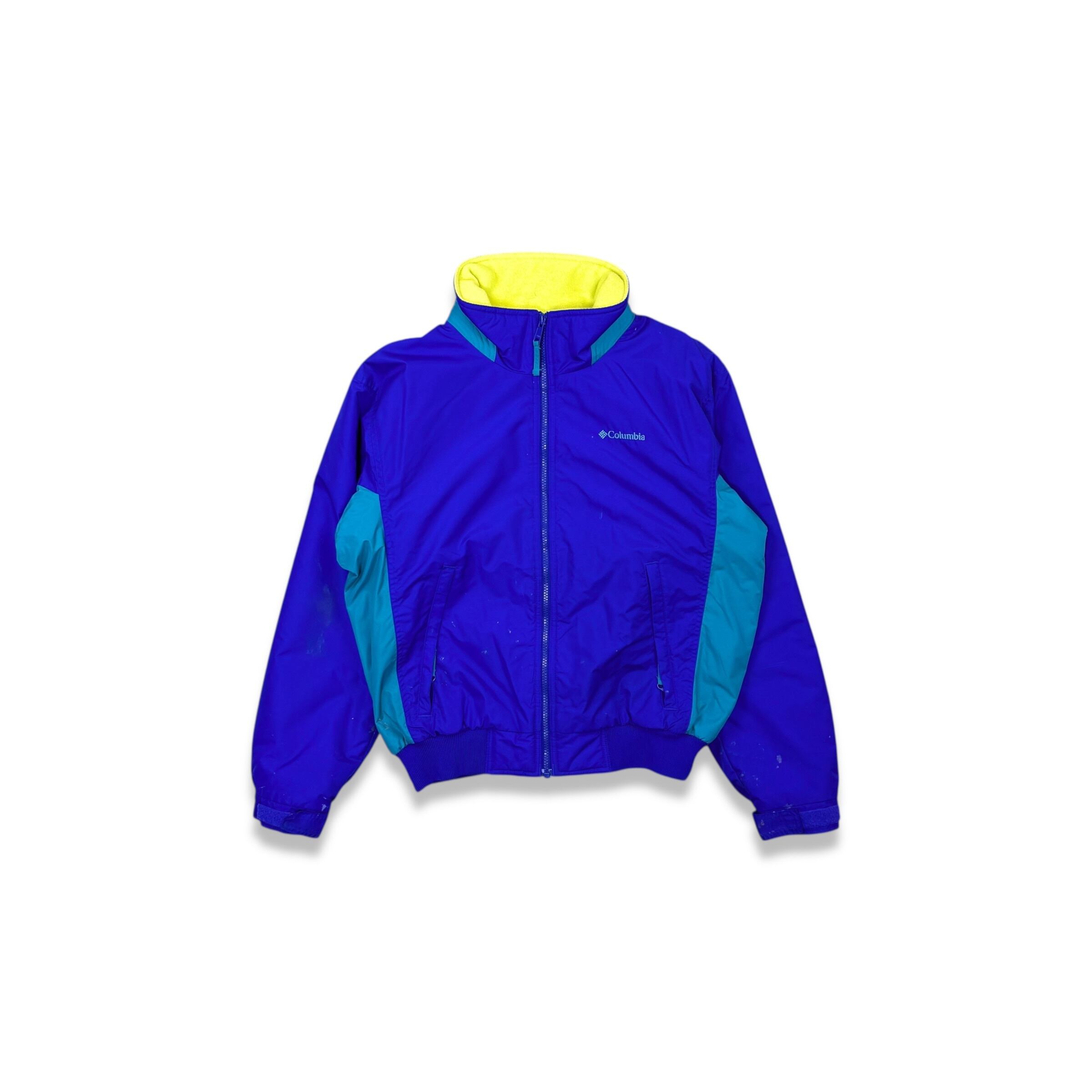 2000年代らしい鮮やかな切り替え配色が目を引くコロンビアのフリースライニングナイロンジャケット。パープルをベースにターコイズを組み合わせたクラシックなアウトドアカラーと、内側のネオンイエローフリースが特徴の1着です。