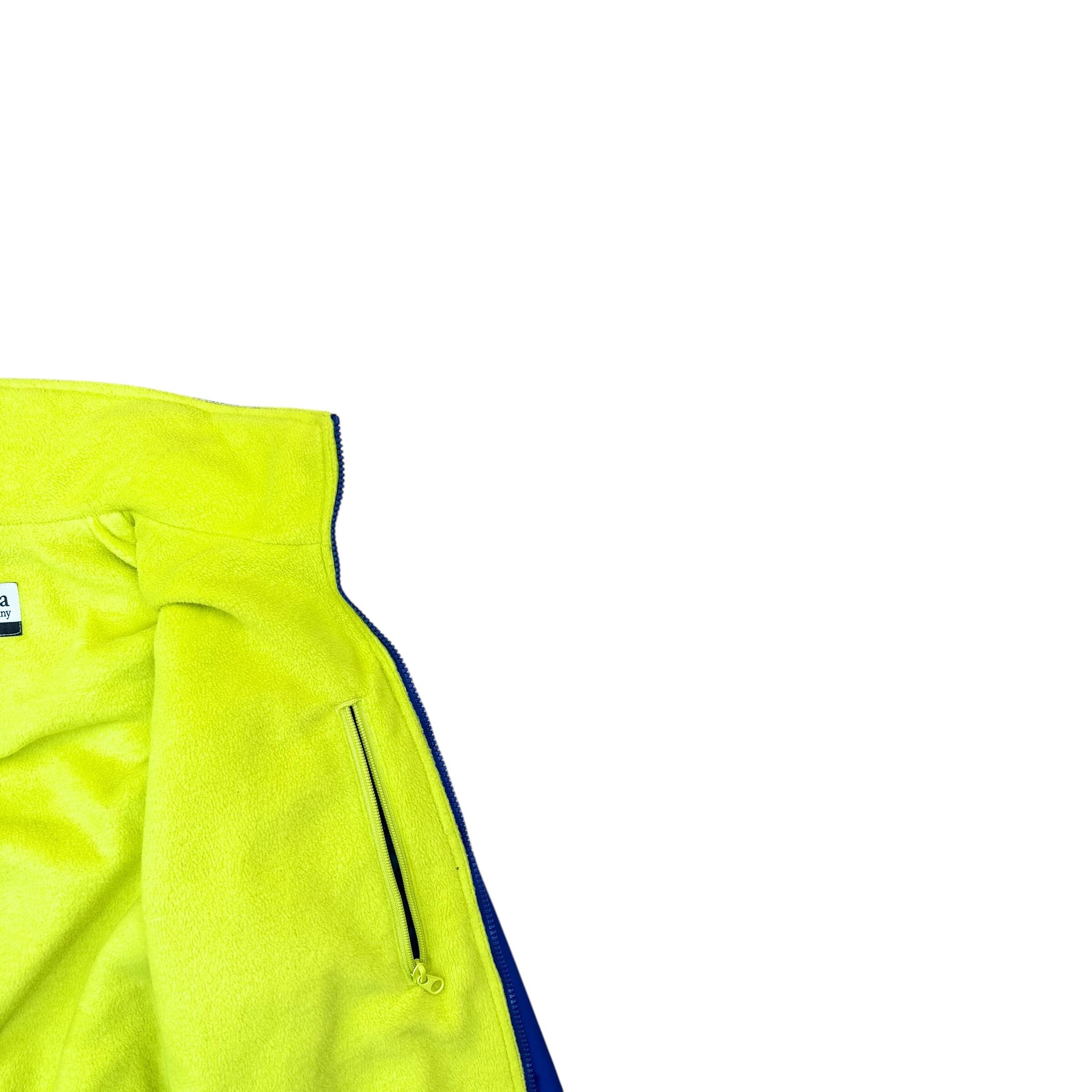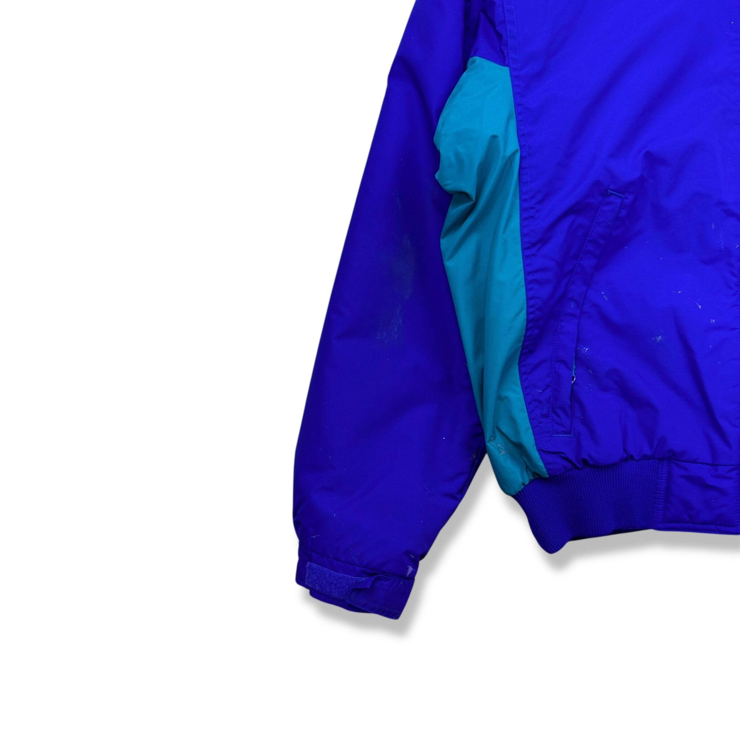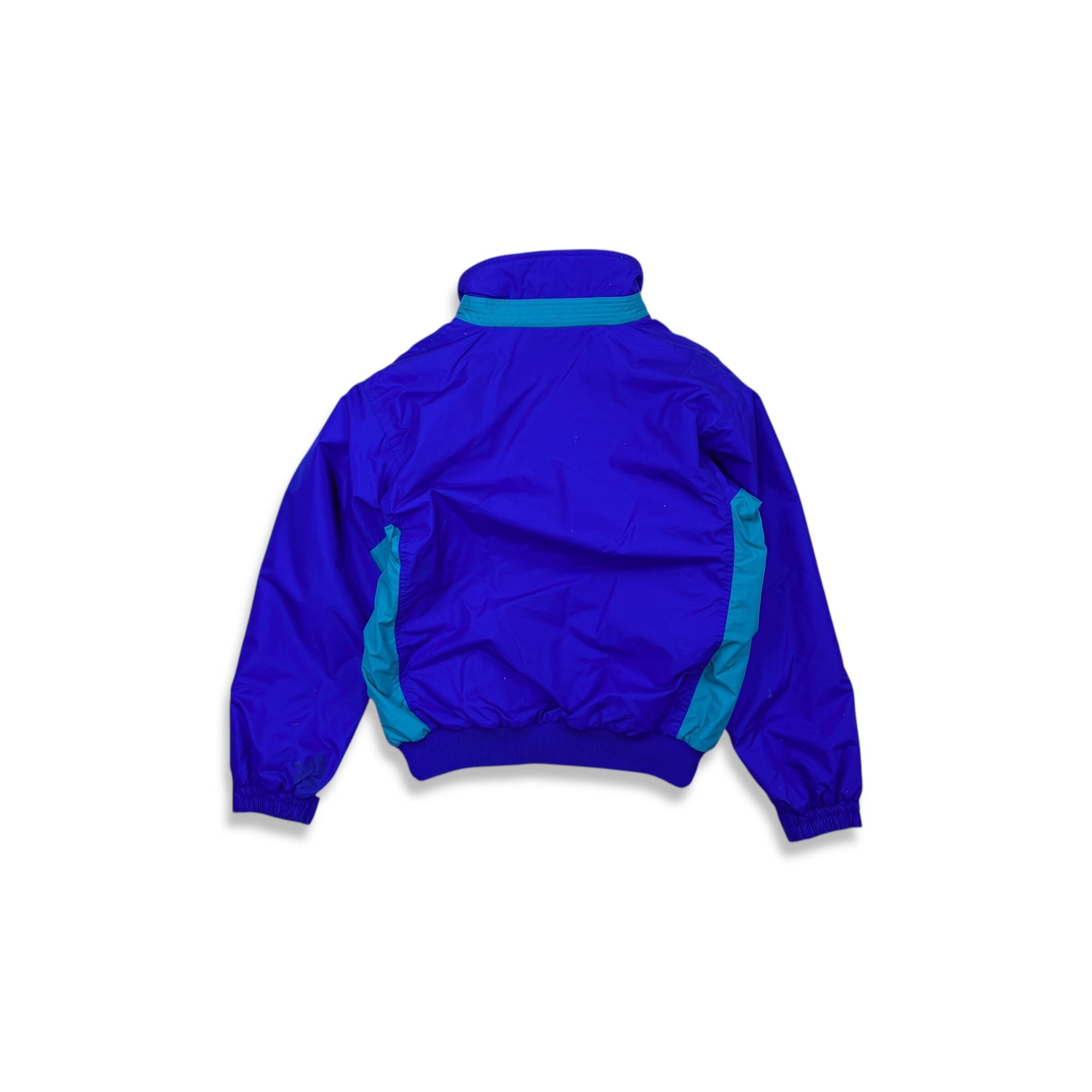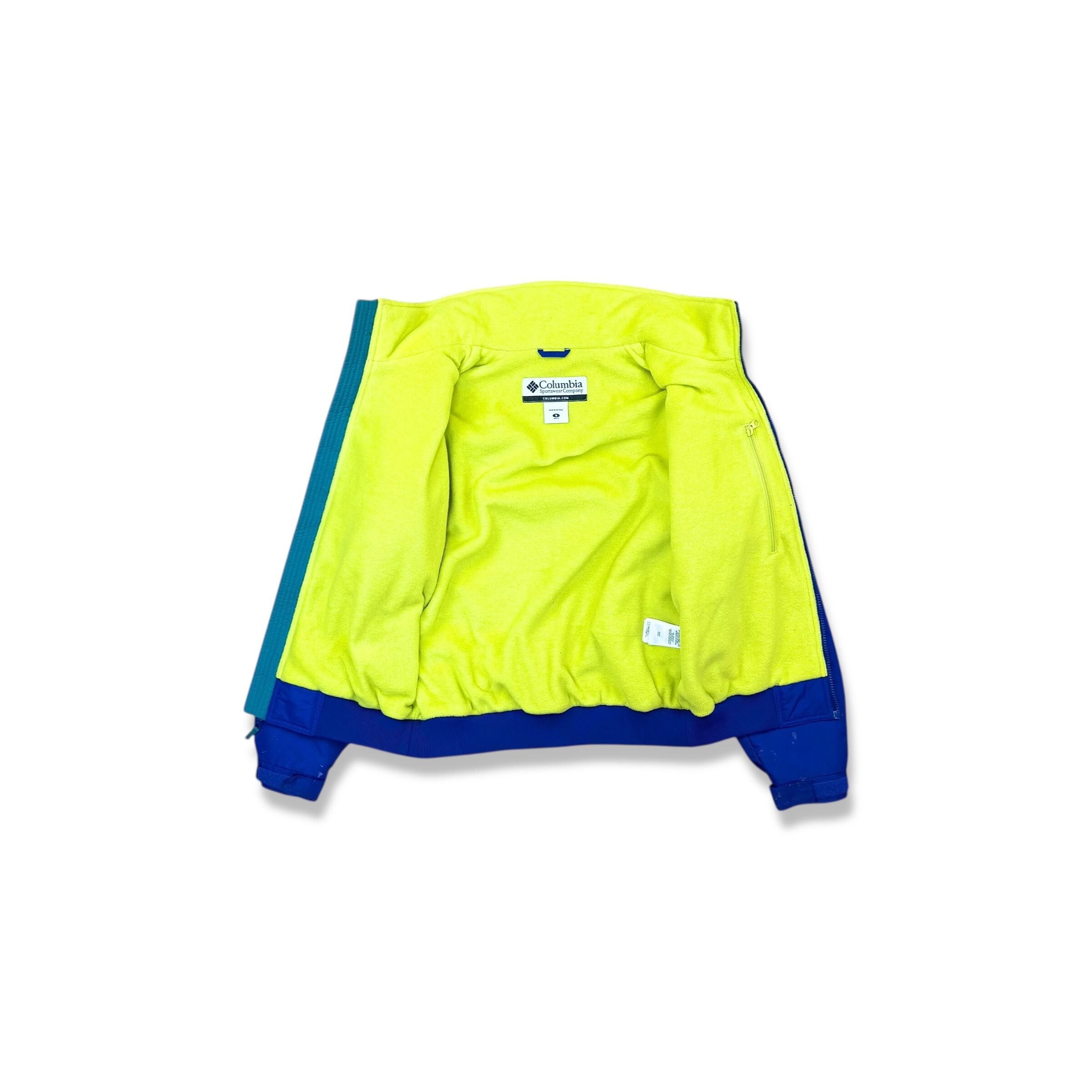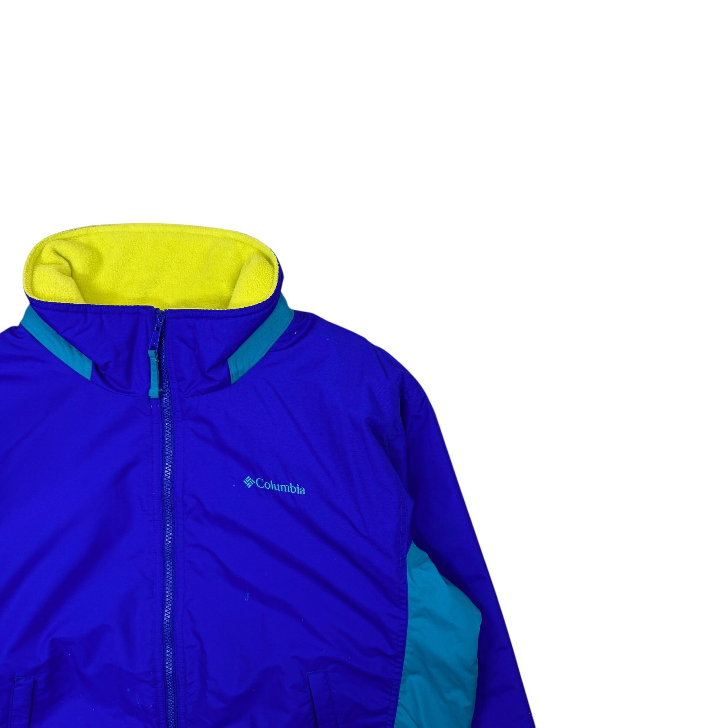 2000年代らしい鮮やかな切り替え配色が目を引くコロンビアのフリースライニングナイロンジャケット。パープルをベースにターコイズを組み合わせたクラシックなアウトドアカラーと、内側のネオンイエローフリースが特徴の1着です。