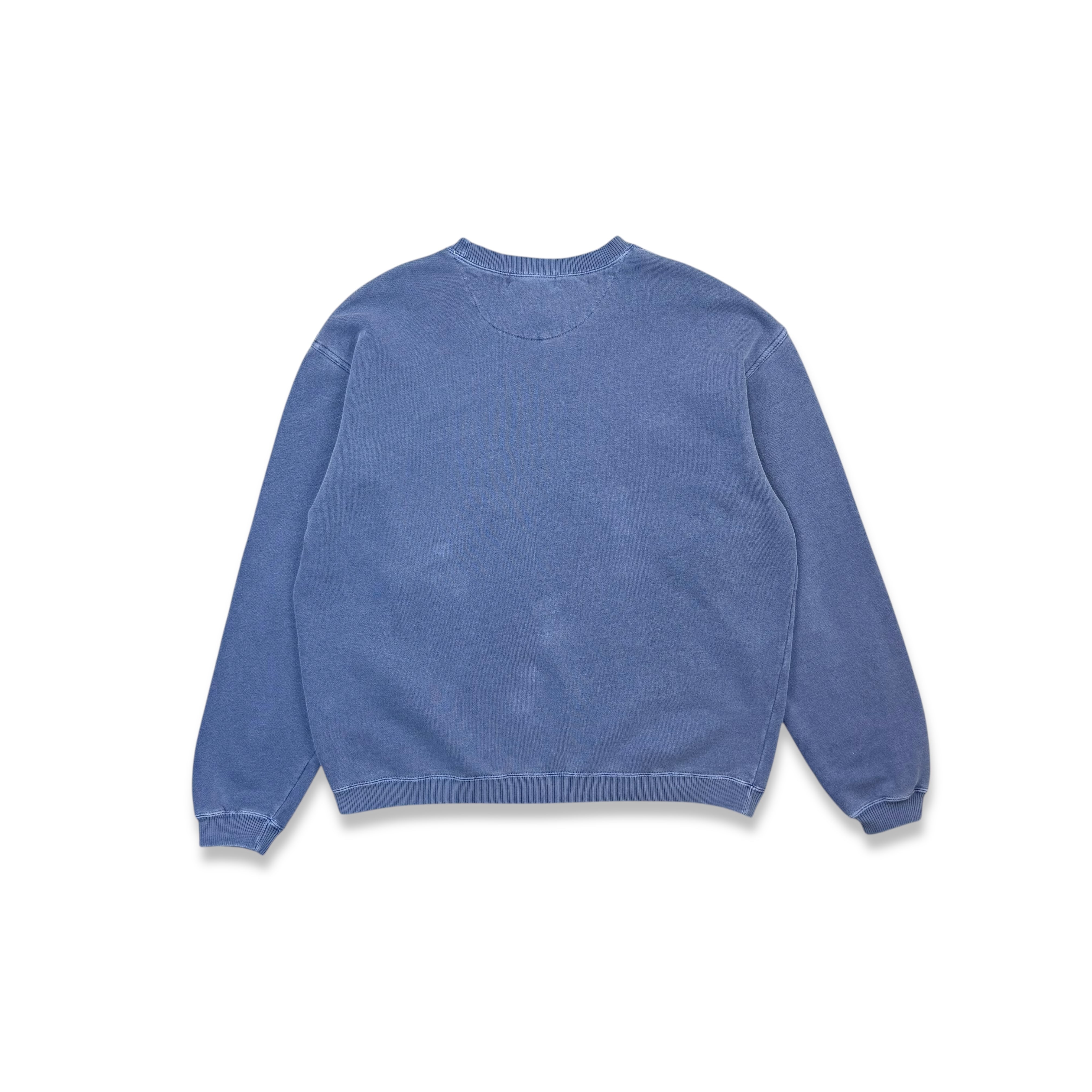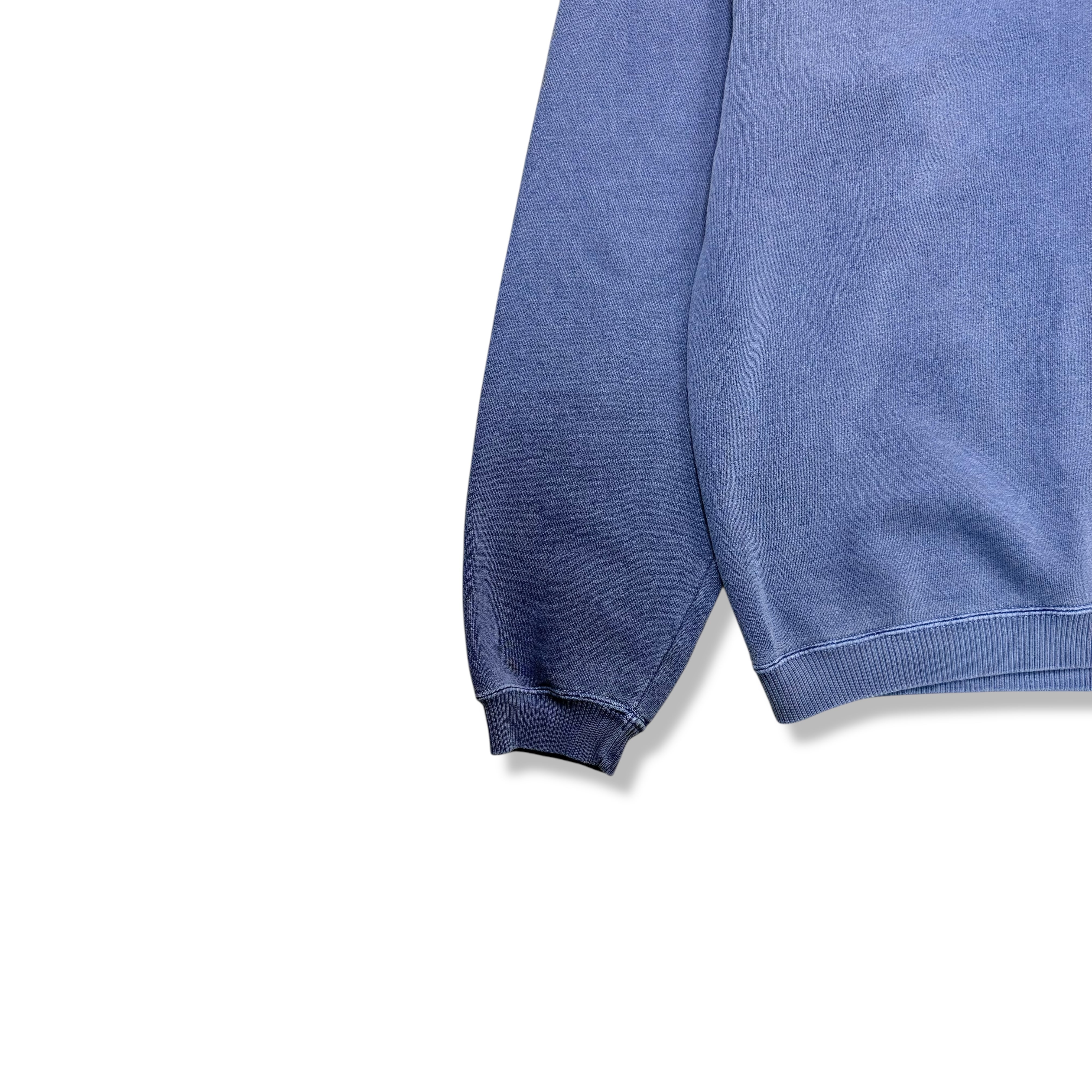 ネックは程よく詰まったクルーネック仕様。肩は自然に落ち、身幅にもゆとりを持たせたリラックスしたシルエットで、2000年代らしい力の抜けたバランス。袖口・裾のリブもしっかりしており、デイリーユースにも向いた安定感のある作りです。