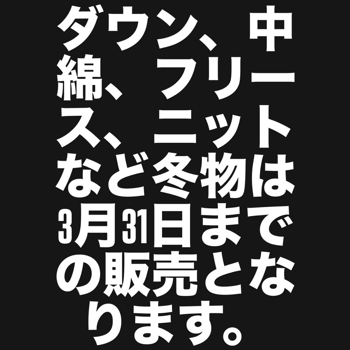 ダウン、中綿、フリース、ニットなど冬物は3月31日までの販売となります。