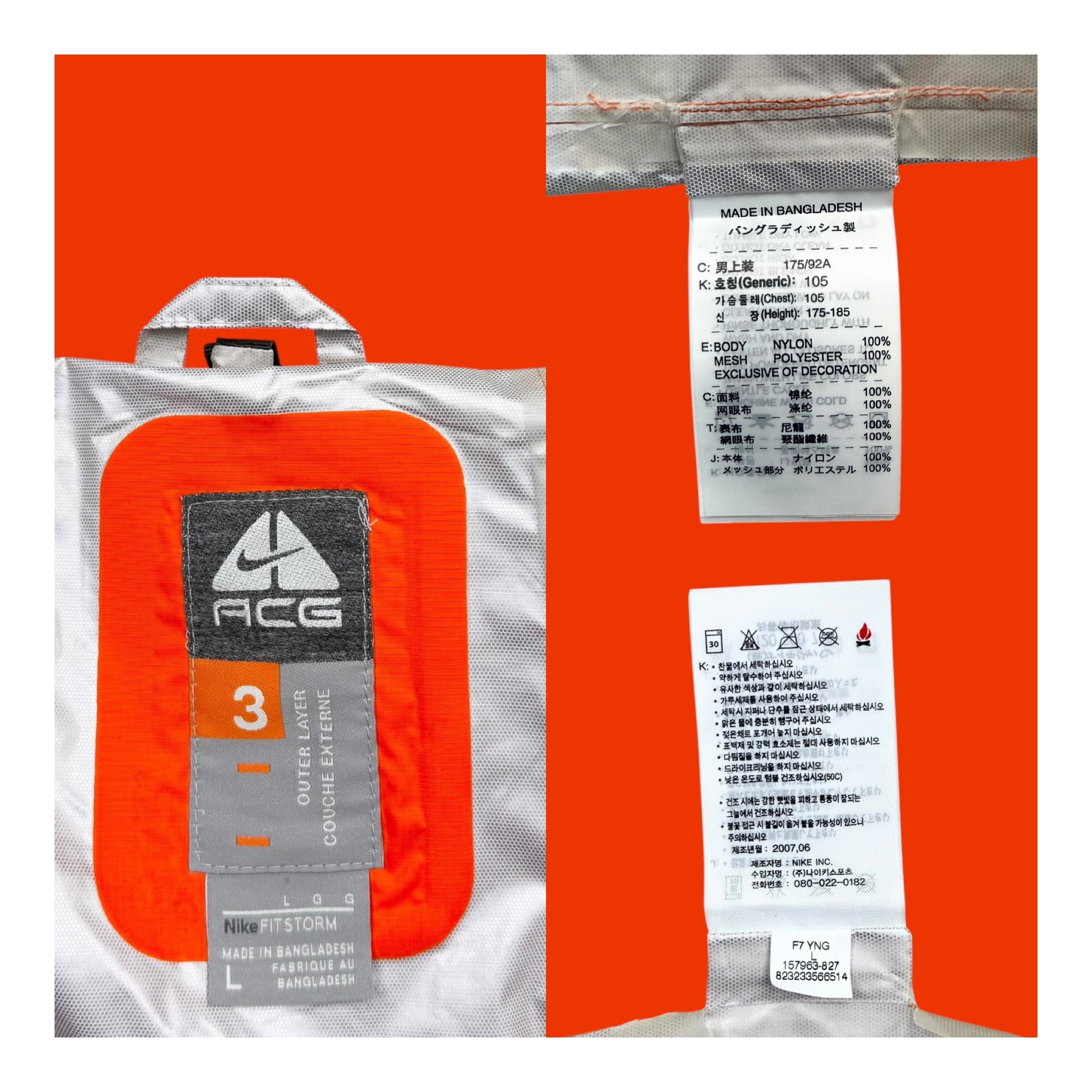 タグにはOUTER LAYER 3の表記が入り、アウターレイヤーとして設計されたモデルです。機能表記として記載されているNIKE FIT STORMは、防風性や悪天候下での使用を想定したシリーズであることを示しています。