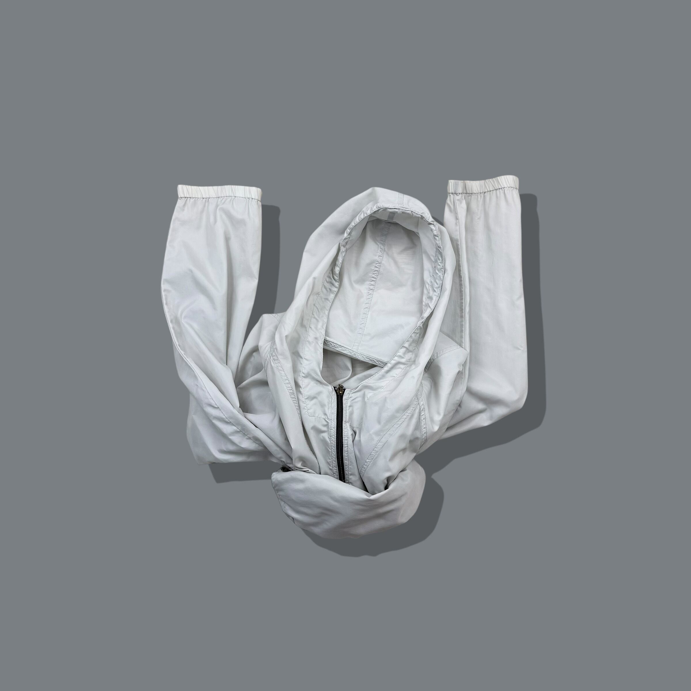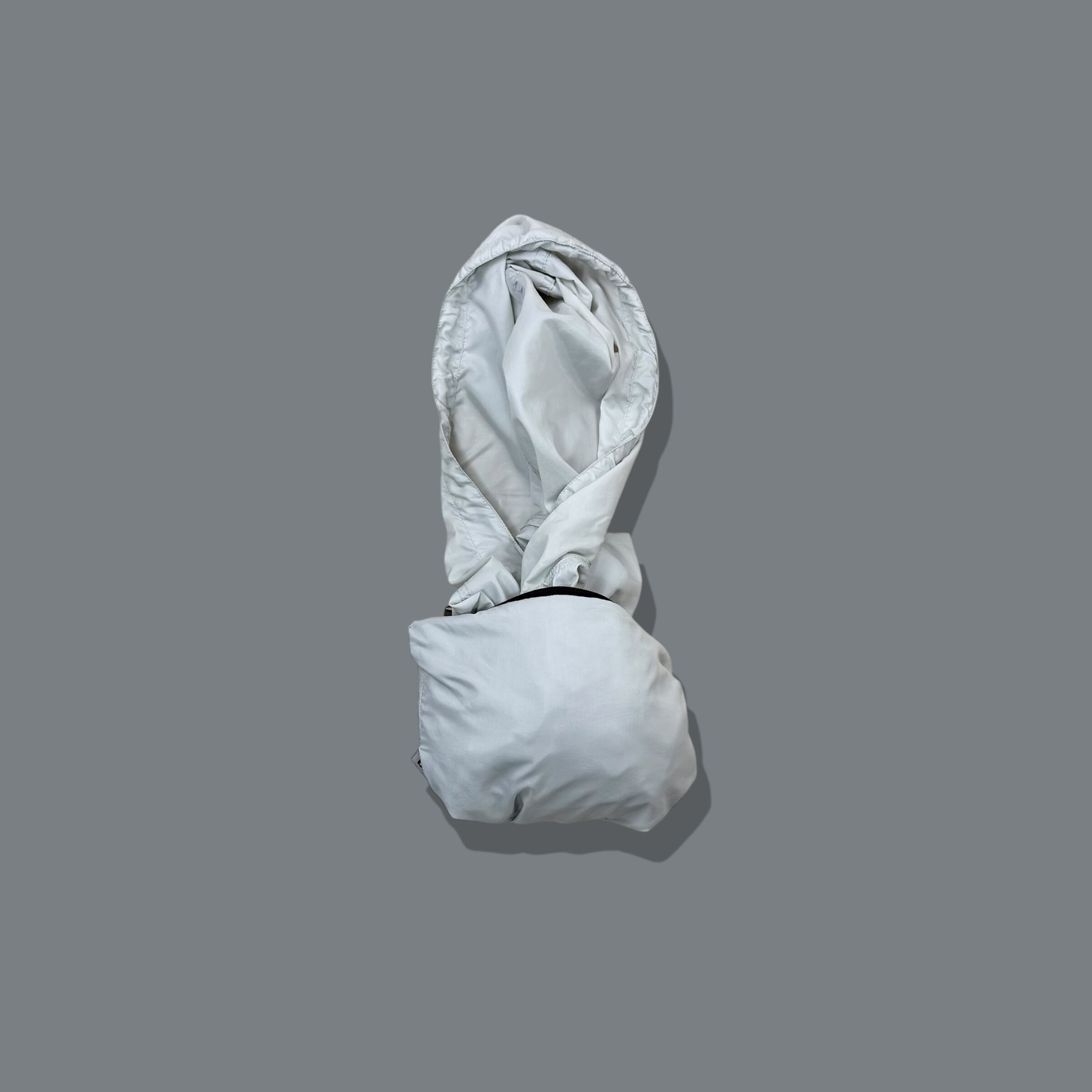 淡いアイスグレーの薄手ナイロンで、やや透け感のある軽い生地で、空気を含むような質感が特徴。