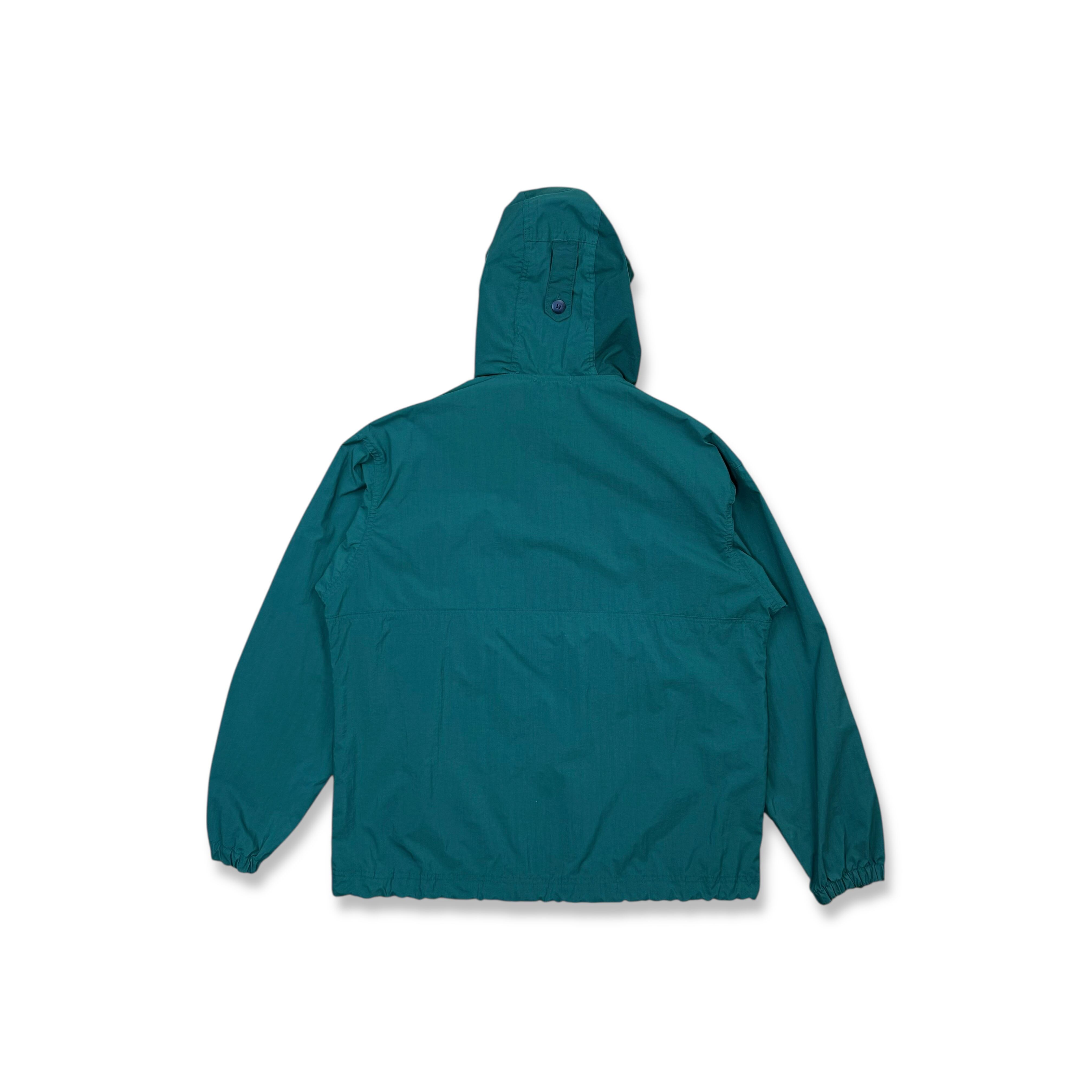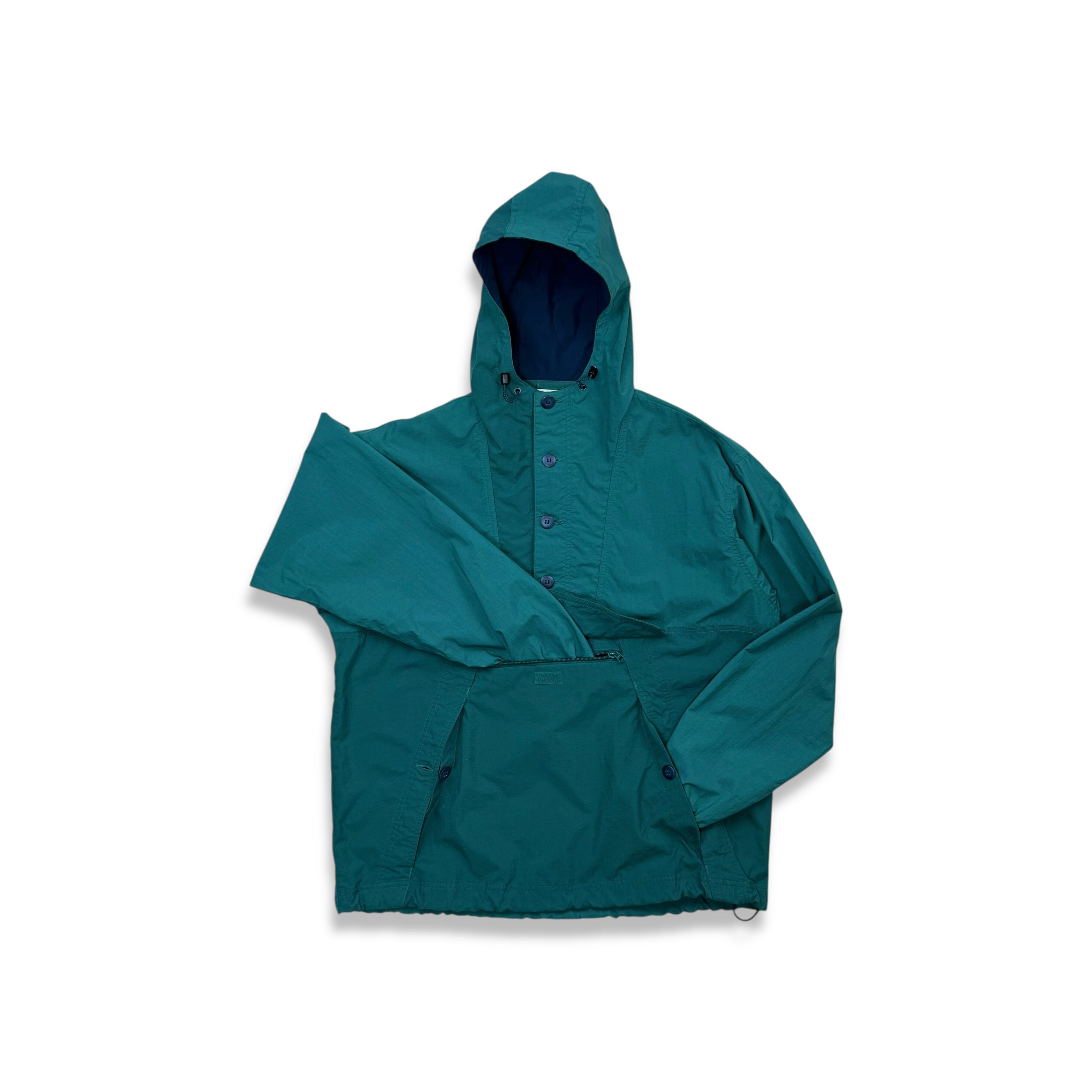 シャリ感のあるナイロンポプリン素材を使用した一重仕立てで、軽快かつドライな着用感が特徴。大ぶりなフードにプルオーバーでフロントボタン仕様、裾にはドローコードを備え、防風性とシルエット調整を両立しています。アノラックに求められる要素を過不足なく備えた、非常に完成度の高い構成です。