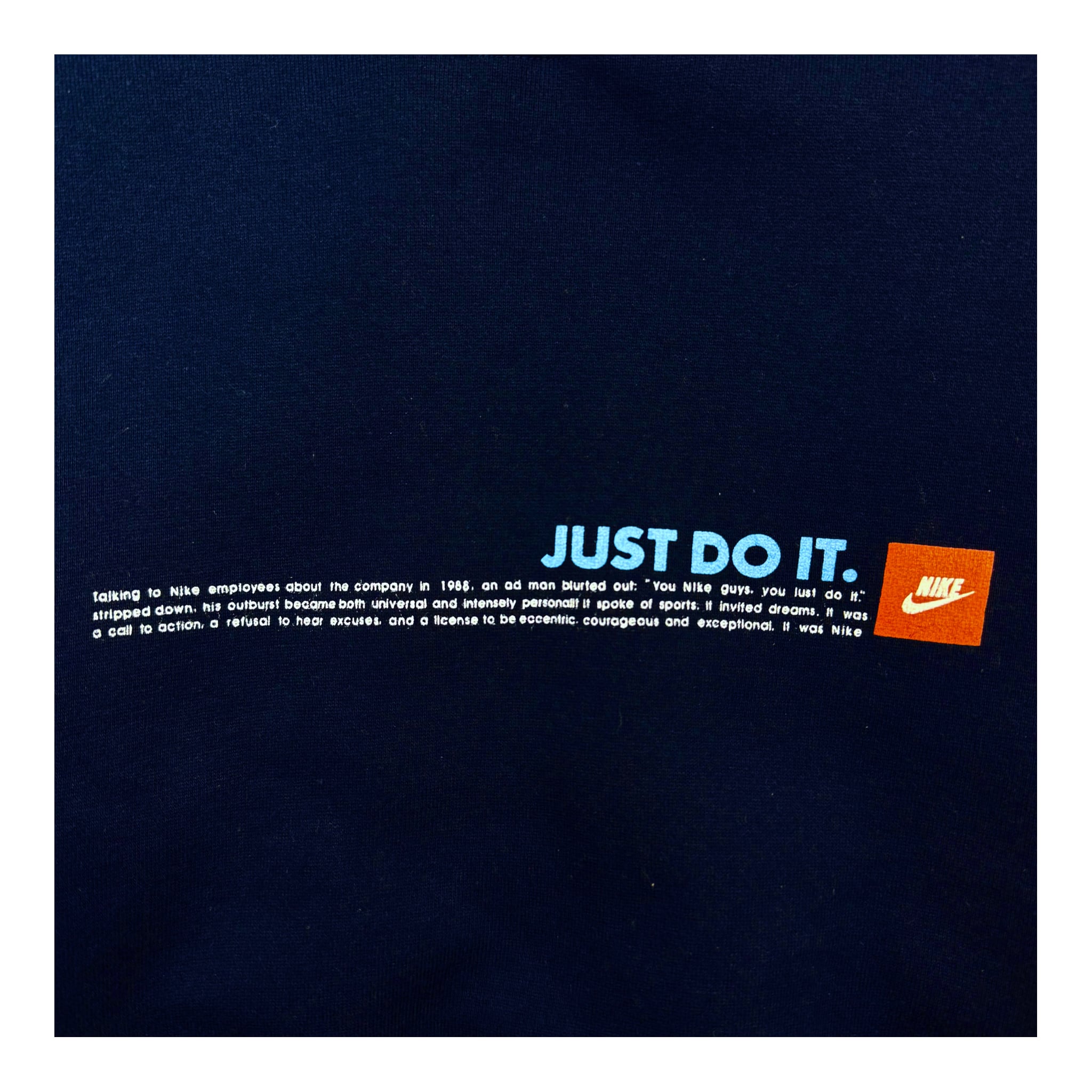 フロントには、ブランドを象徴するスローガンのジャストドゥーイットと、その誕生背景をモチーフにした英文テキストをプリント。