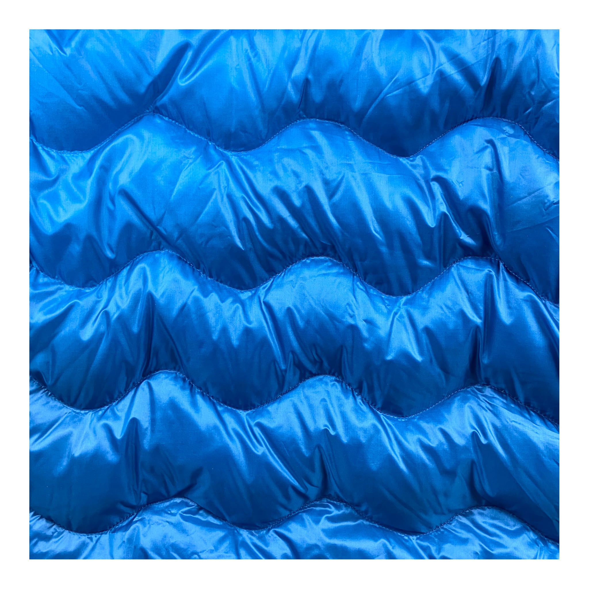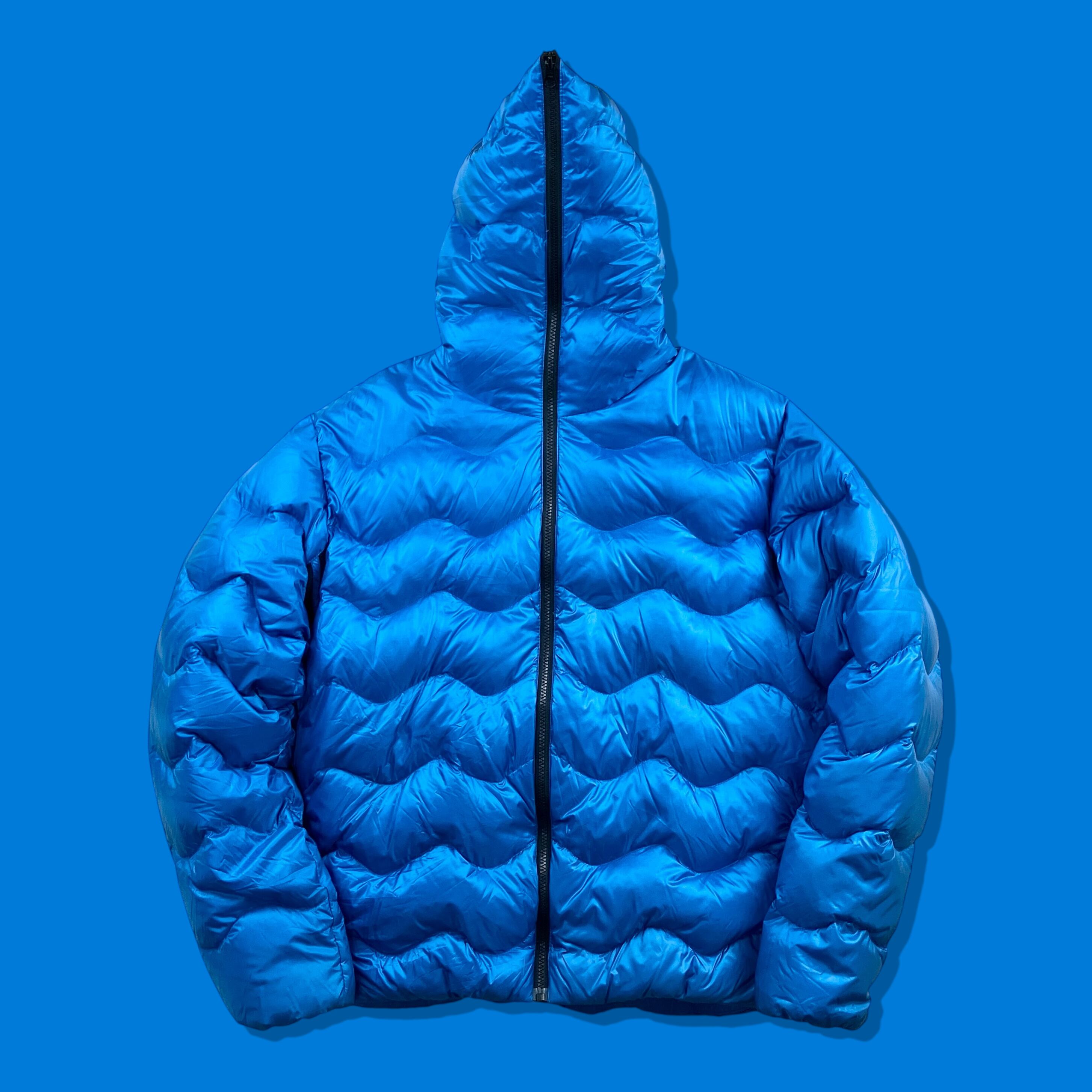 光沢感のあるメタリックブルーのナイロンシェルに、波打つようなウェーブ状キルティングを組み合わせた存在感のあるデザインです。