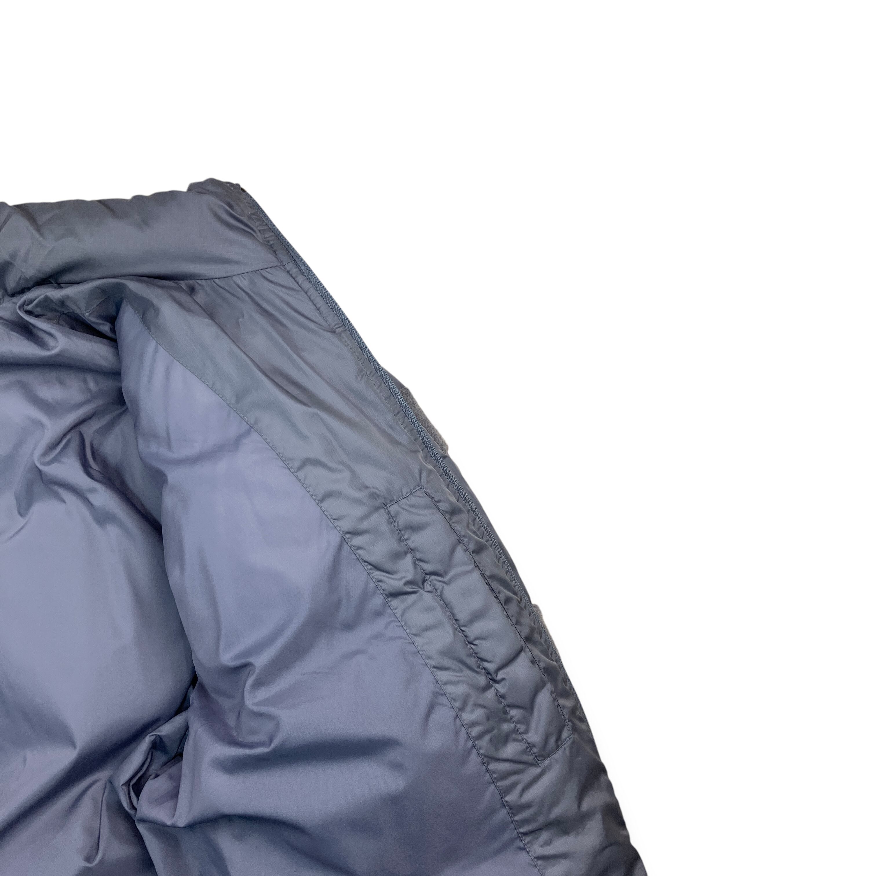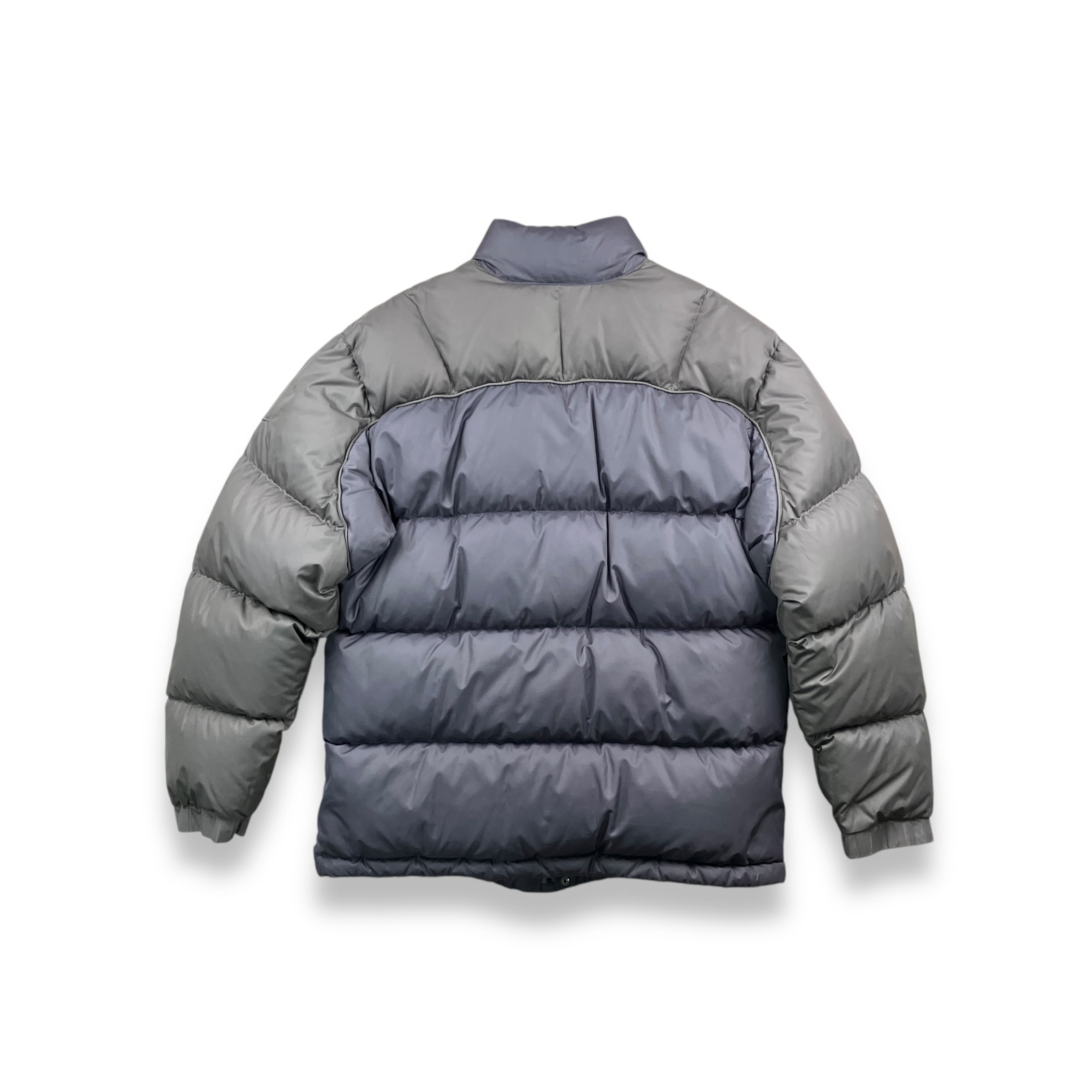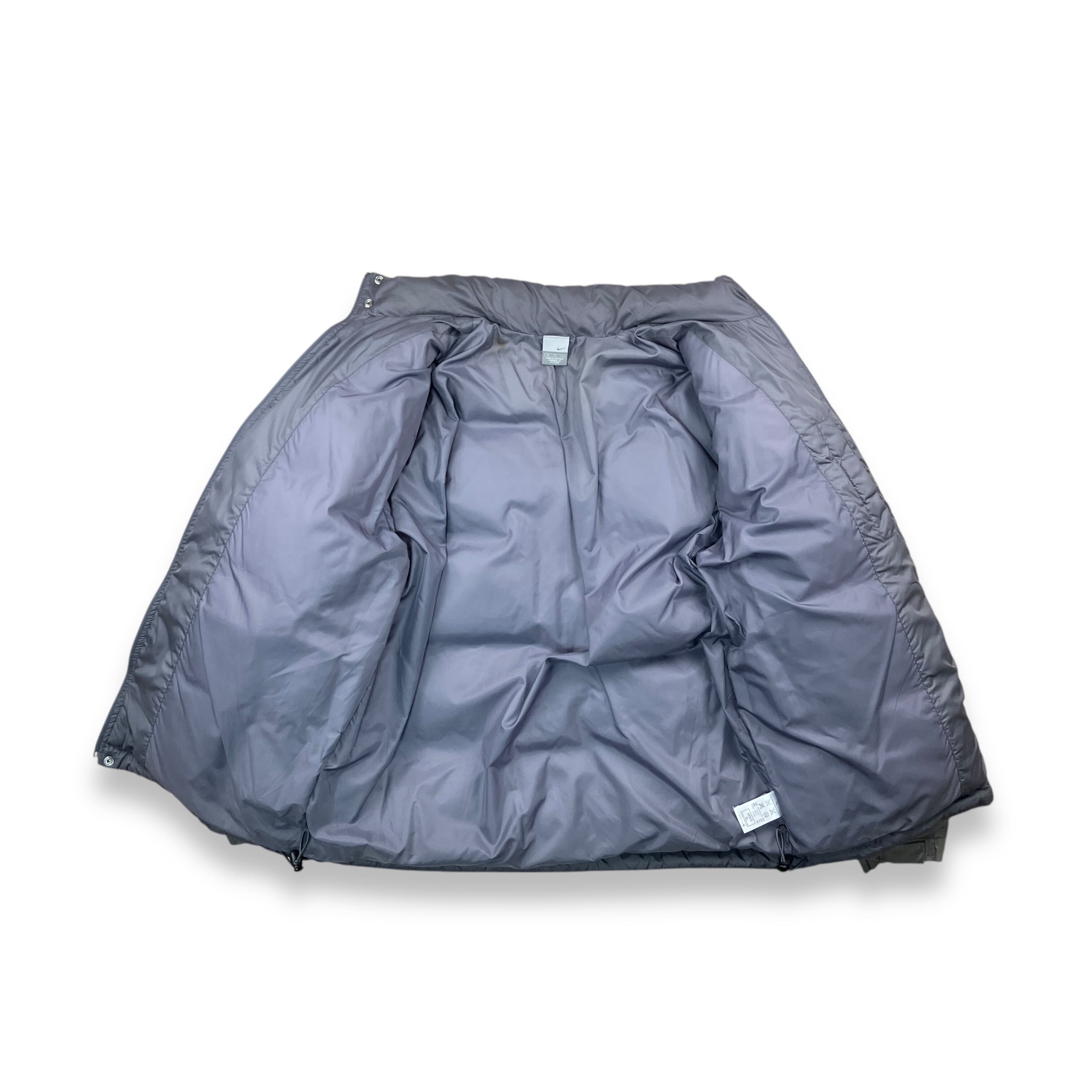 2002年製、ナイキによるツートーン切り替えのダウンジャケット。肩から袖にかけてのライトグレーと、ボディの深いチャコールグレーを組み合わせた配色が特徴で、00年代初期のナイキらしい機能性とミニマルデザインのバランスがよく表れています。