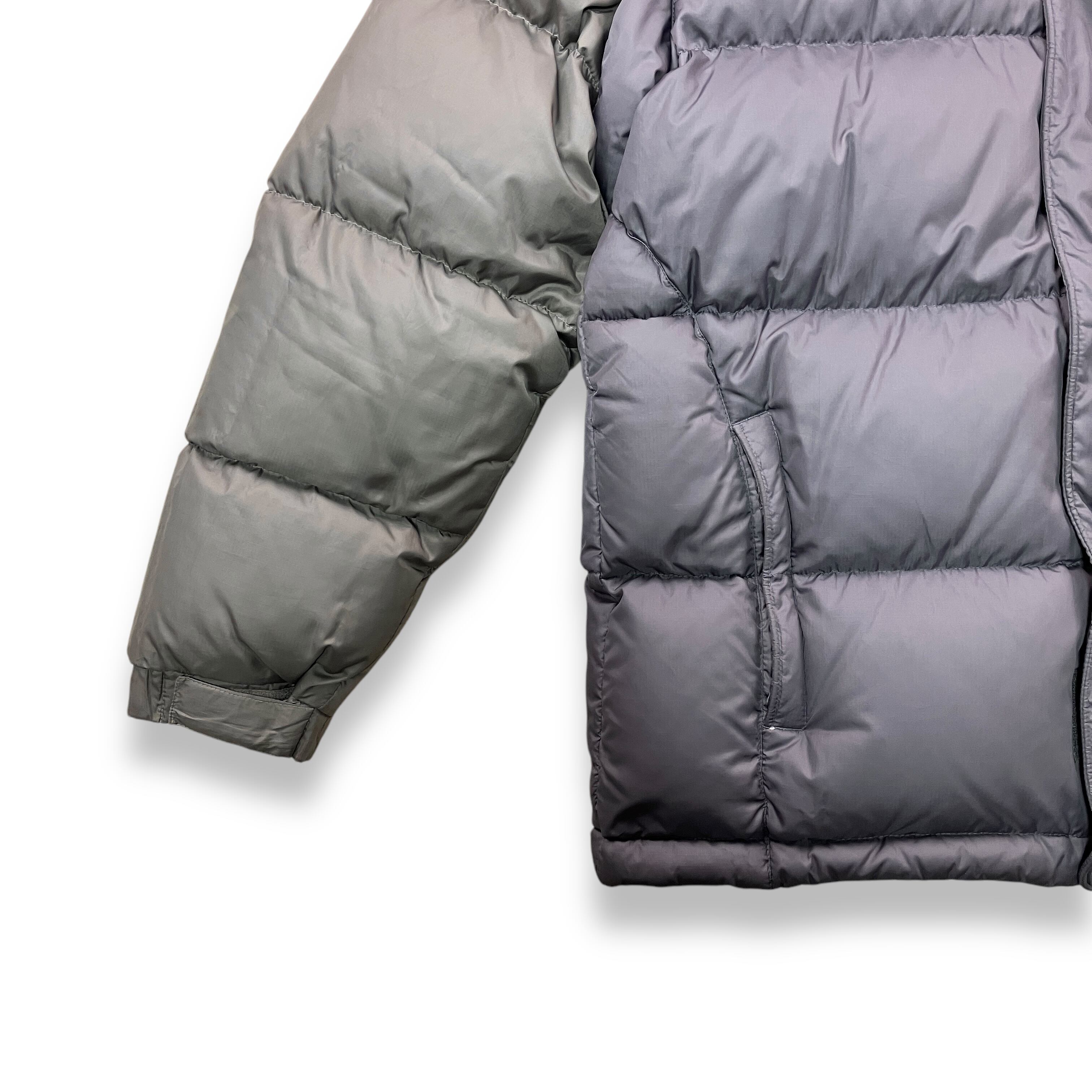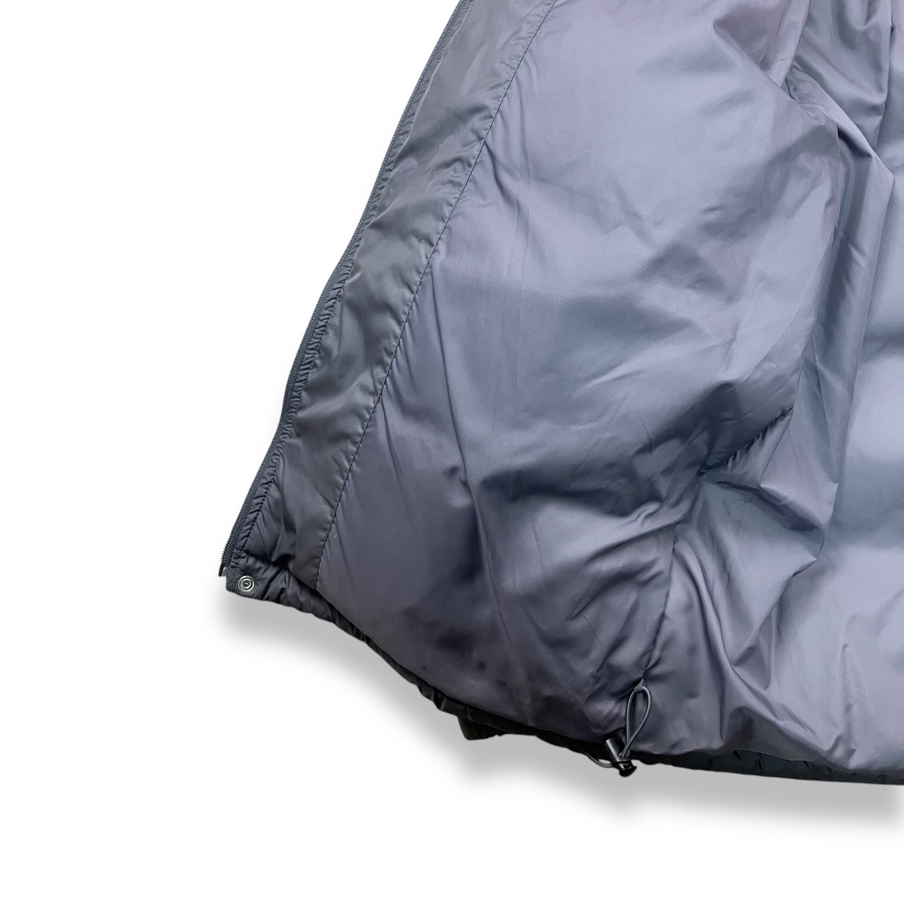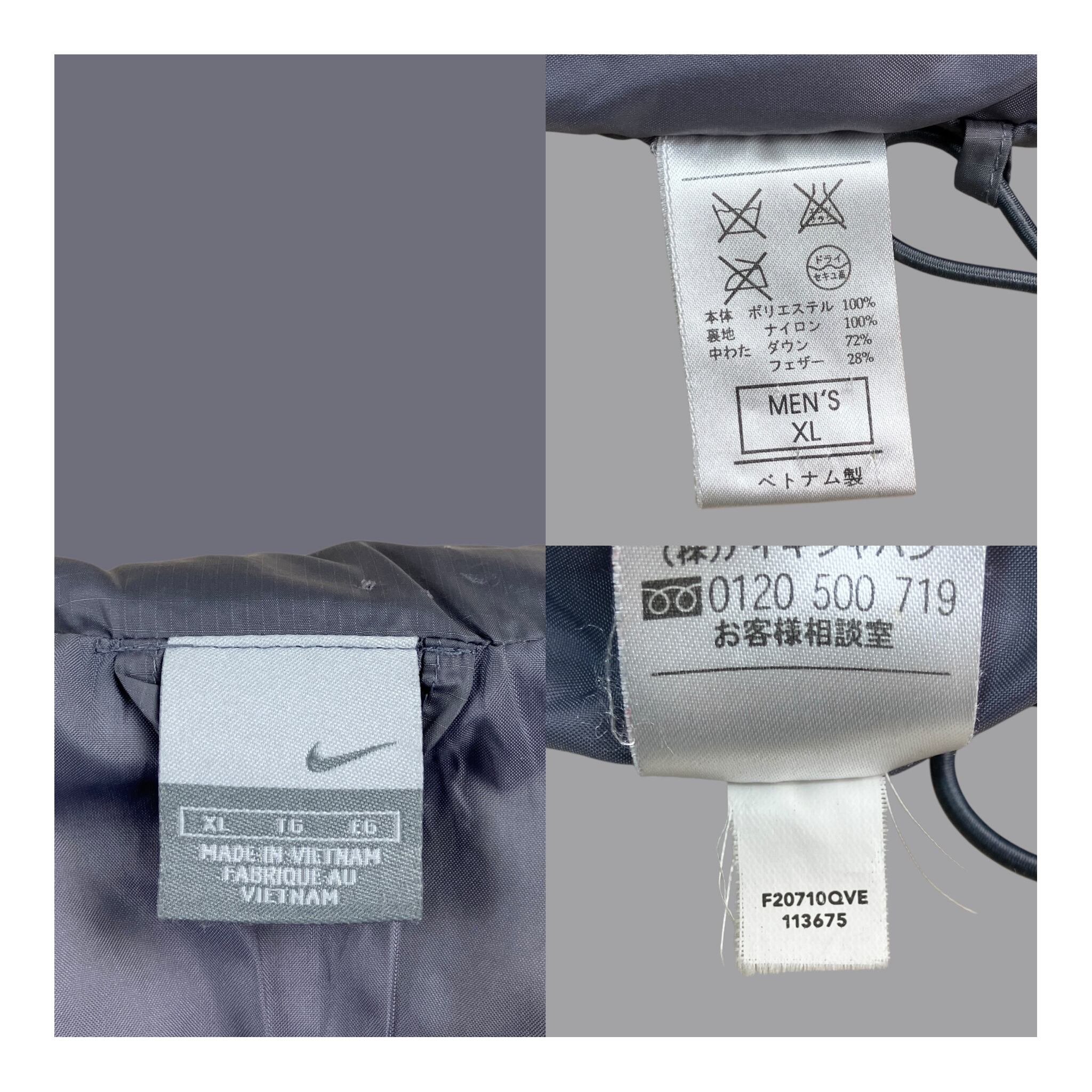 2002年製、ナイキによるツートーン切り替えのダウンジャケット。肩から袖にかけてのライトグレーと、ボディの深いチャコールグレーを組み合わせた配色が特徴で、00年代初期のナイキらしい機能性とミニマルデザインのバランスがよく表れています。