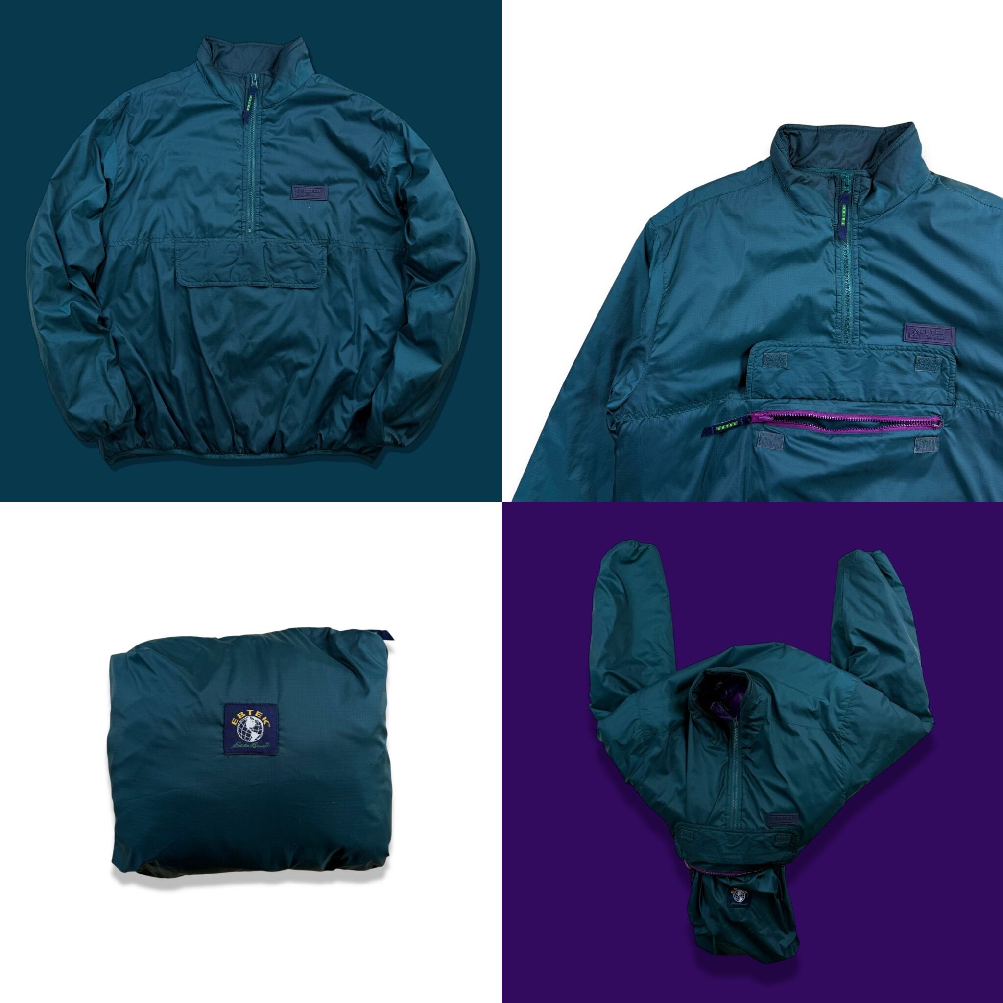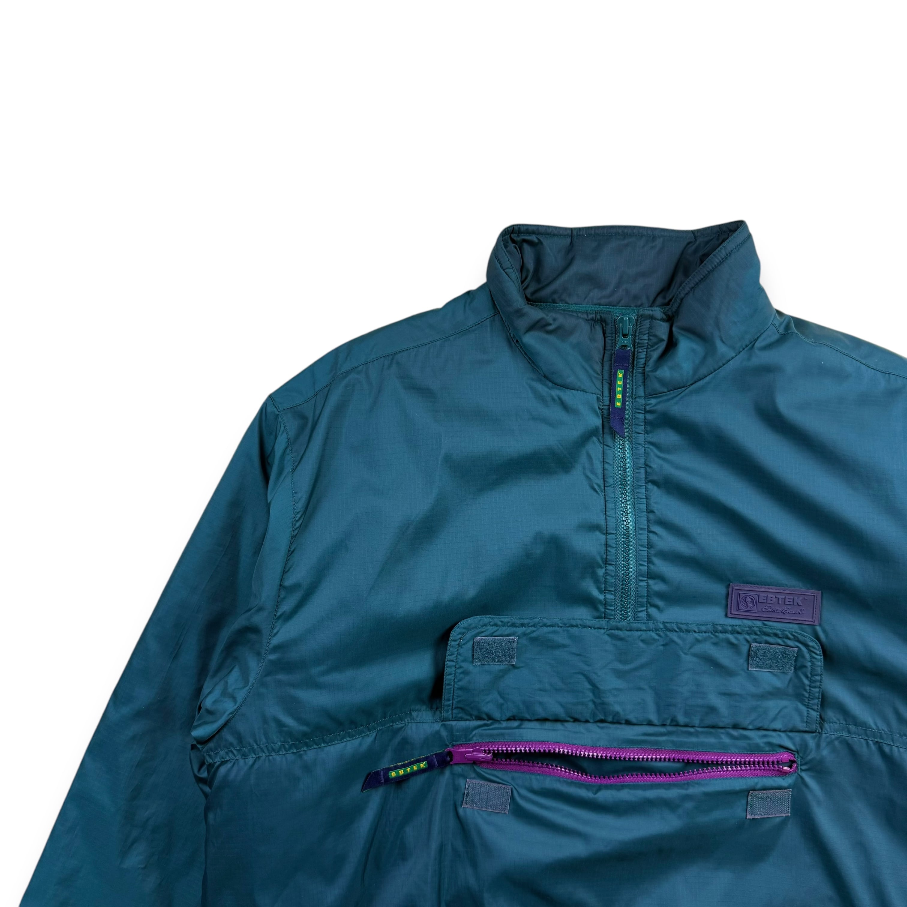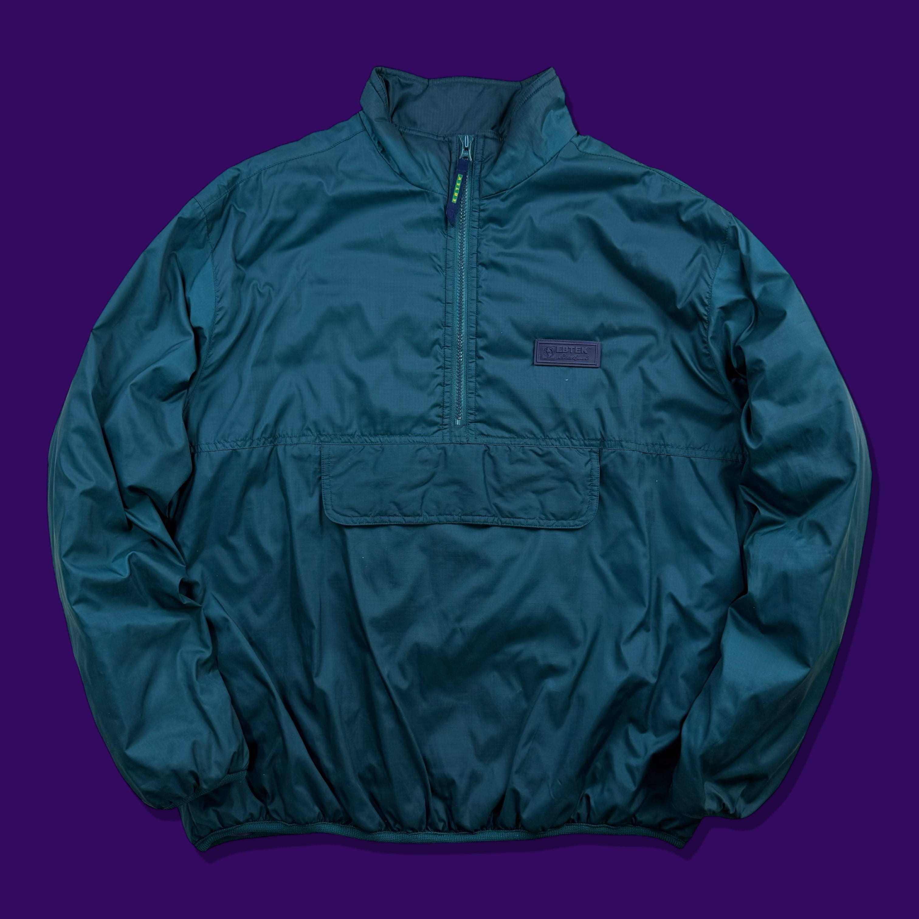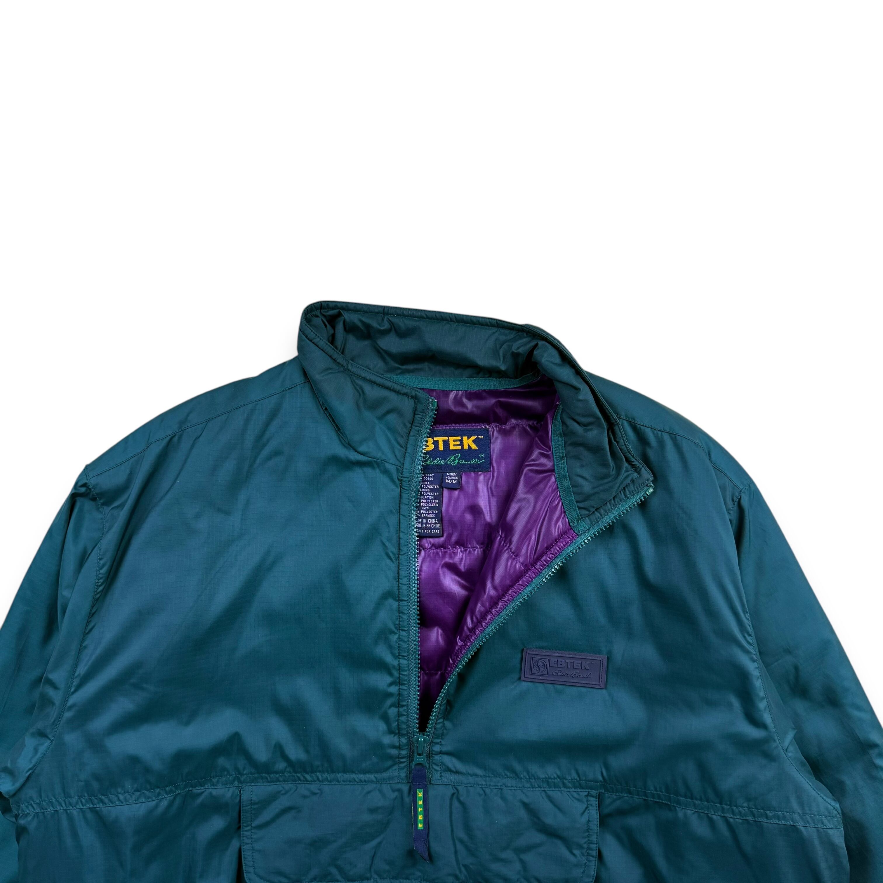 90年代 Eddie Bauer のテクニカルライン EBTEK(Eddie Bauer Technology) より登場した、ハーフジップ仕様の中綿入りプルオーバージャケット。ターコイズグリーンのボディに、ライニングのパープルが差し色として効く、EBTEKらしい独特の配色が魅力です。