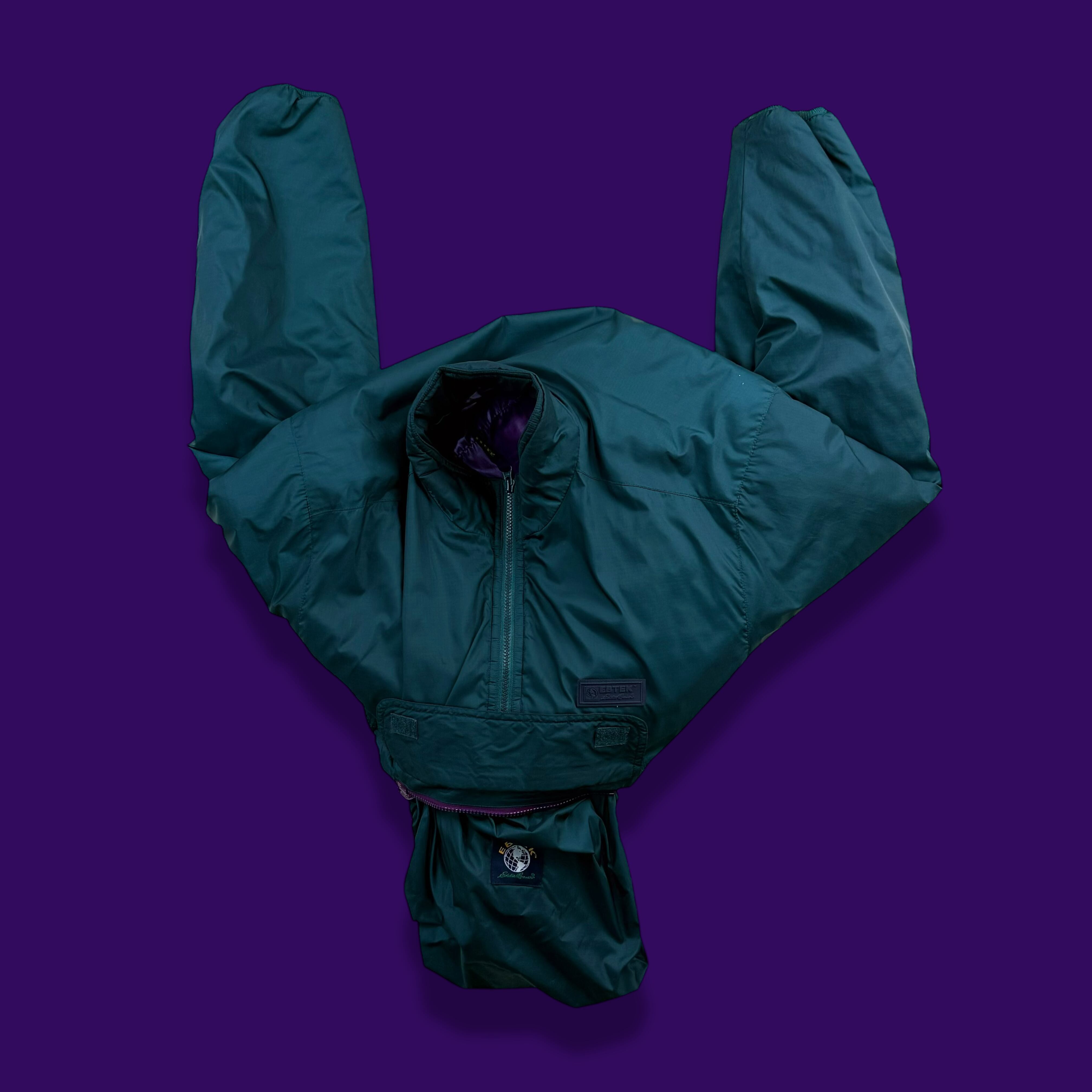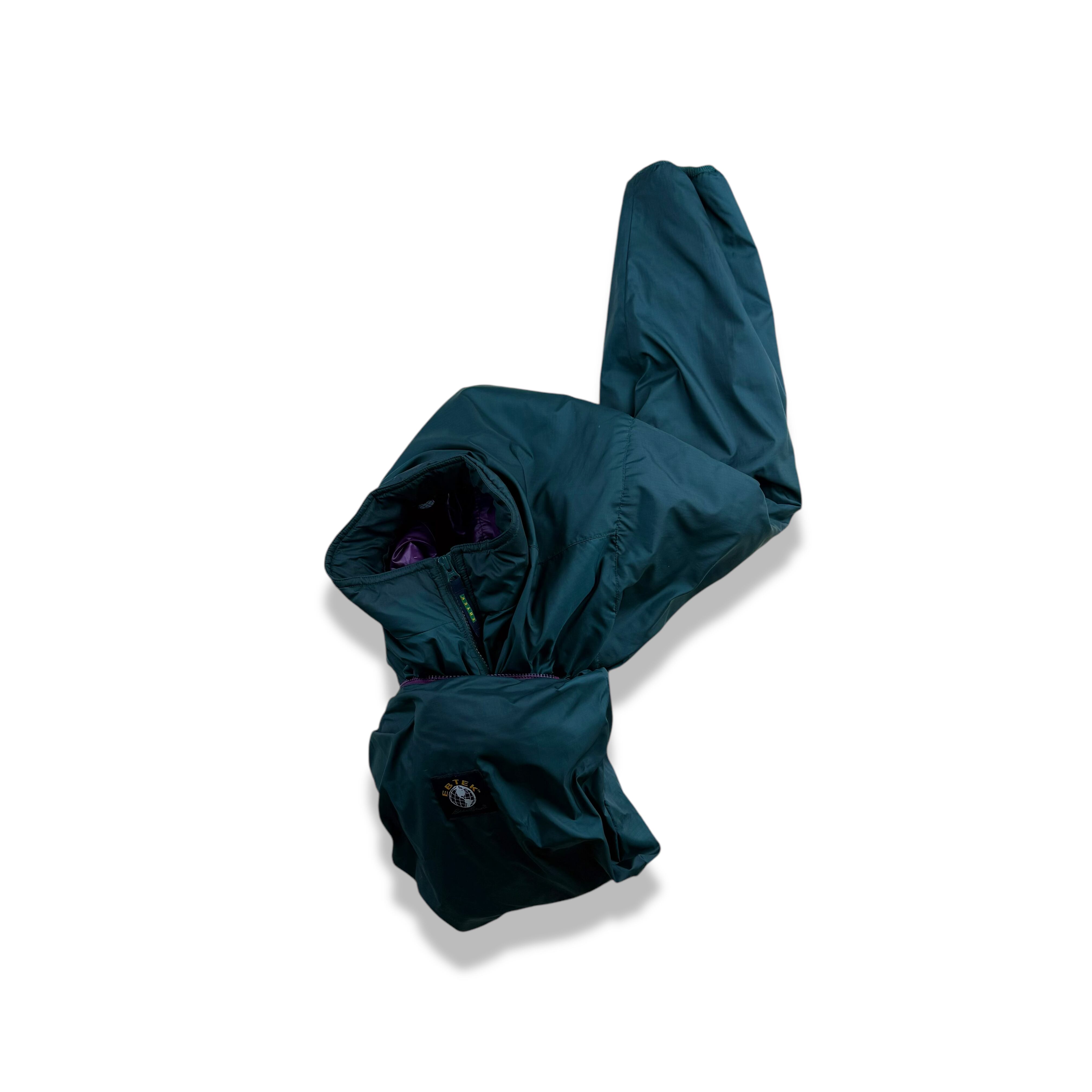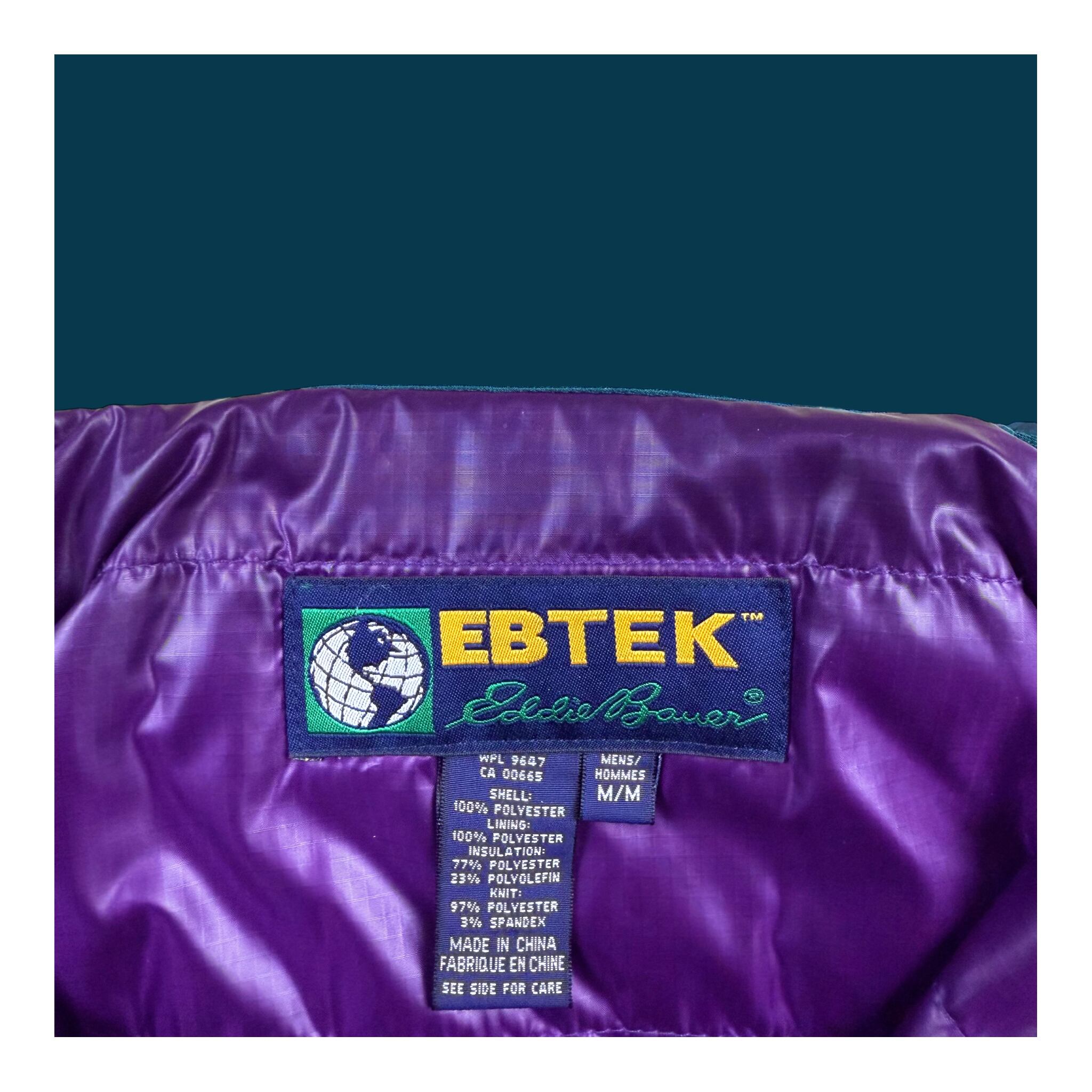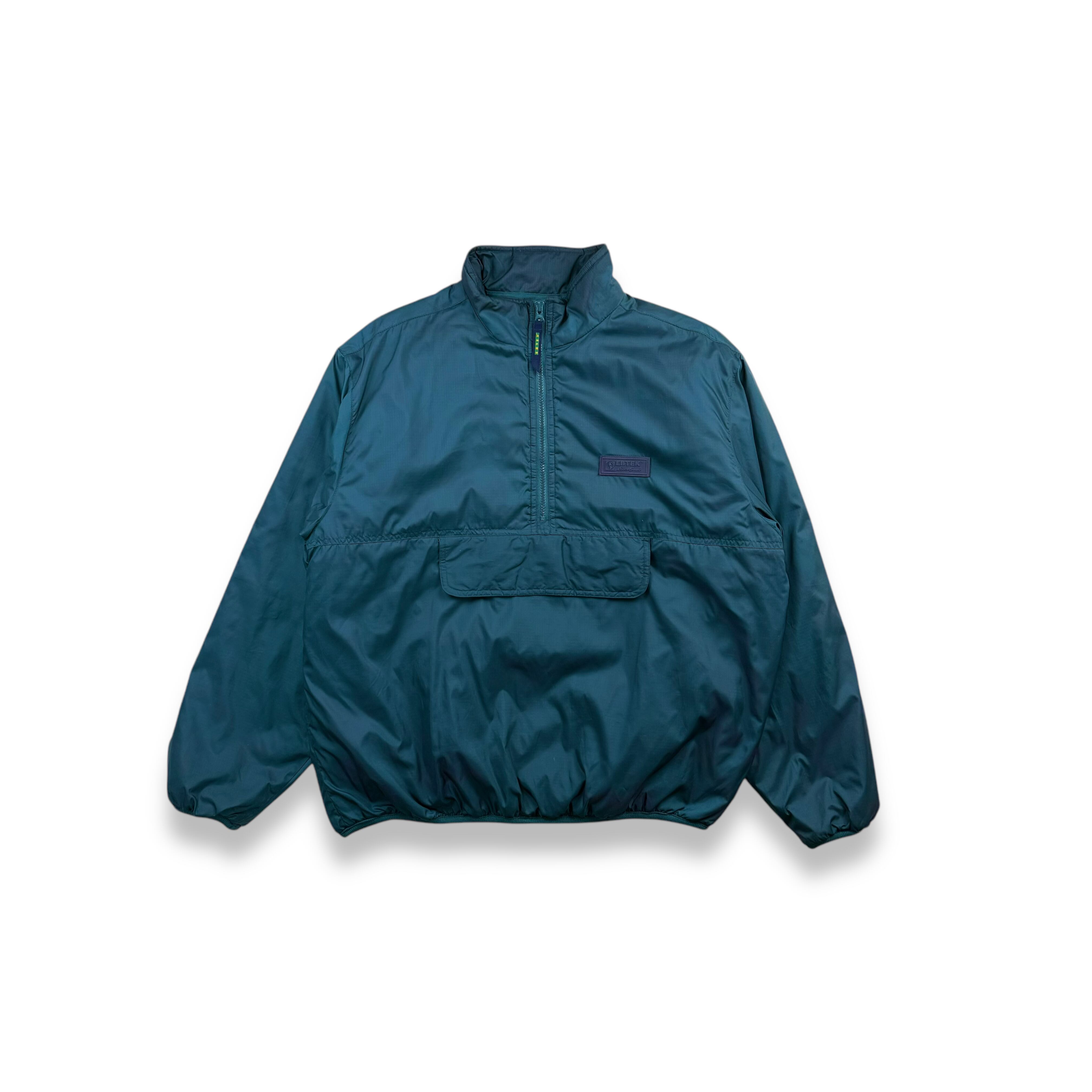90年代 Eddie Bauer のテクニカルライン EBTEK(Eddie Bauer Technology) より登場した、ハーフジップ仕様の中綿入りプルオーバージャケット。ターコイズグリーンのボディに、ライニングのパープルが差し色として効く、EBTEKらしい独特の配色が魅力です。