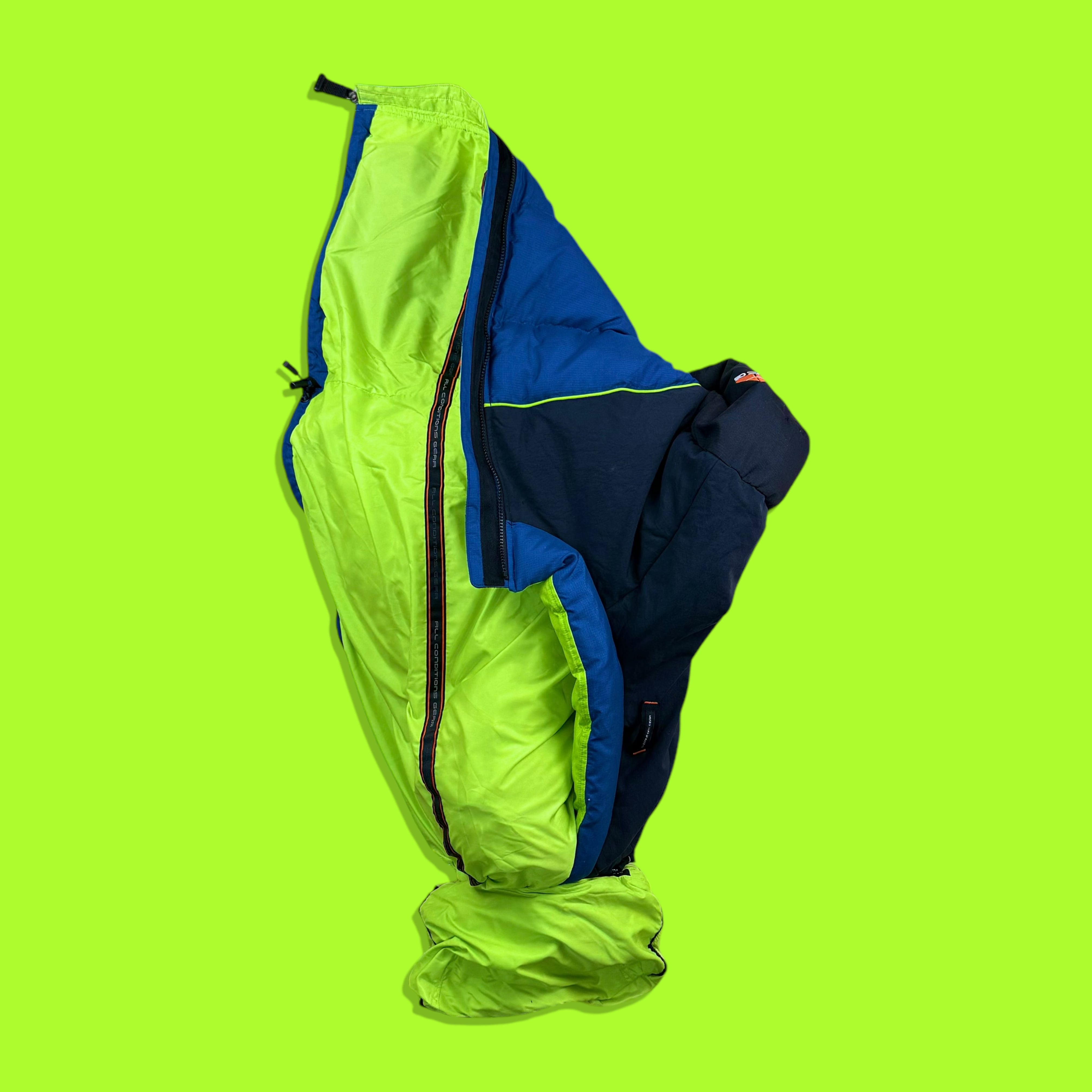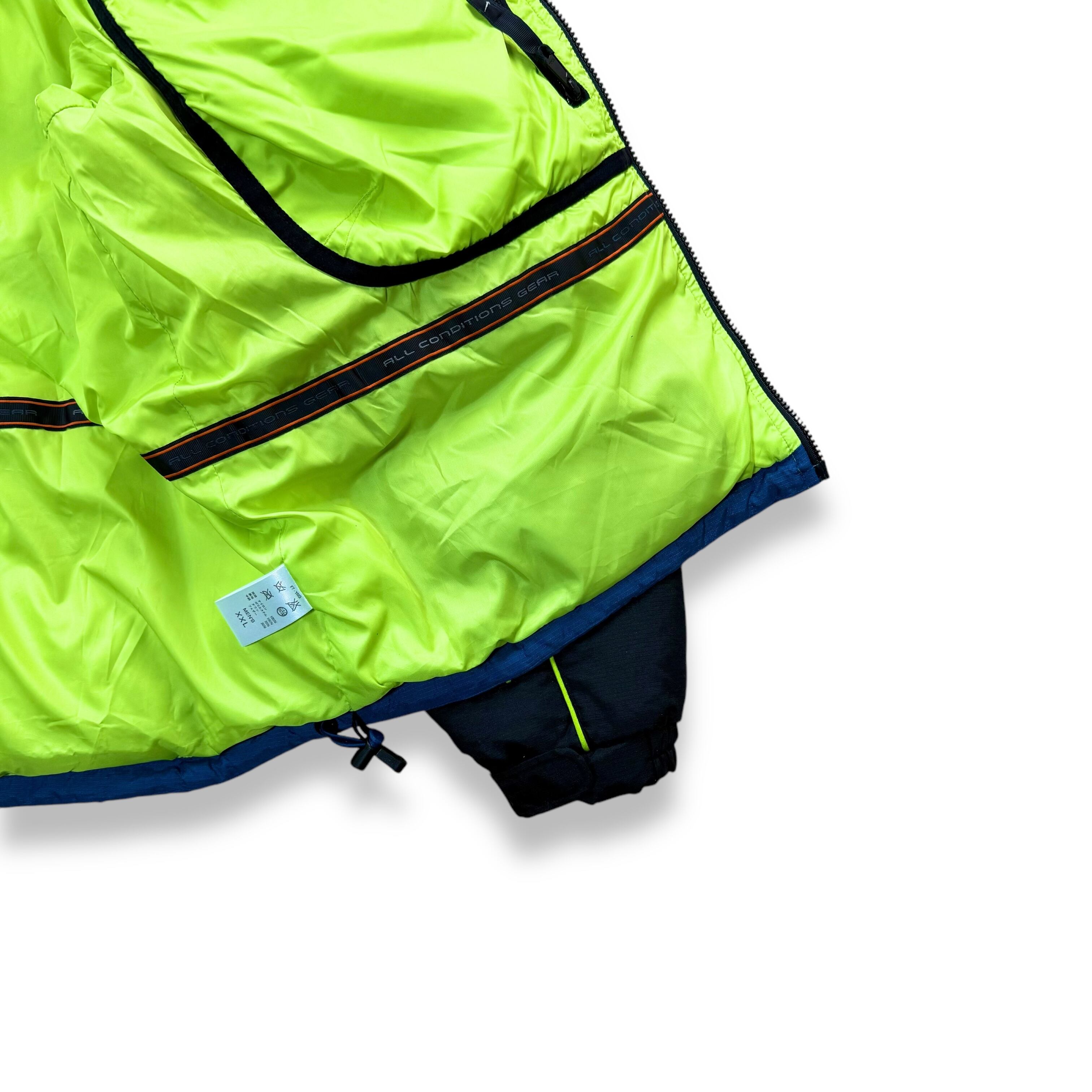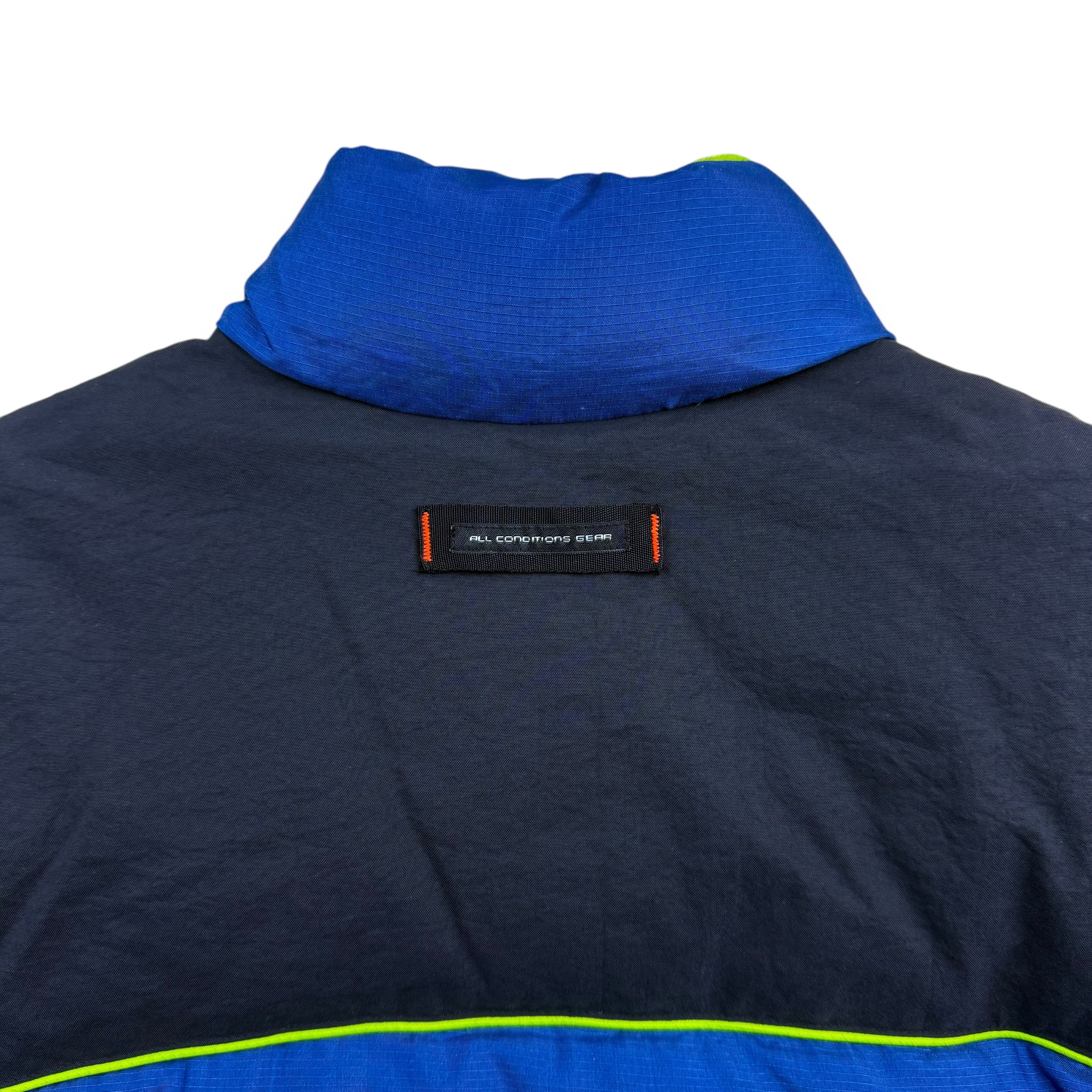 ブラックとブルーの2トーン切り替えをベースに、パイピングと裏地にはネオンライムグリーンを使用。視認性とデザイン性を両立したこの配色は、90年代後期ACG特有のテック×スポーツミックスな雰囲気を強く感じさせます。