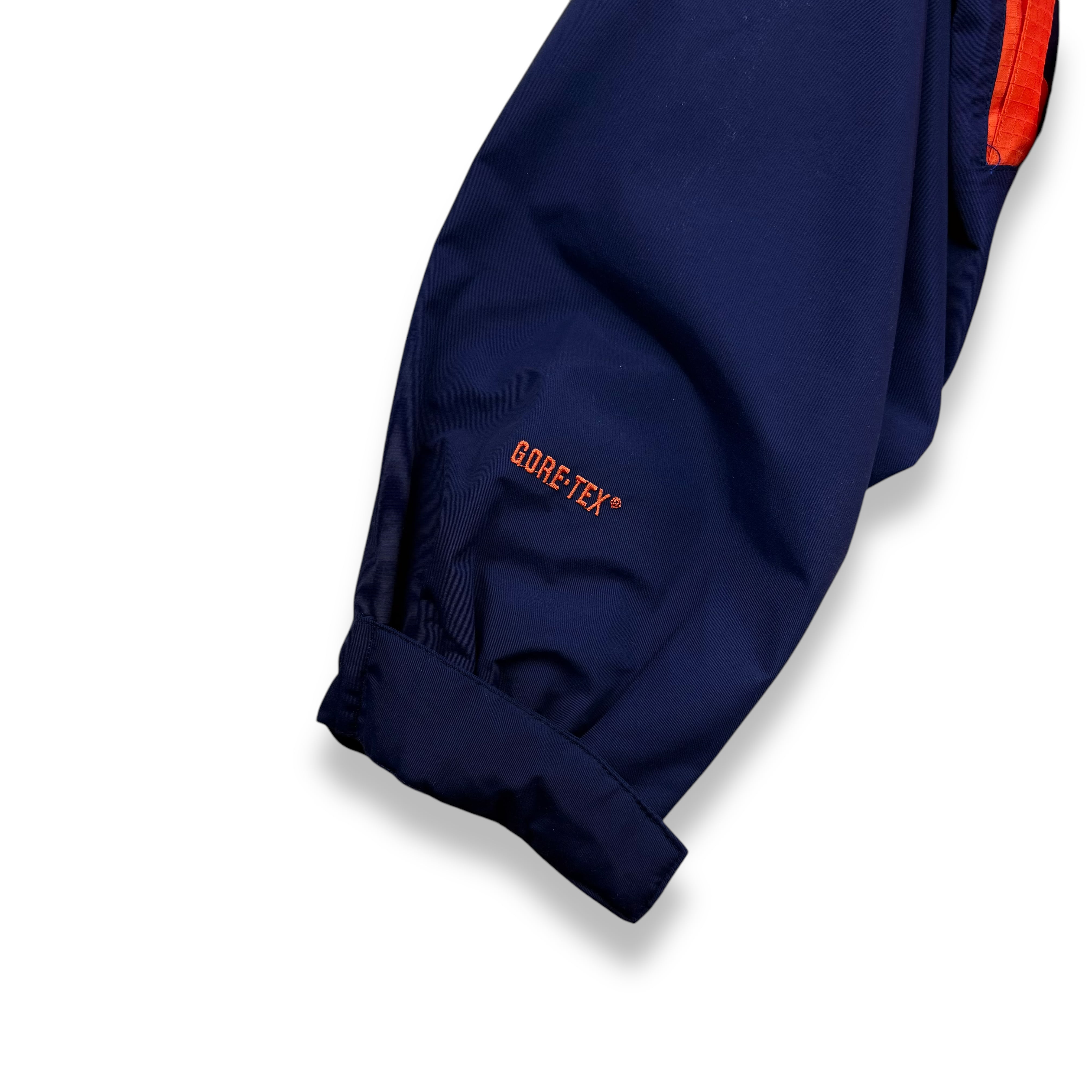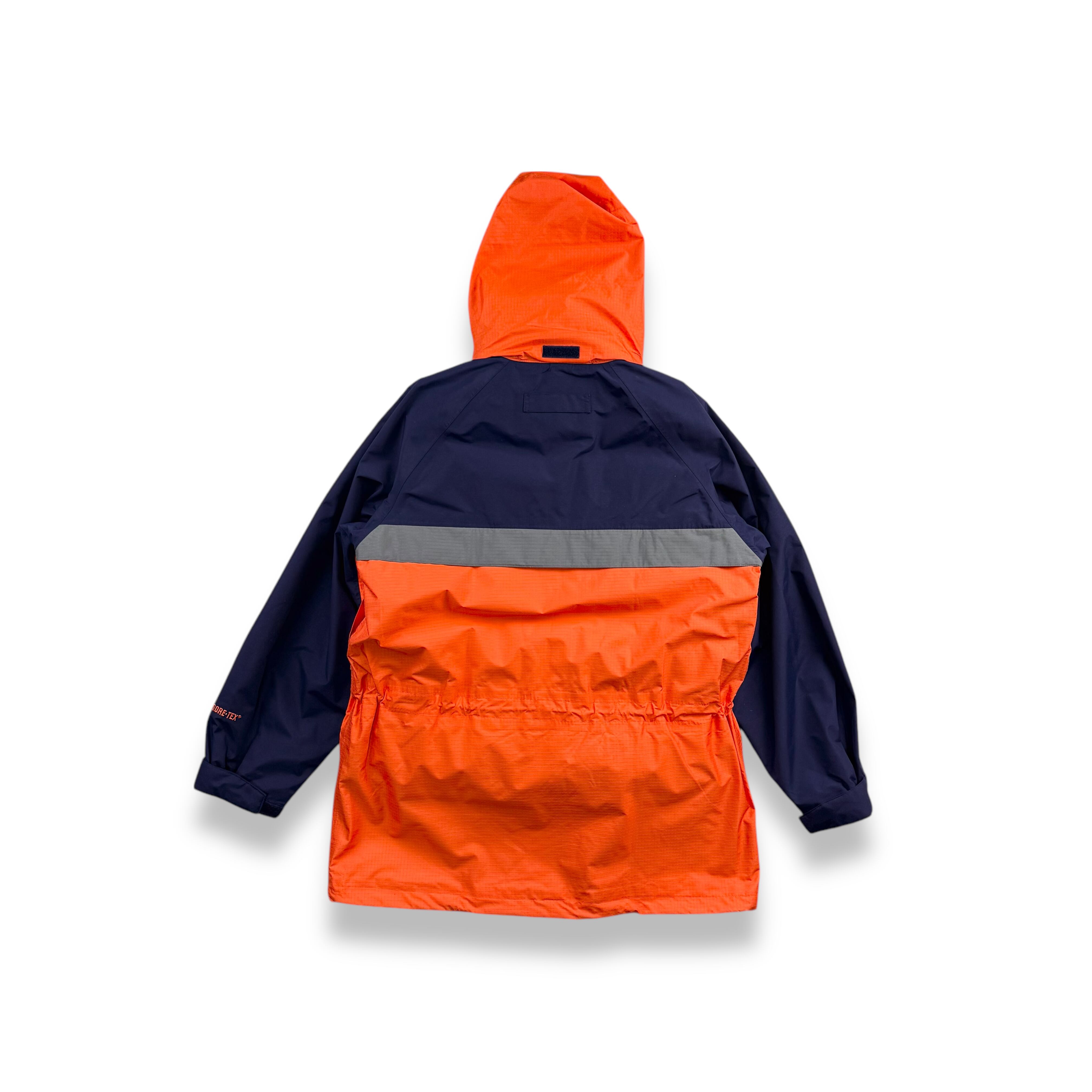 シェルには、耐水・防風性に優れたゴアテックスメンブレンを貼り合わせたナイロン素材を使用。カラーは視認性の高いネオンオレンジとネイビーとグレーで、アウトドアウェアとしての機能性と存在感がしっかり表れた配色です。