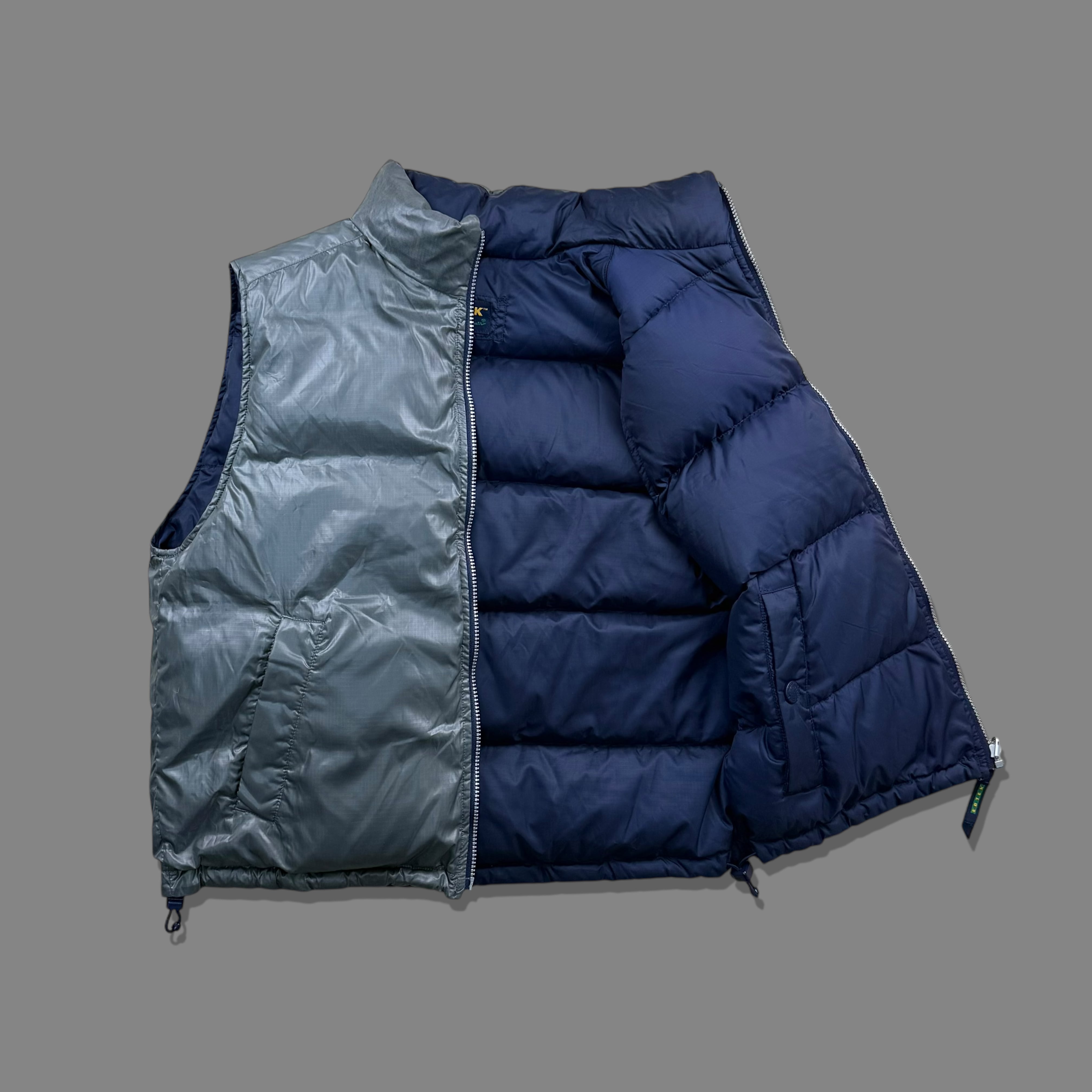 内側のダウンライナーは、軽量なポリエステルシェルの内外にグースダウンを封入し、真冬でも十分な暖かさを発揮。ライナーはシルバーグレーとネイビーのリバーシブル仕様で、ネイビー側は落ち着いたアウトドア寄りの雰囲気、シルバーグレー側は光沢があり、テックな表情が楽しめます。