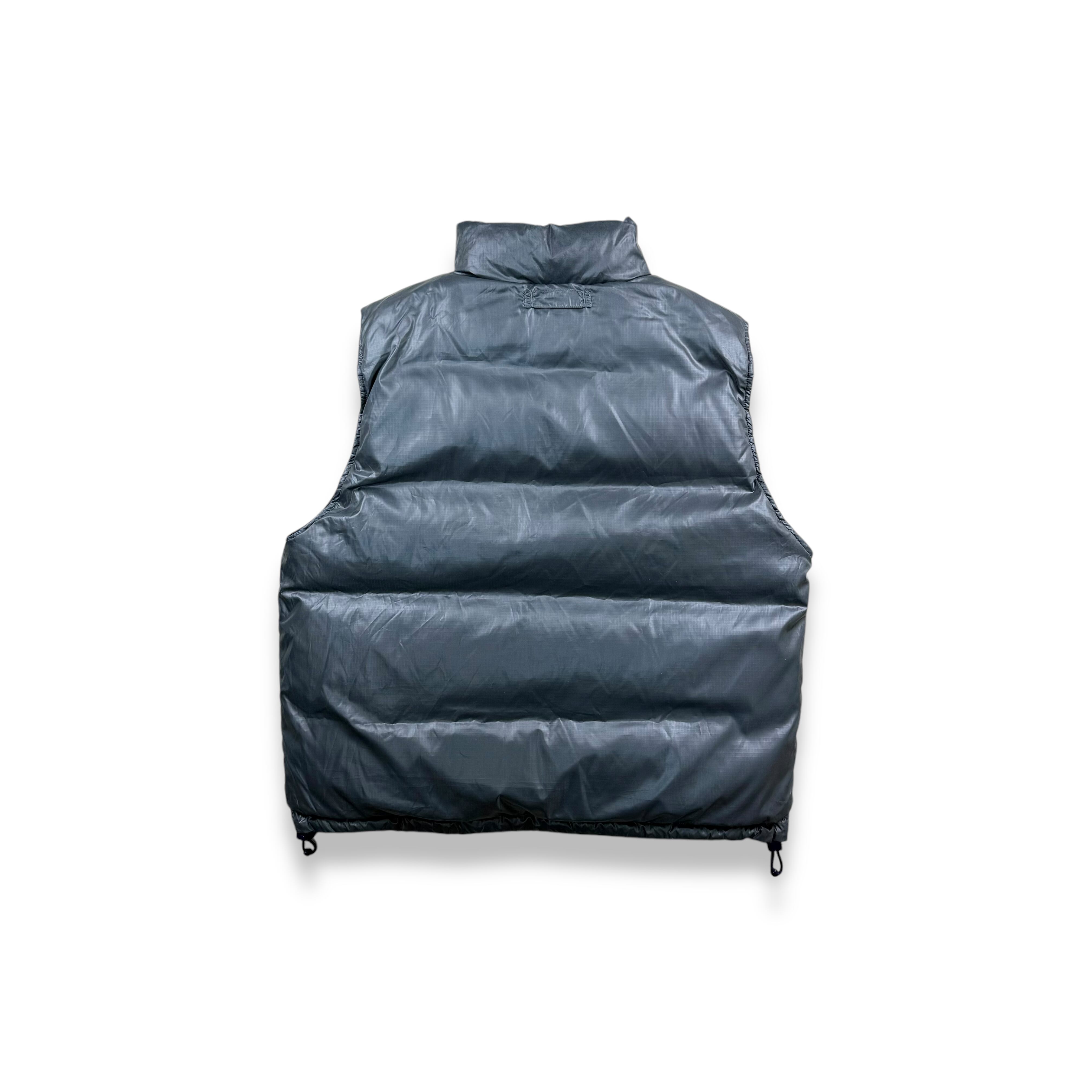 リバーシブルのダウンベストは、単体で使うとより都会的なゴープコアに寄せられます。シルバー側は光沢があり、黒いパンツやチャコールのテックパンツと合わせると“無機質で軽さのあるイメージに。ネイビー側は落ち着きが出るので、アウターとして着る日でもインナーとしてレイヤードしてもバランスよく馴染みます。