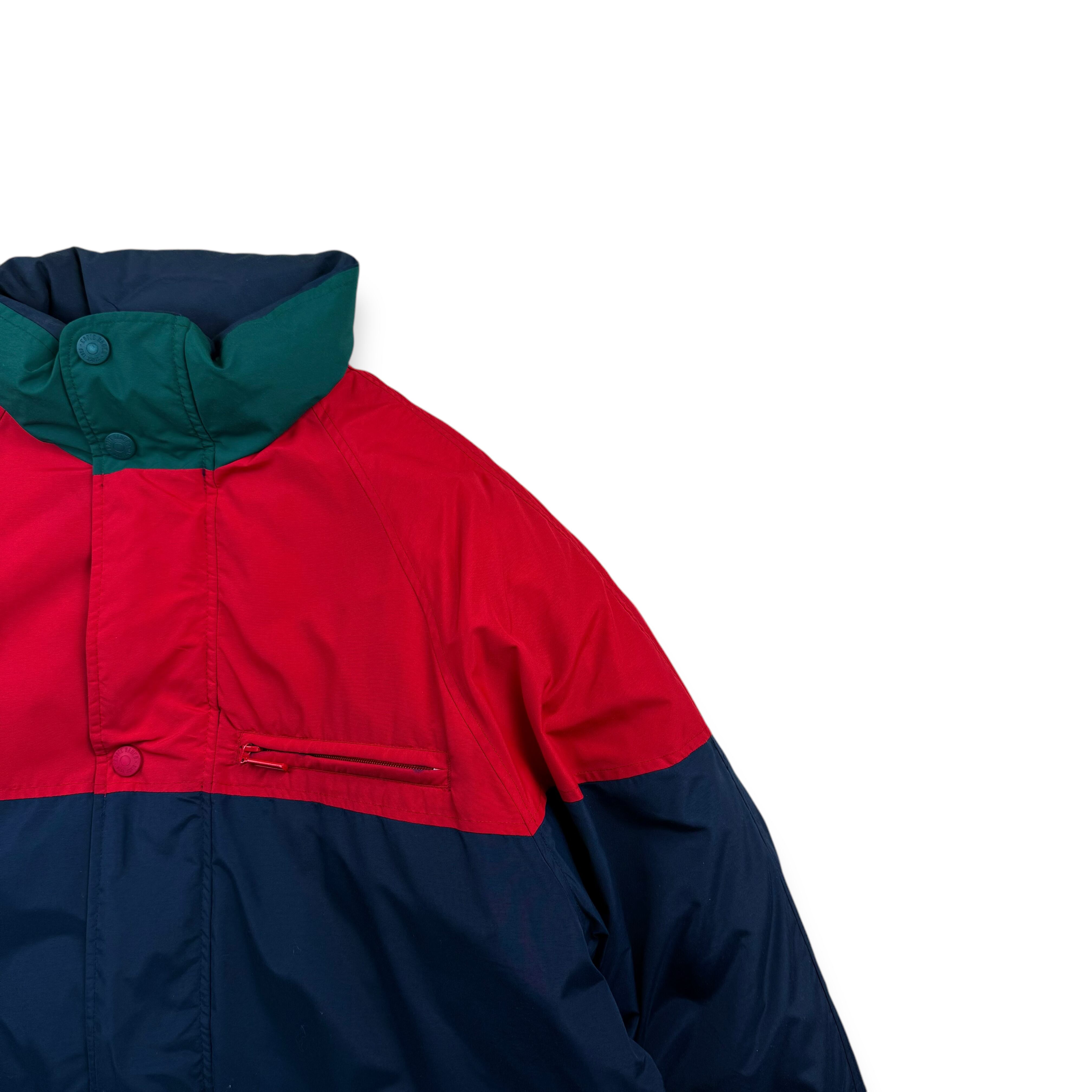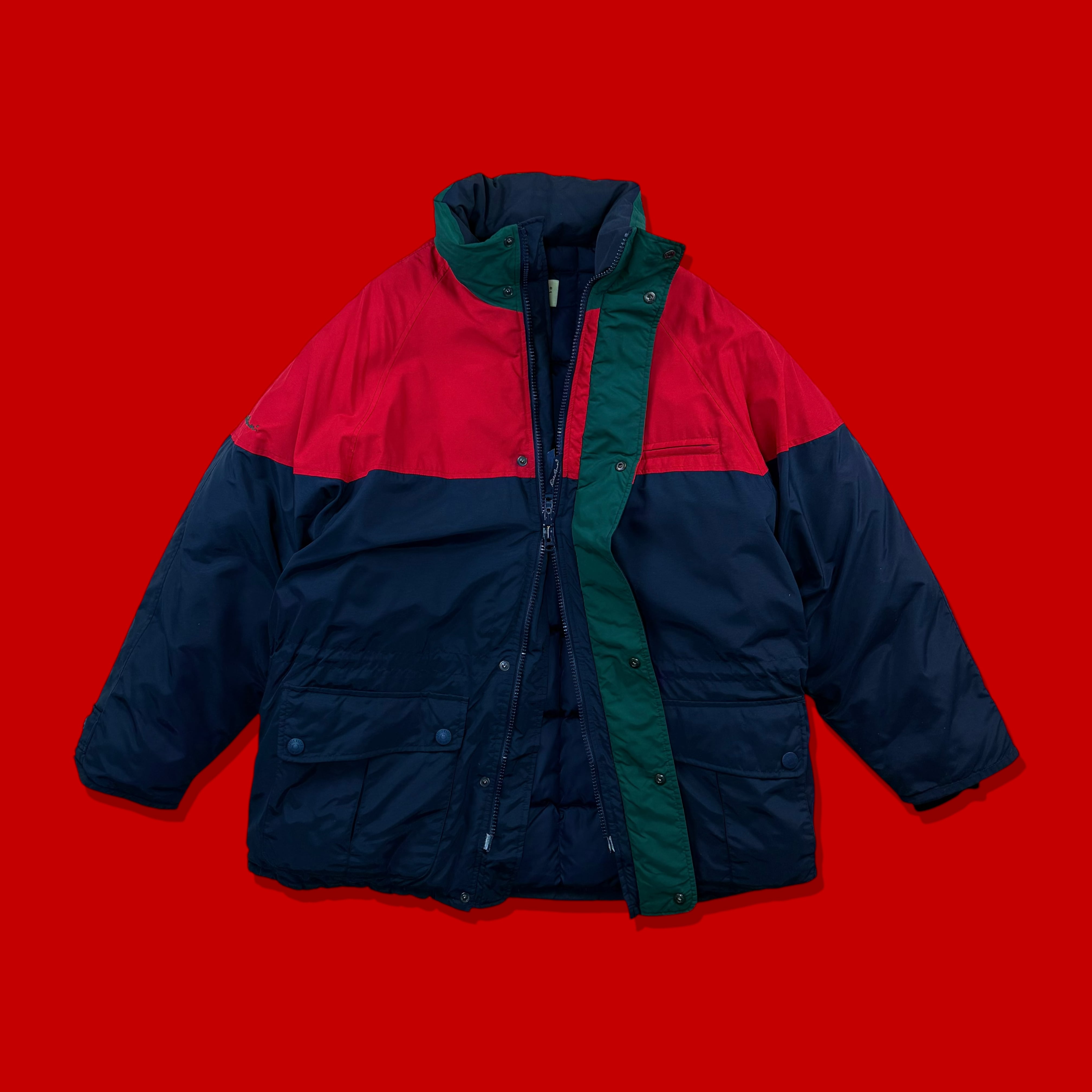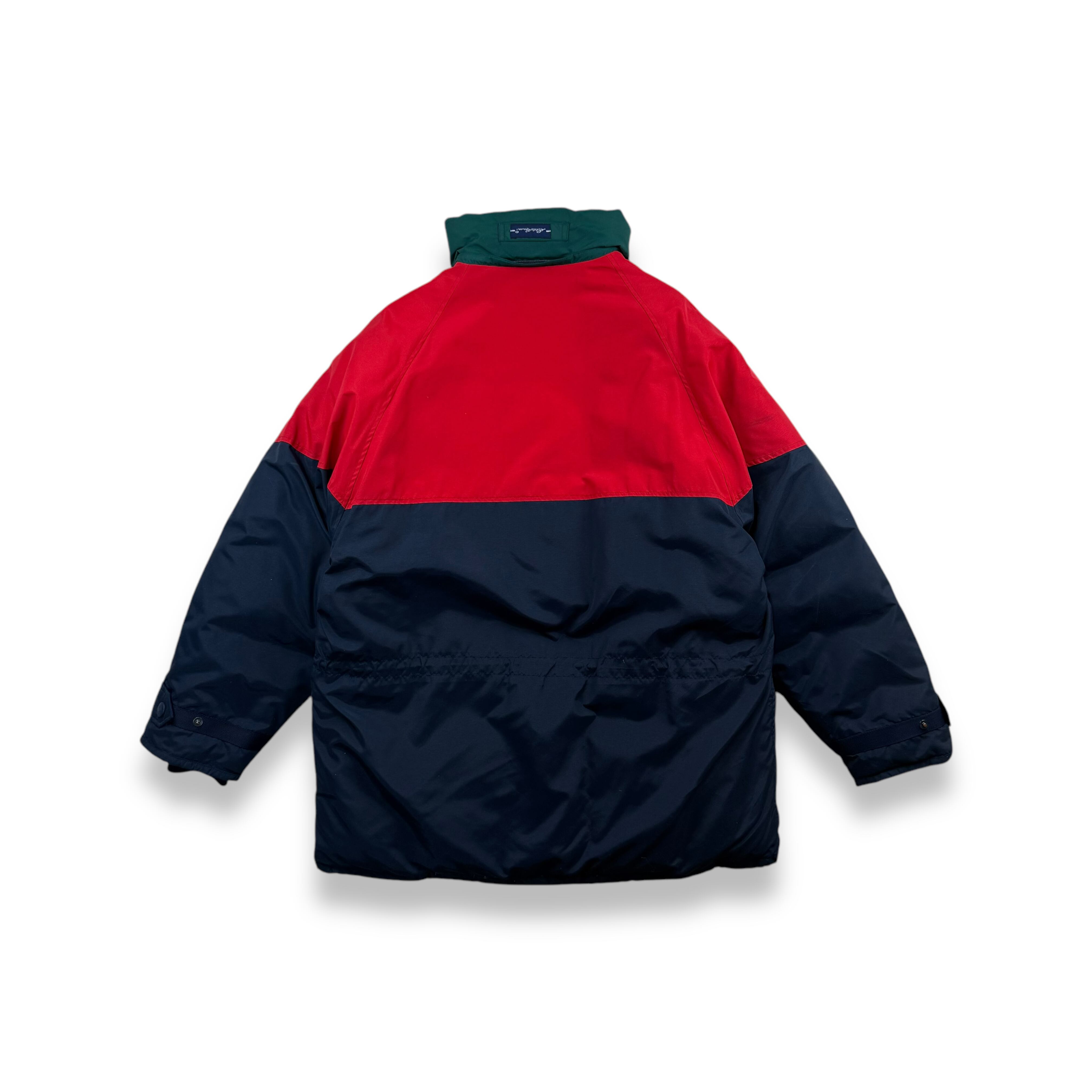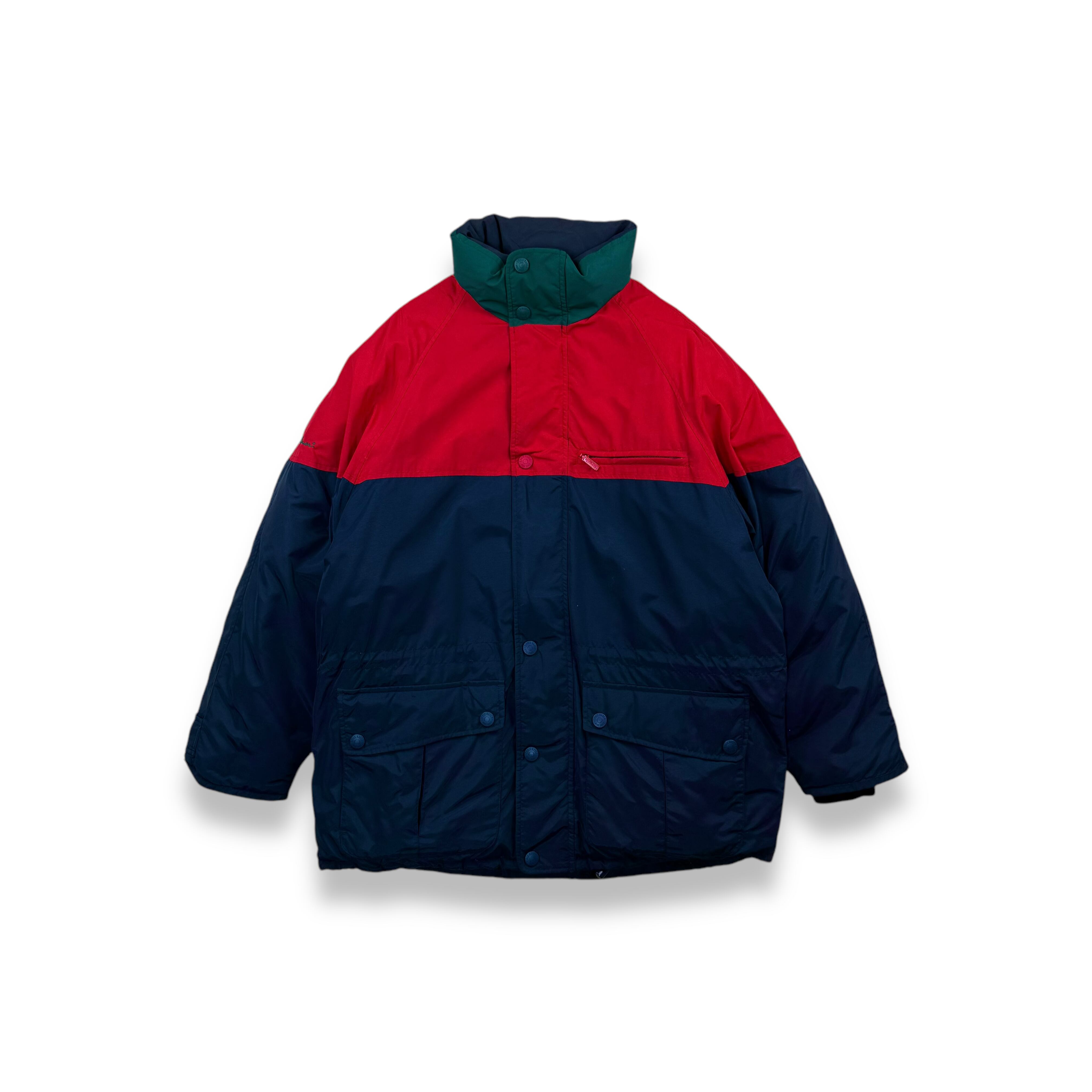 1990年代、白タグ期のエディーバウアーによりリリースされた名作グースダウンジャケット。レッド、ネイビー、グリーンを組み合わせた3トーン配色のメリハリある色使いで、日常のスタイリングにも自然に馴染むバランスの良いデザインです。