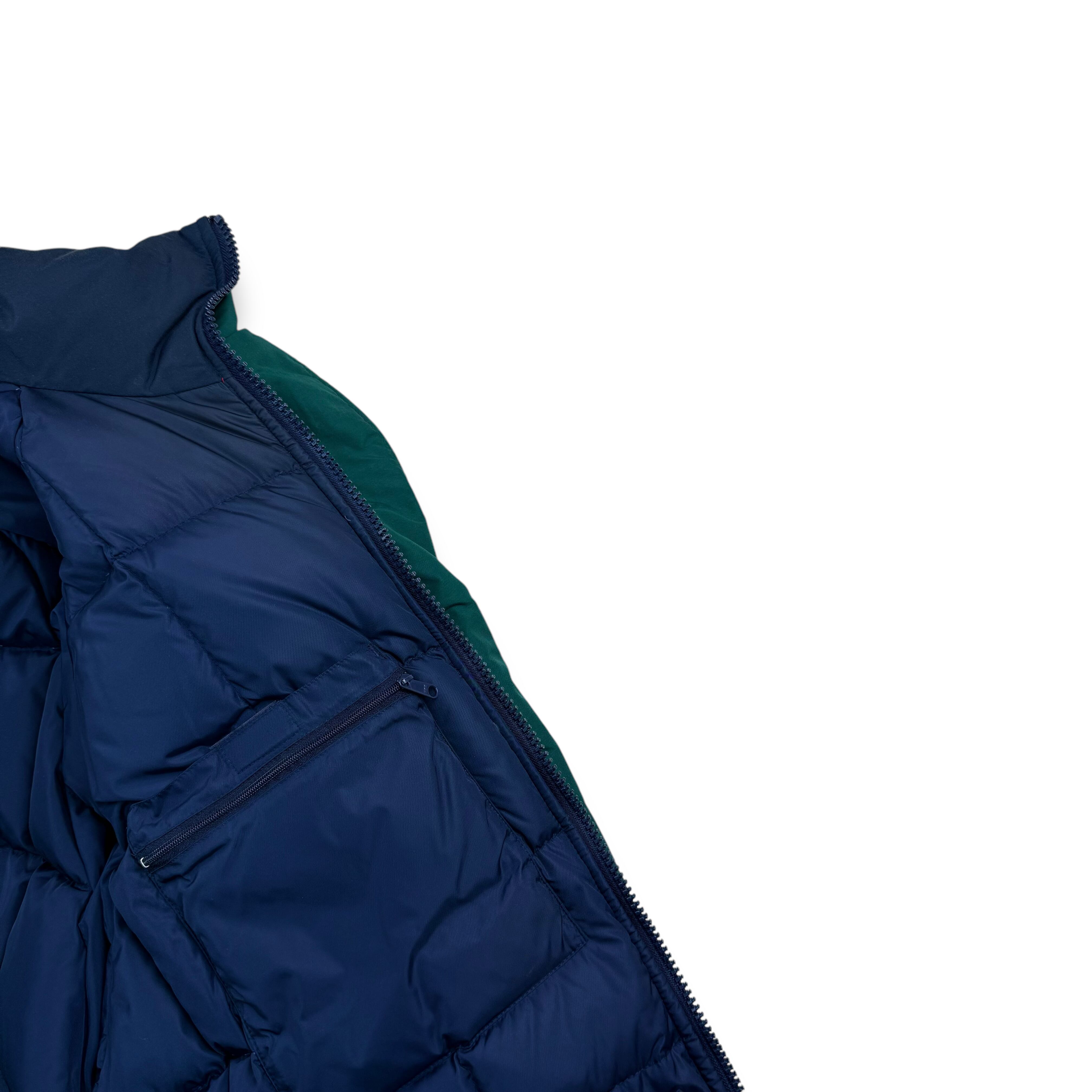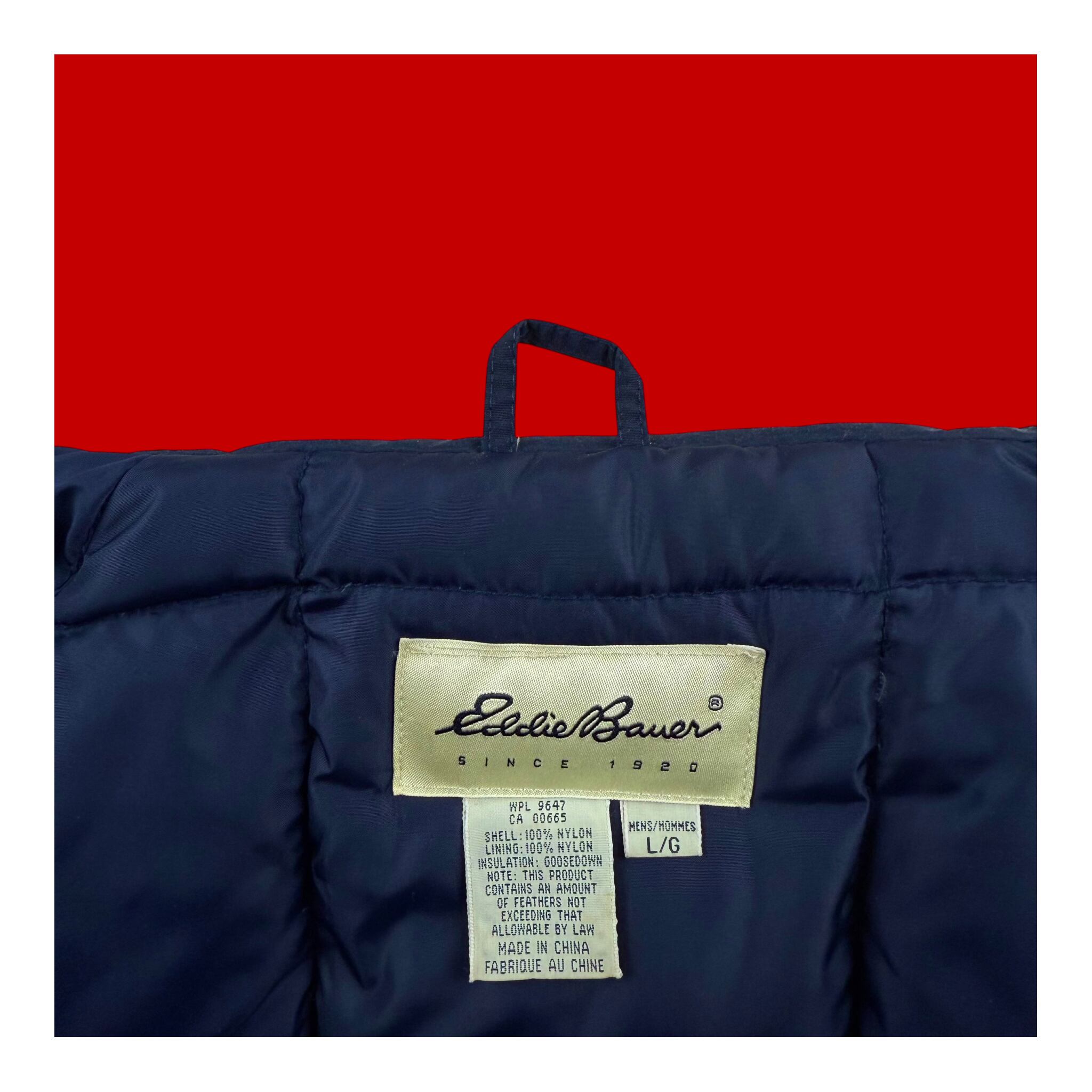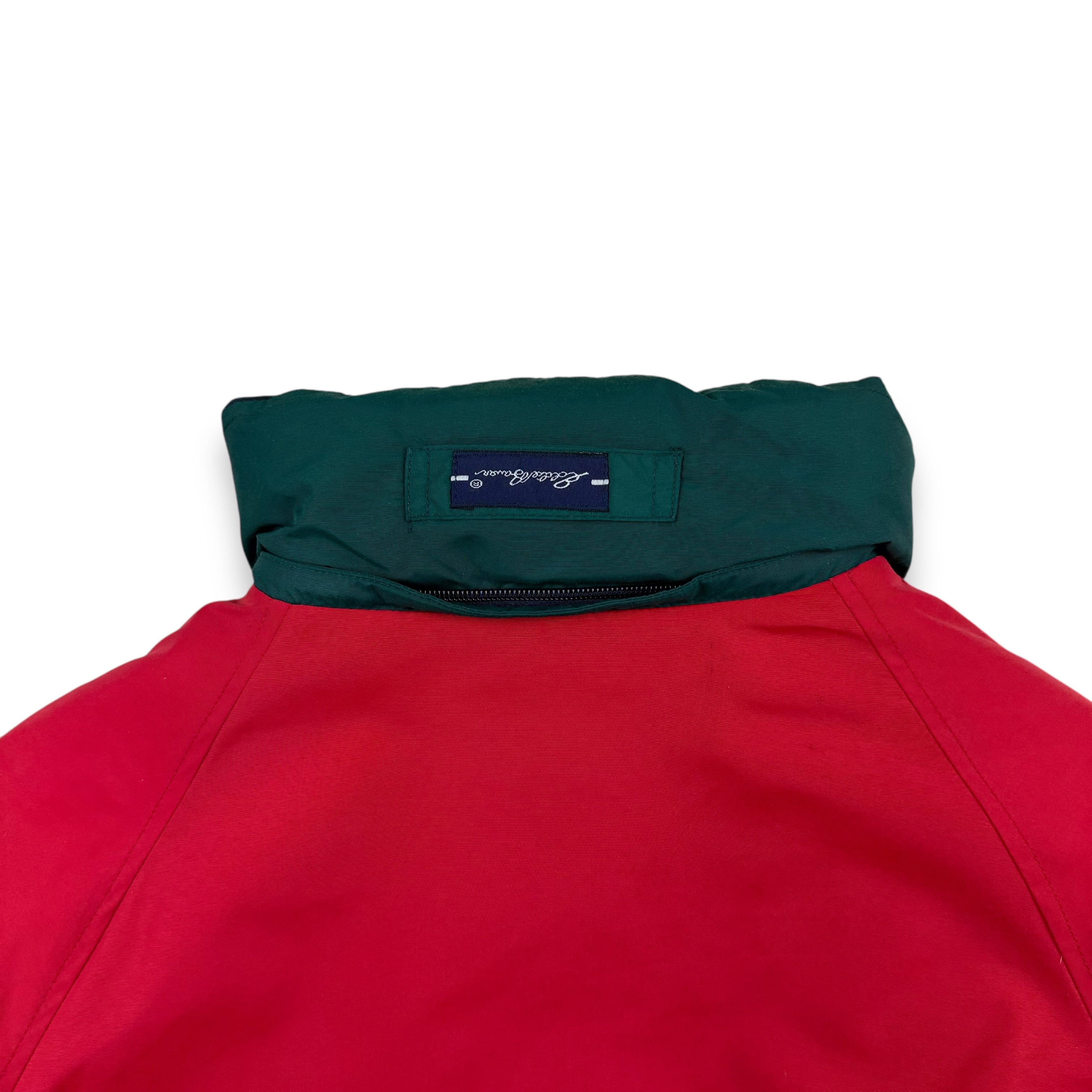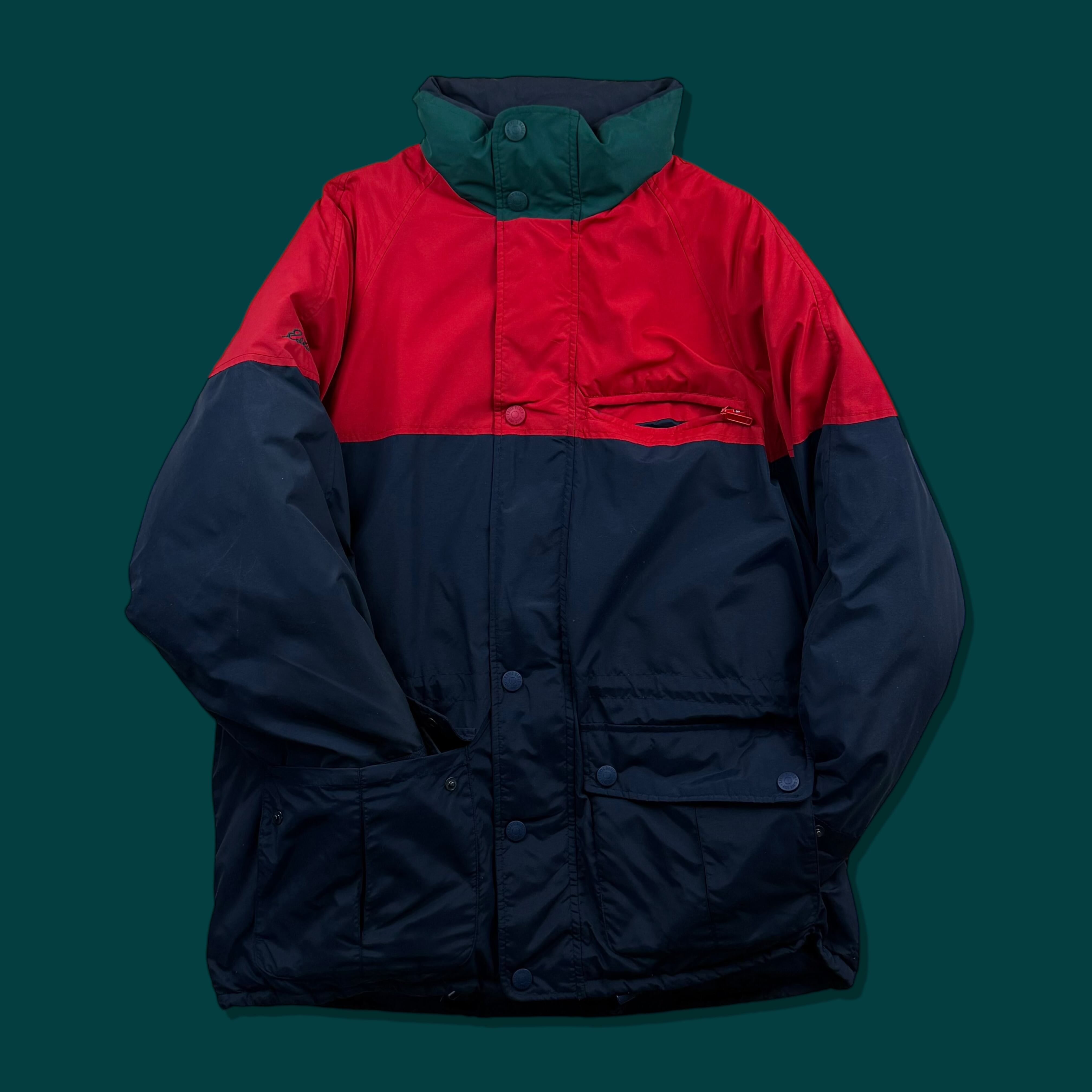 1990年代、白タグ期のエディーバウアーによりリリースされた名作グースダウンジャケット。レッド、ネイビー、グリーンを組み合わせた3トーン配色のメリハリある色使いで、日常のスタイリングにも自然に馴染むバランスの良いデザインです。