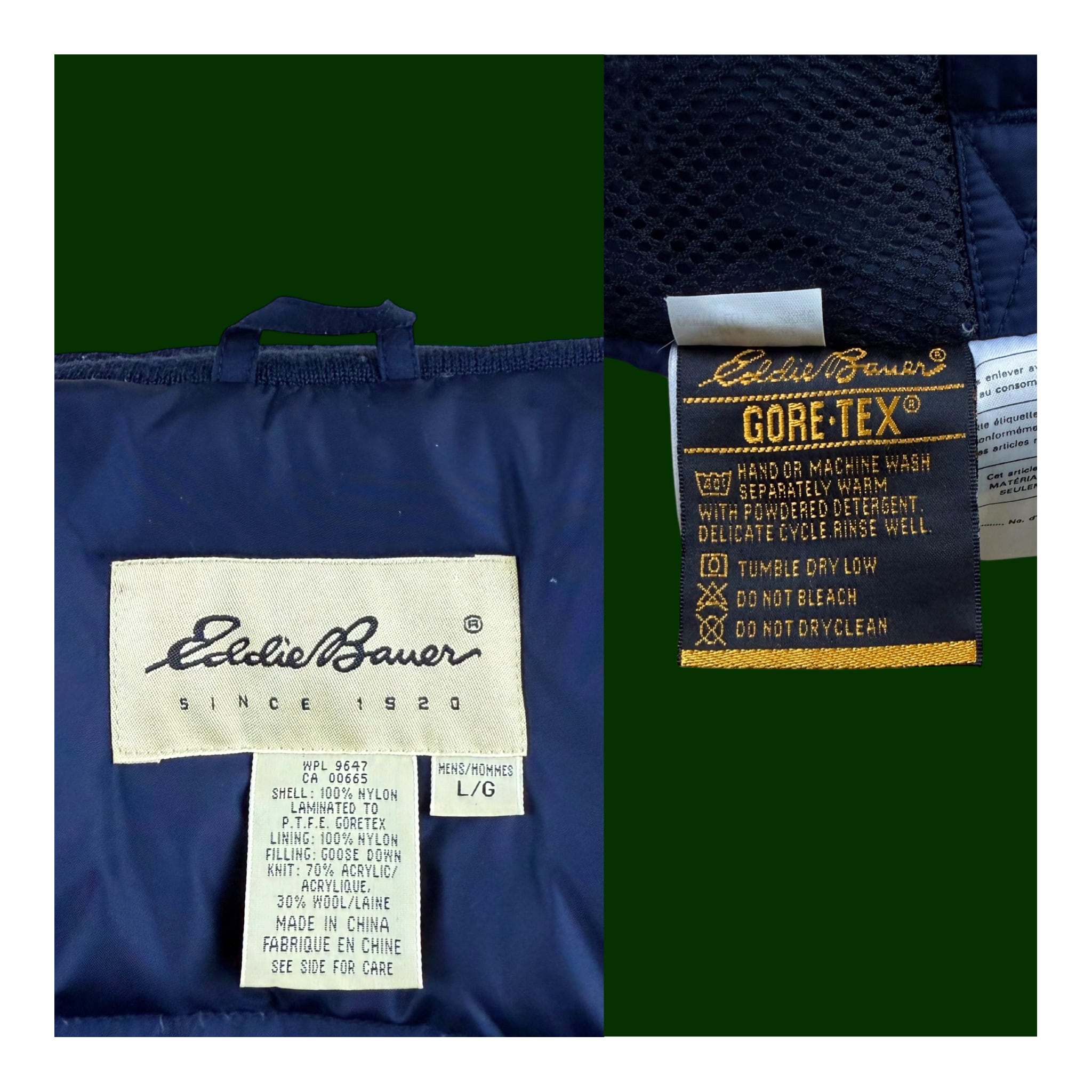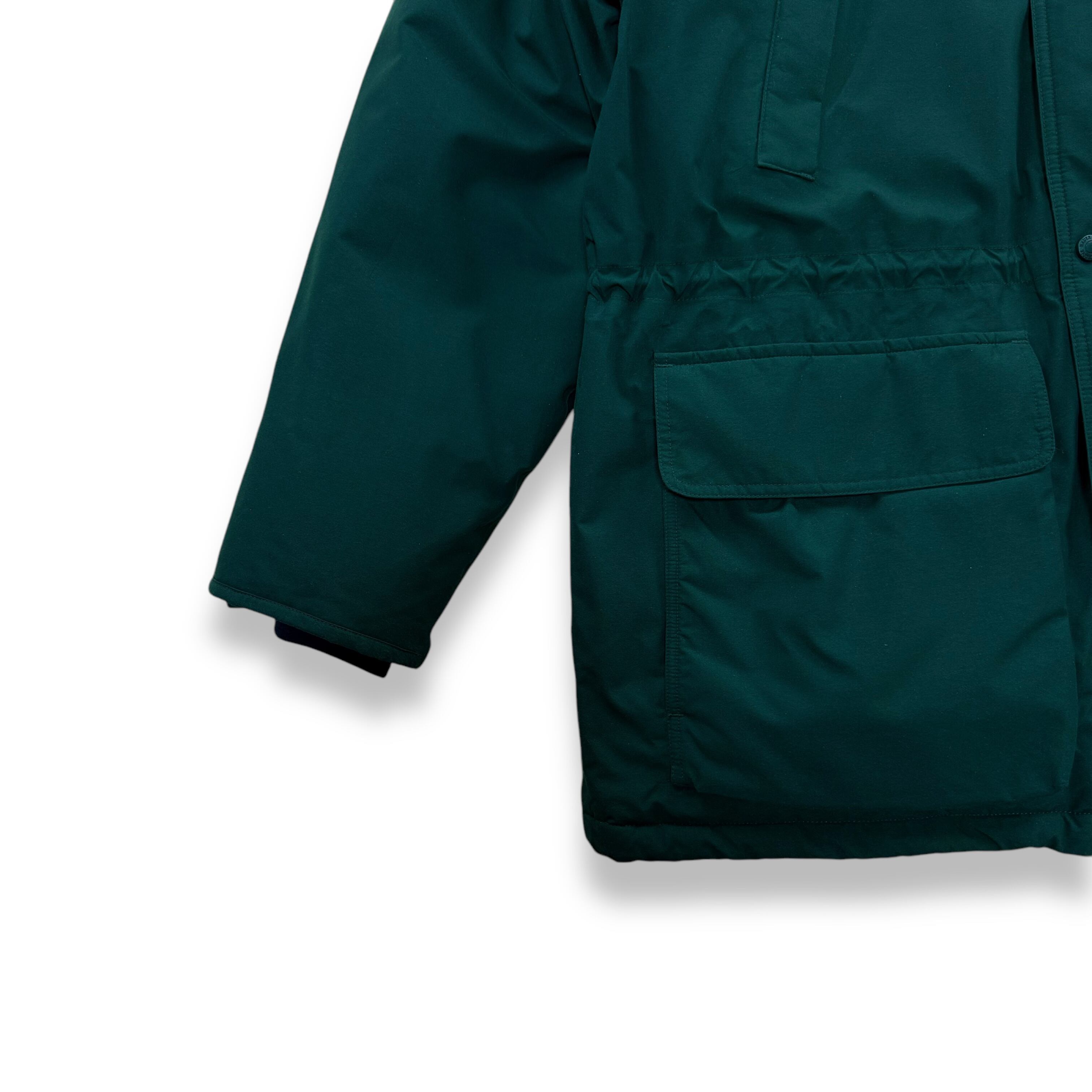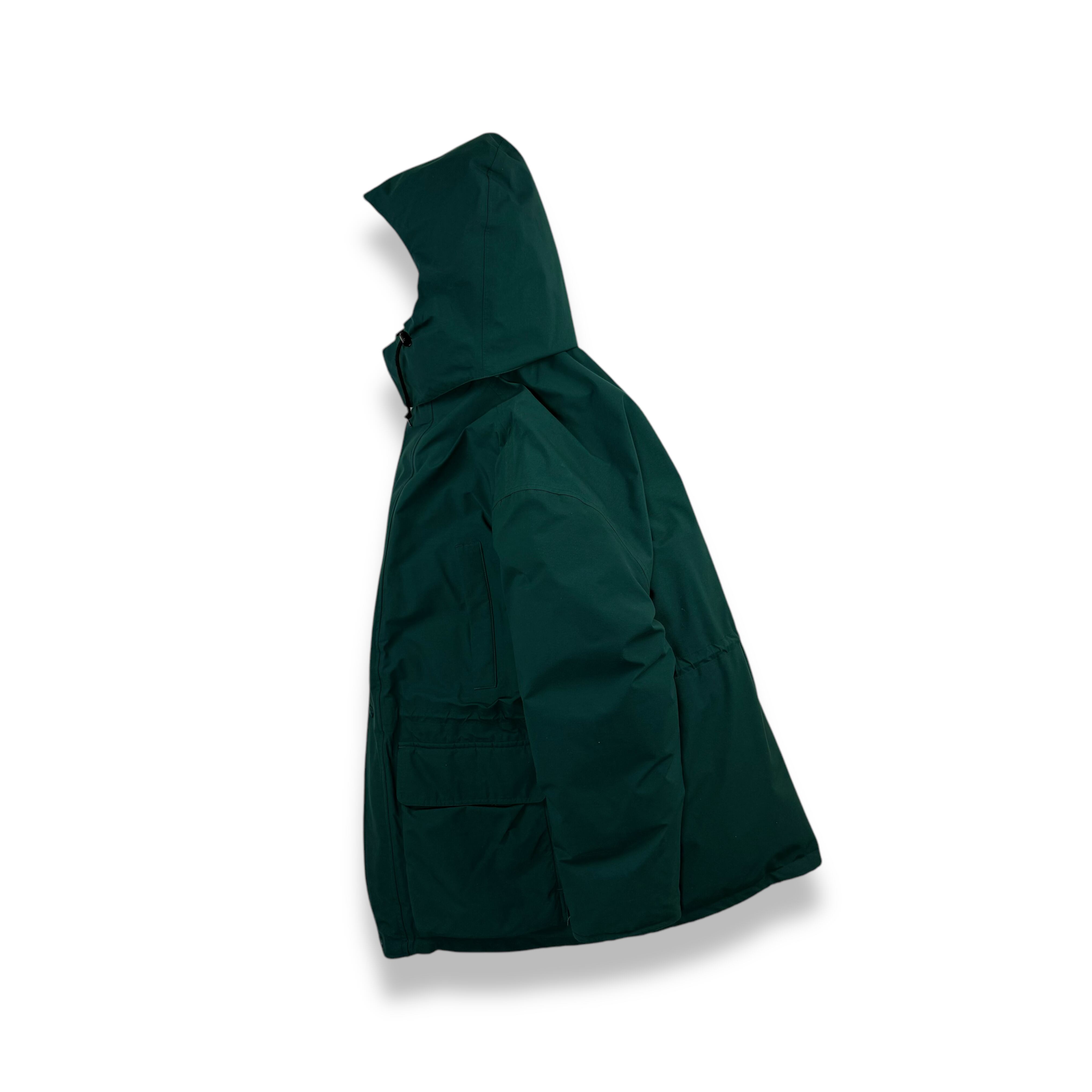 1990年代、白タグ期にリリースされたエディーバウアーの最高級ラインとして展開されていたRIDGE LINE(リッジライン) より、希少なゴアテックスナイロン仕様のグースダウンパーカ。深みのあるフォレストグリーンのシェルが印象的で、タウンユースでもアウトドアでも重たく見えない絶妙な色味です。