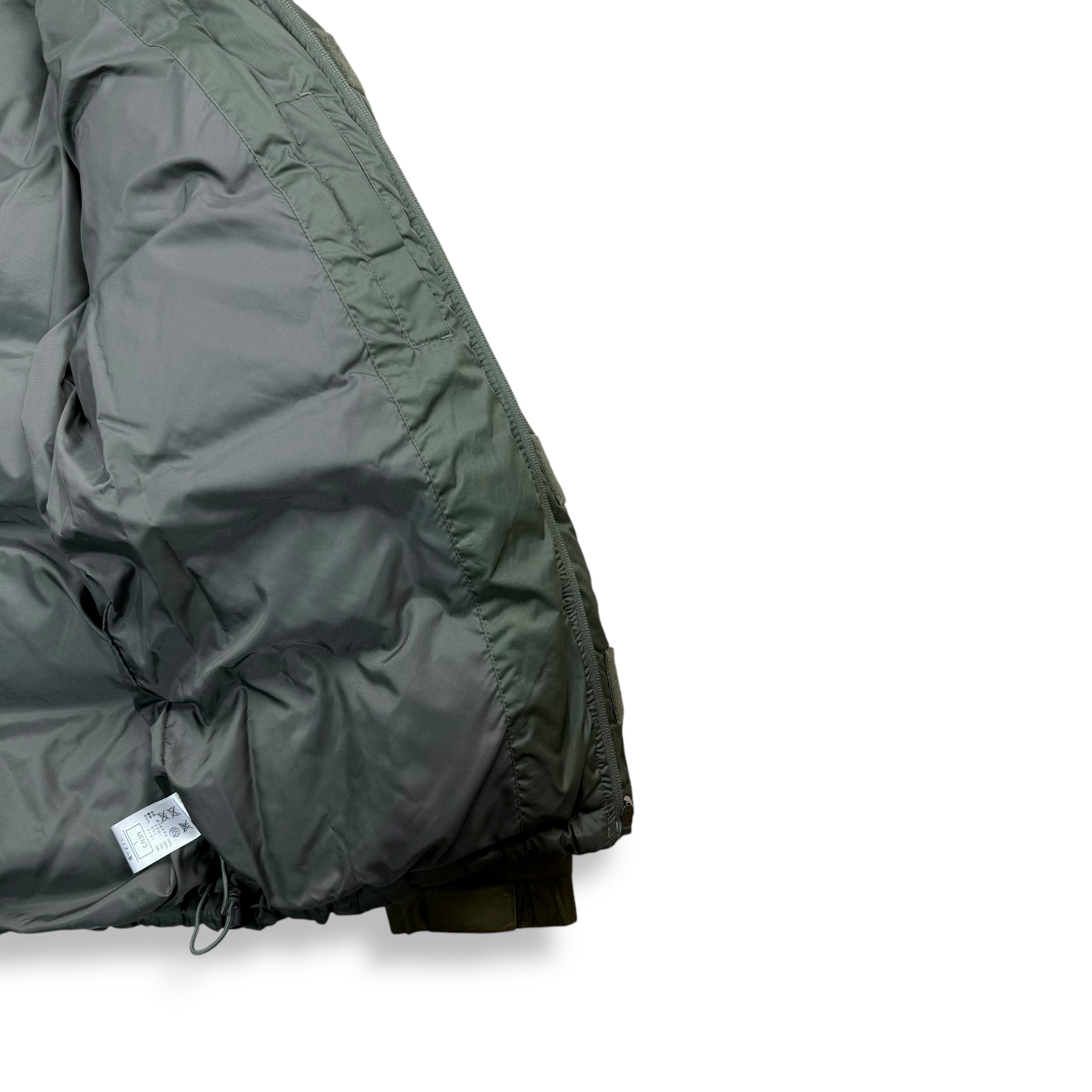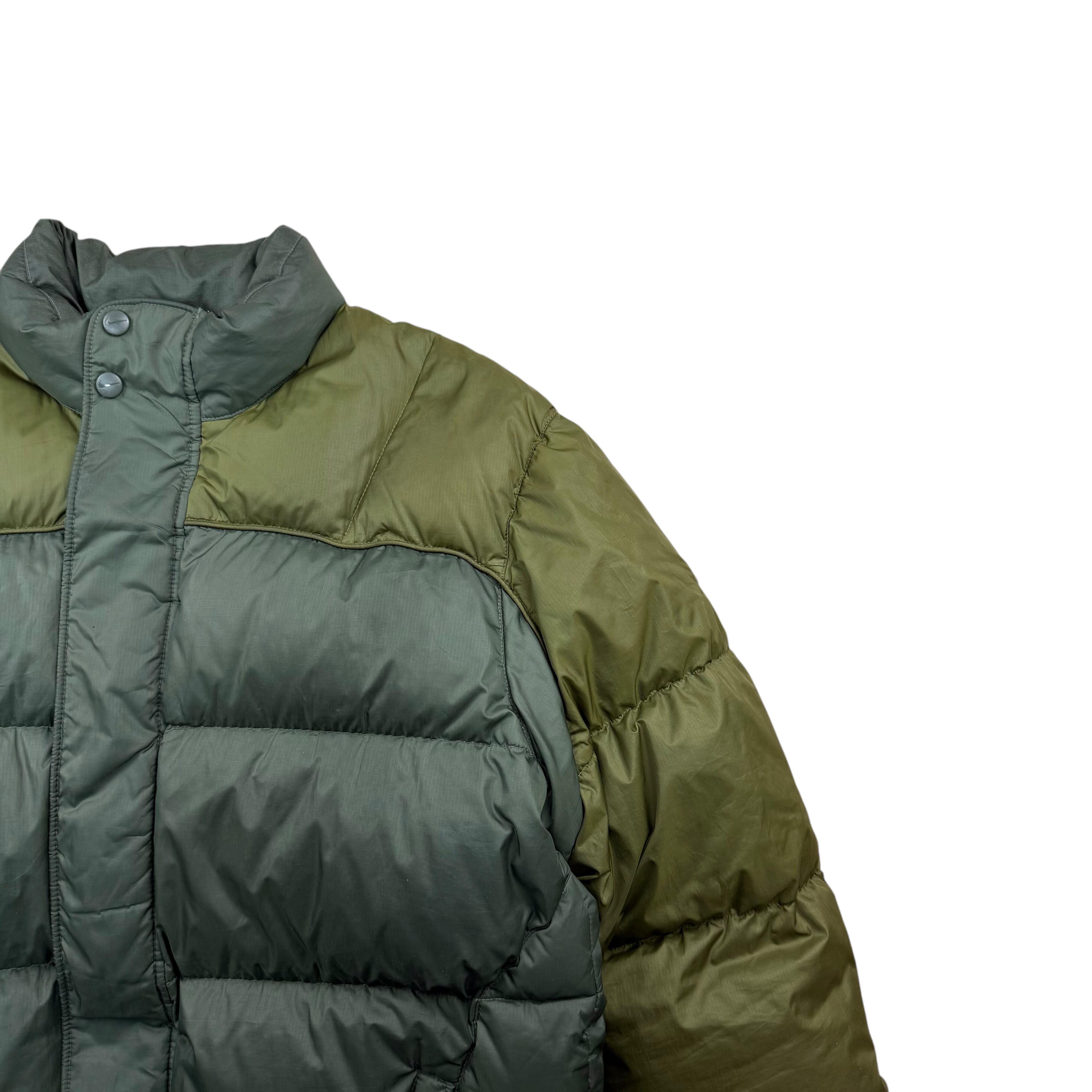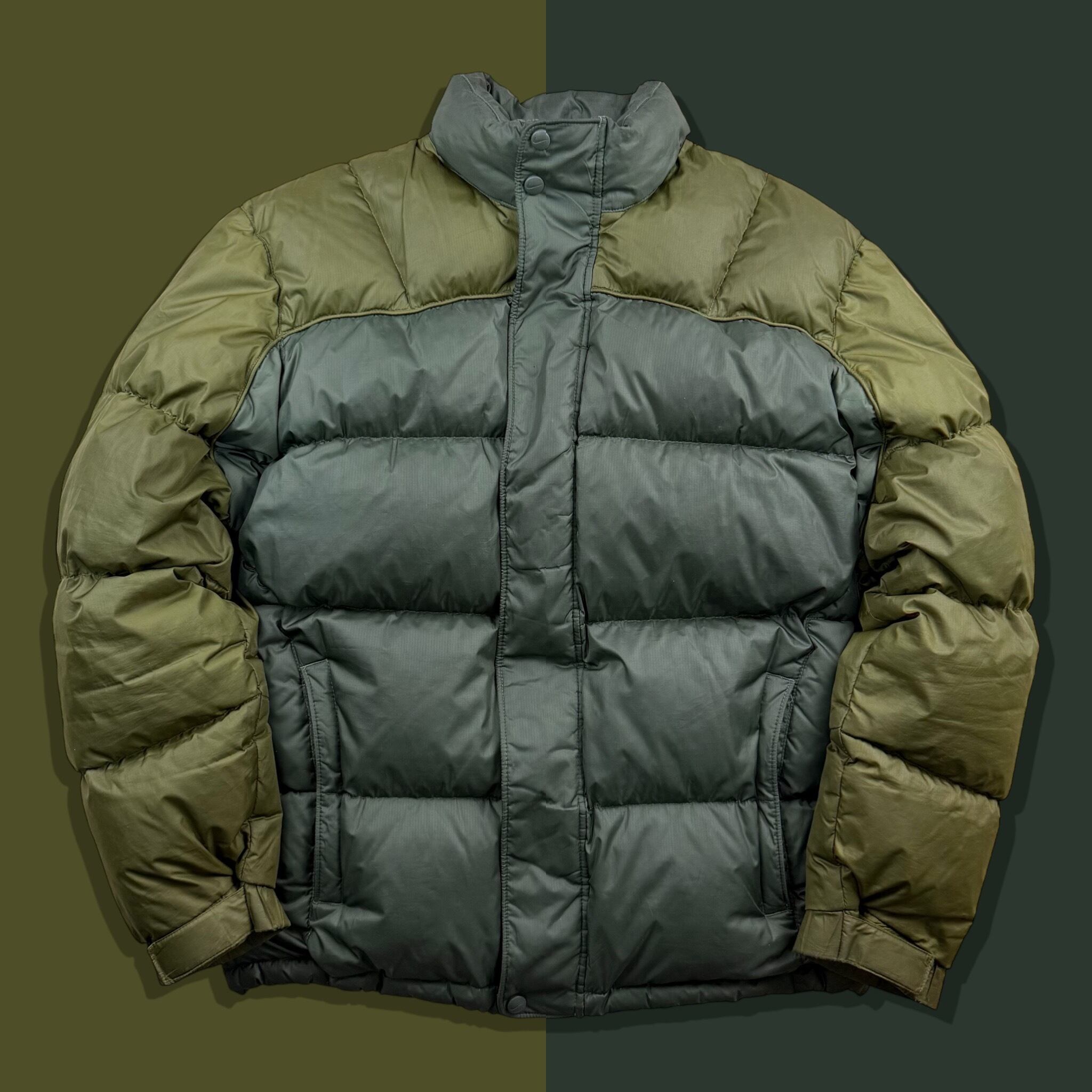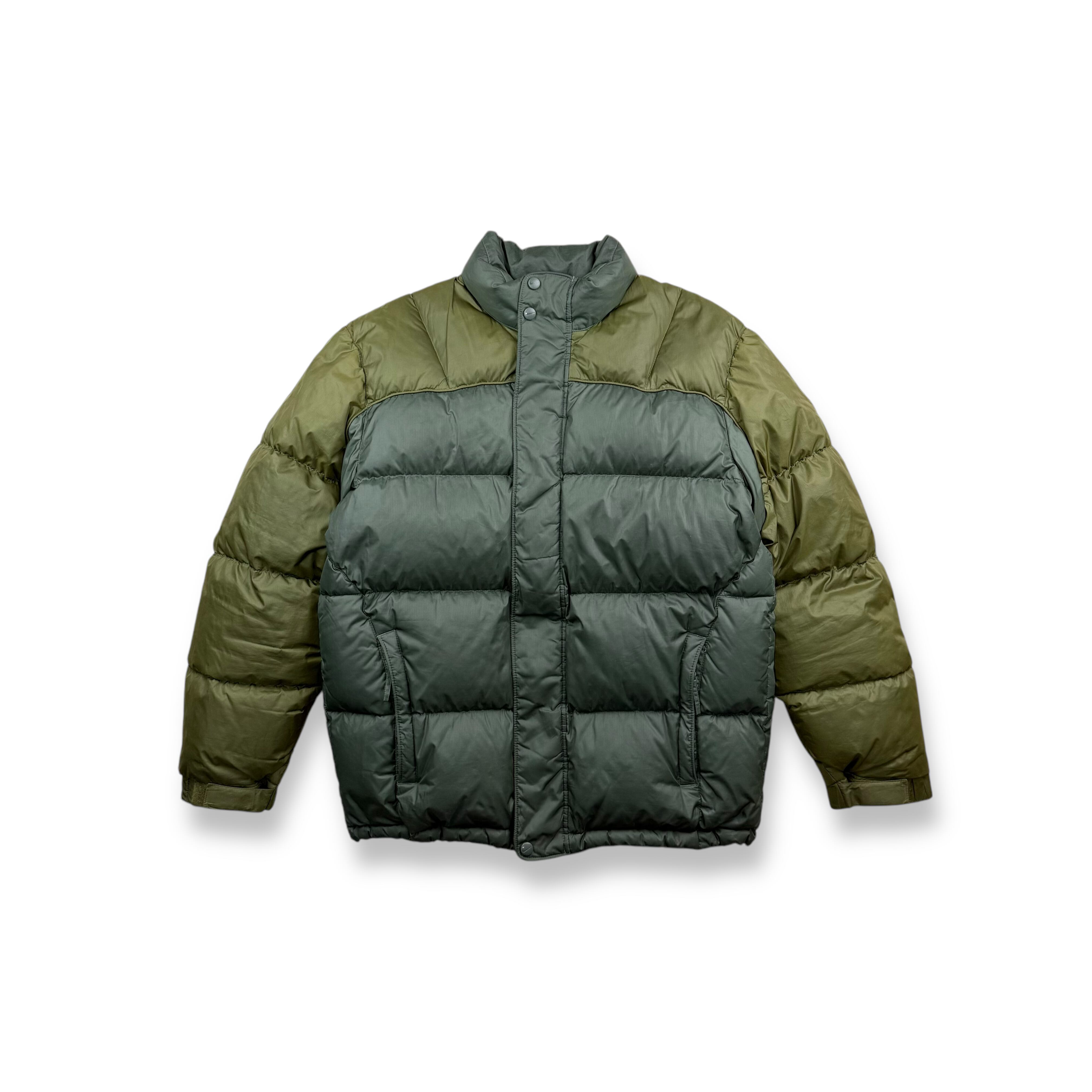 深みのあるオリーブとダークグリーンの同系色2色を組み合わせたバランスの良い配色で、ダウンジャケットではあまり見られないカラーリングです。