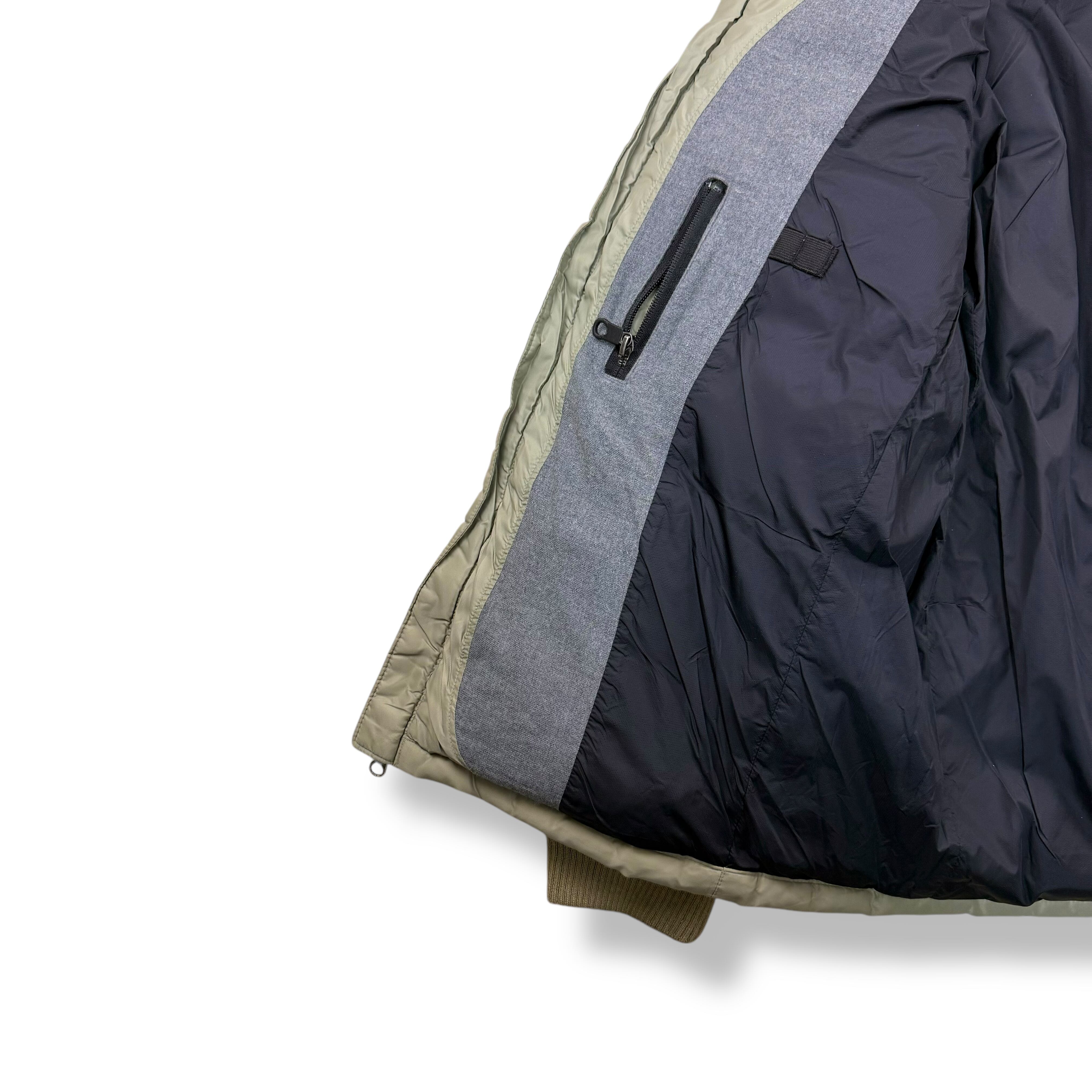 フロントは開閉調整のしやすいダブルジップ仕様。フードはジップで着脱できる2WAYデザインで、スタンドカラーのみでも着用可能。フード内部はフリースライニングを使用しており、首まわりまで柔らかく暖かい着心地を提供します。軽さと保温性を両立した当時らしいディテールです。