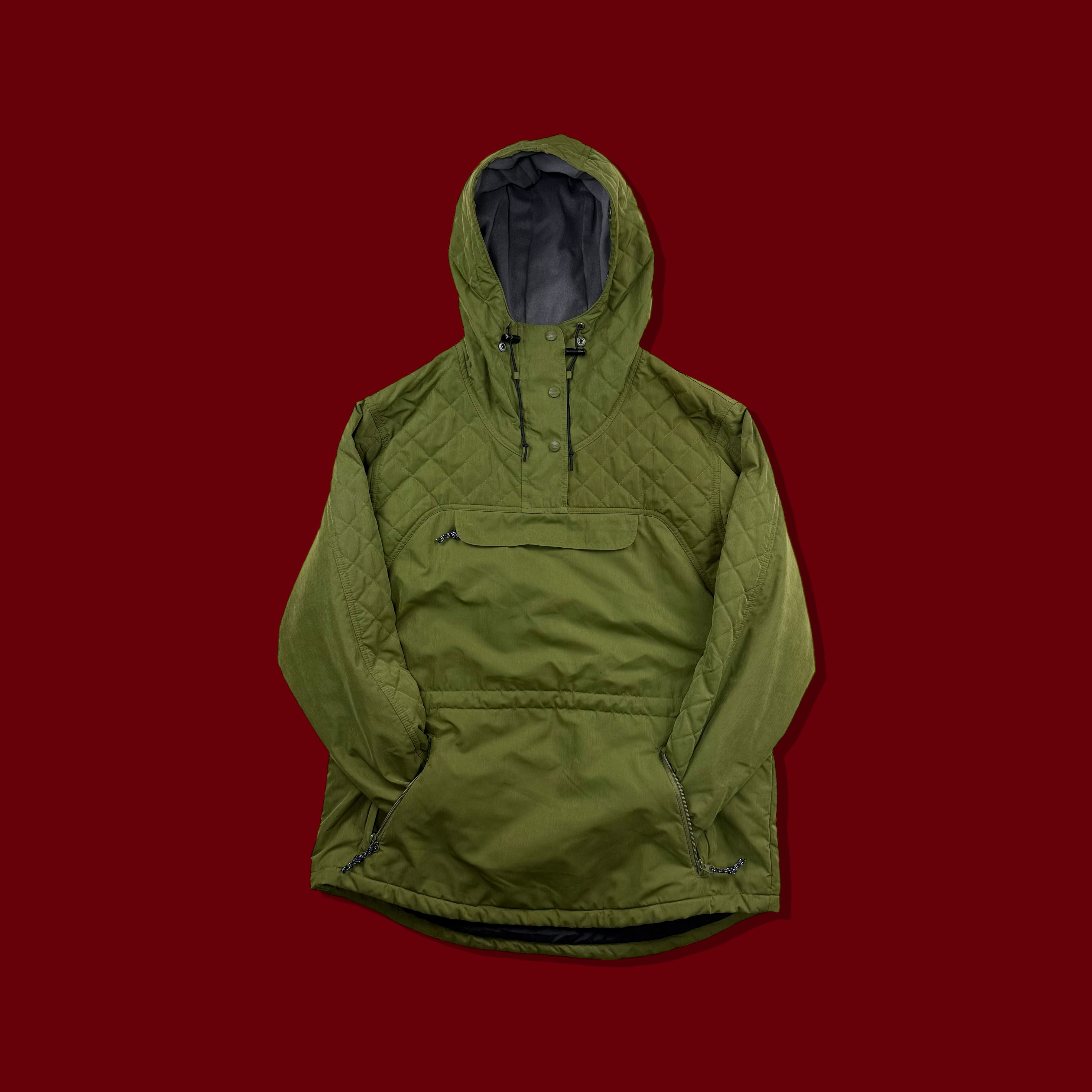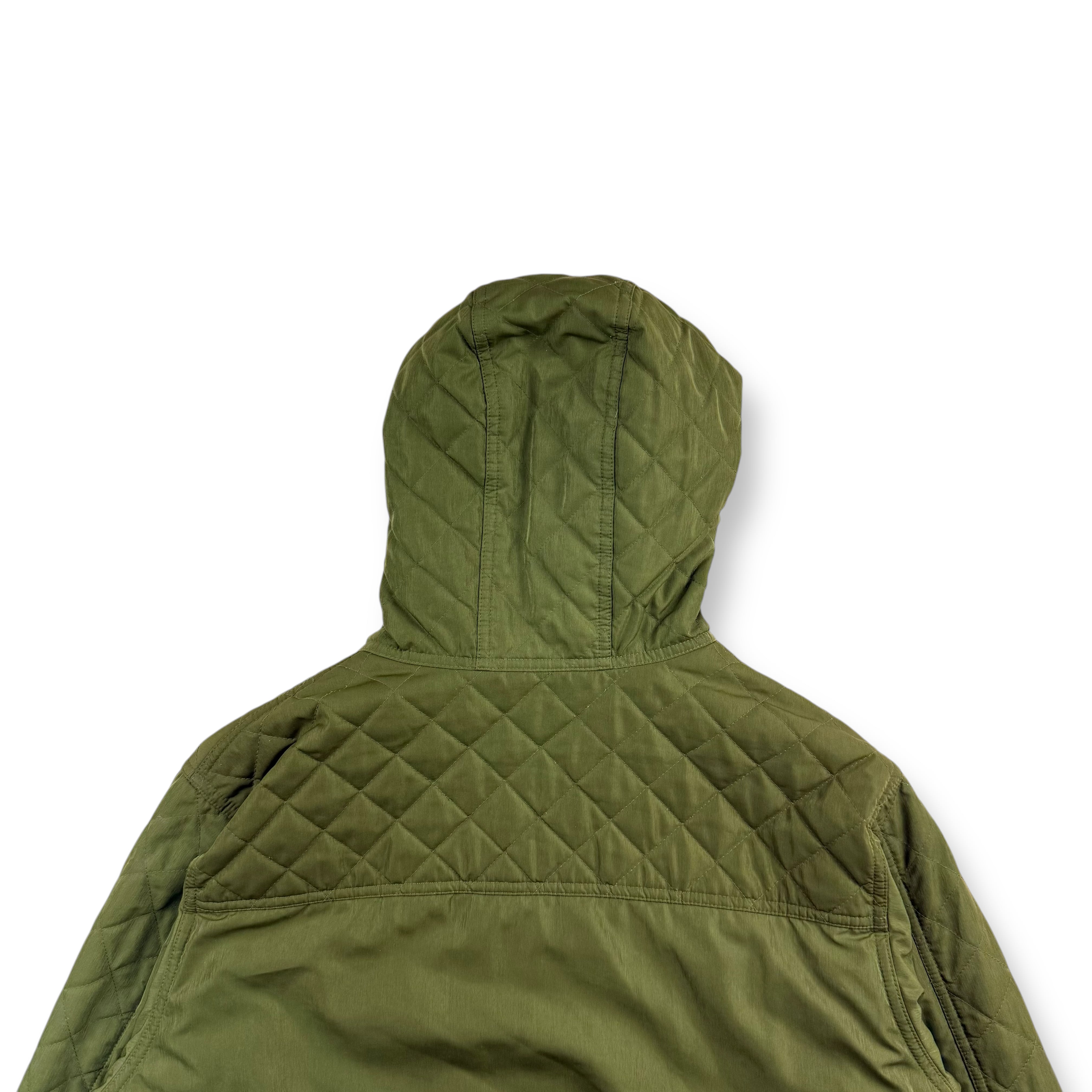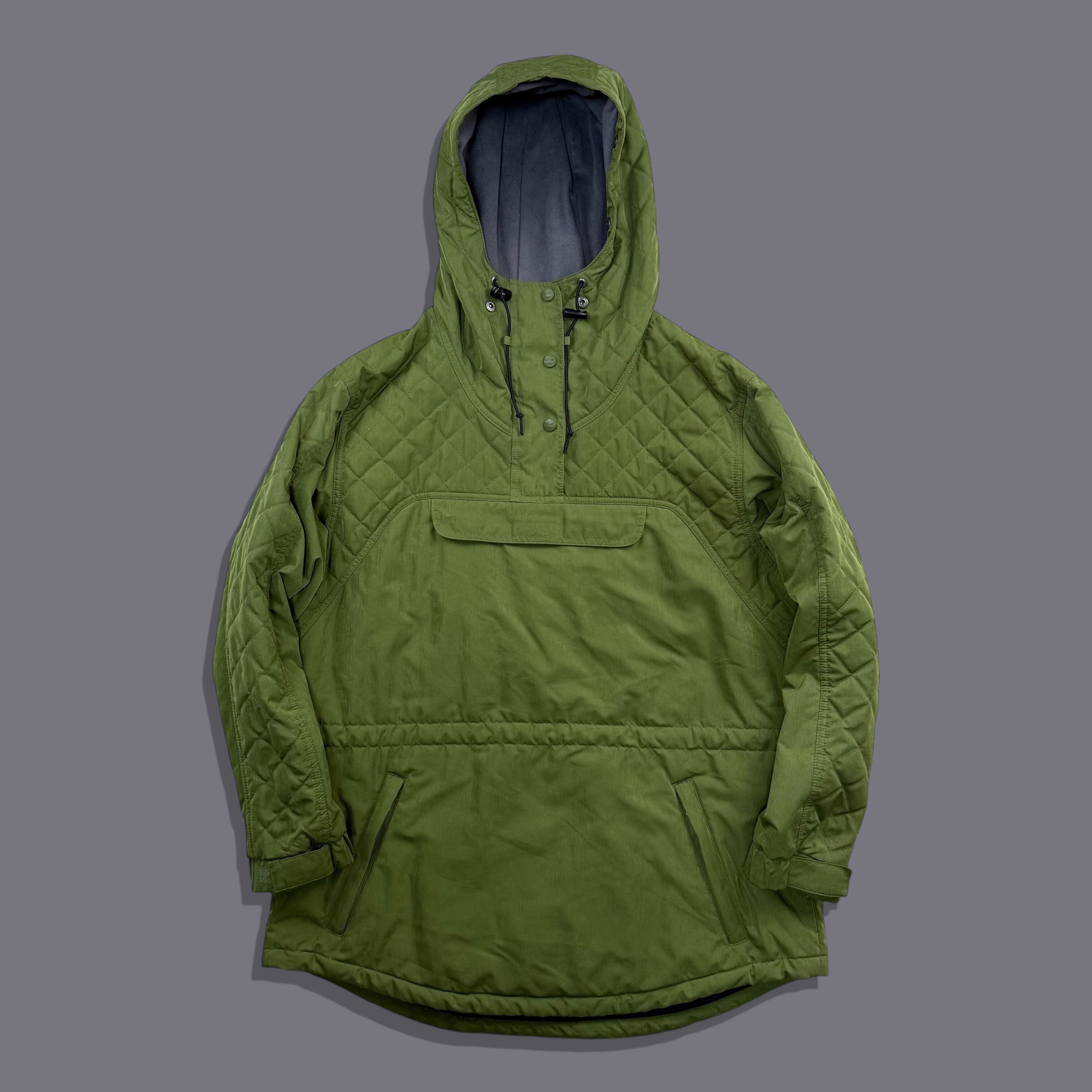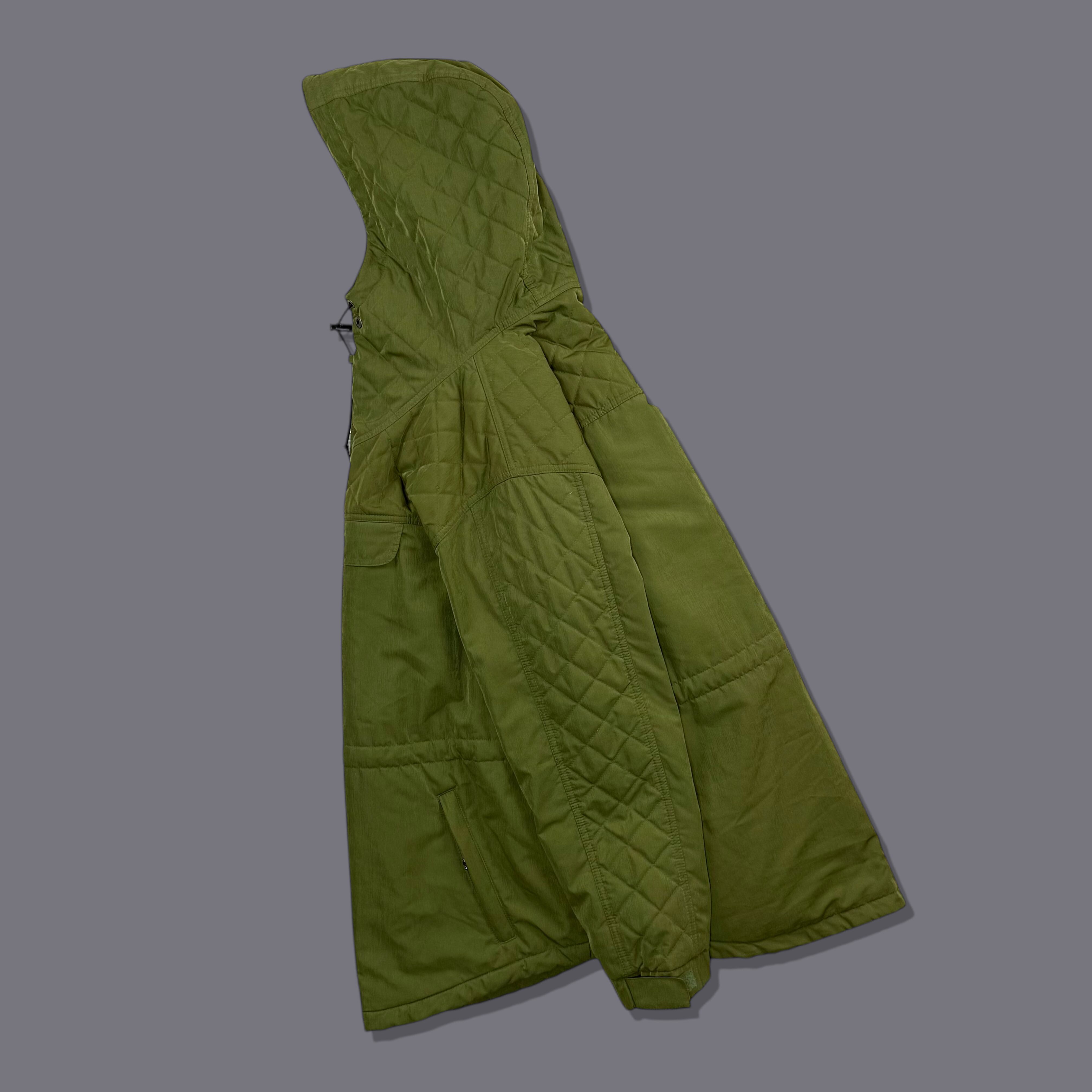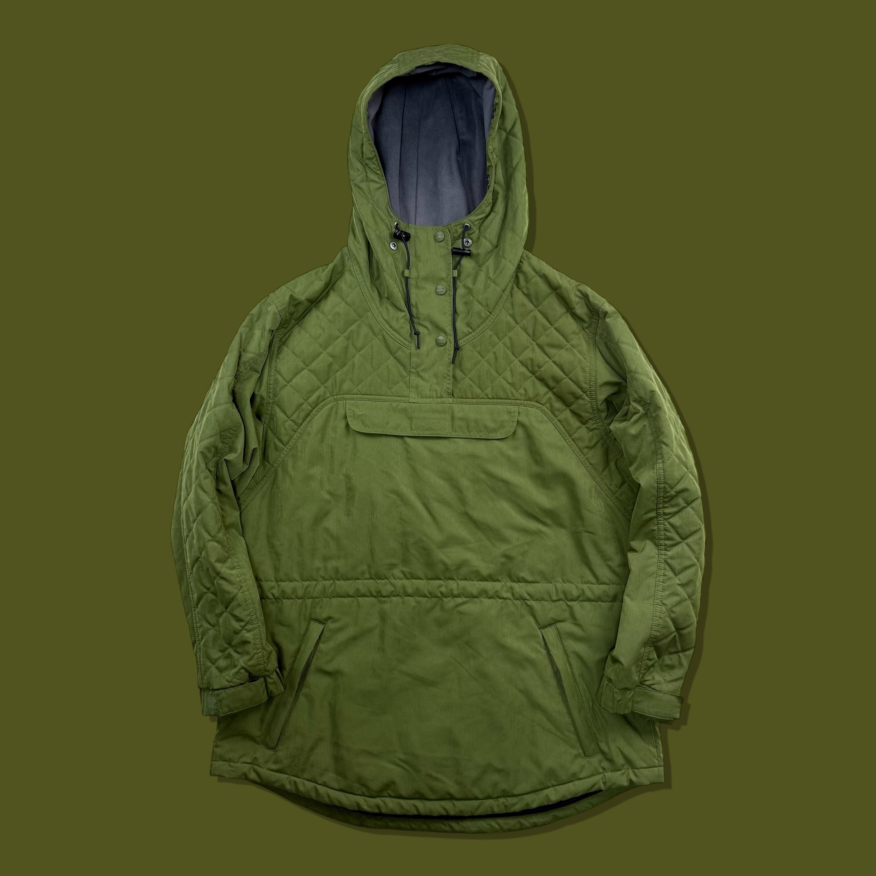 深みのあるモスグリーンを基調に、肩〜フード・袖上部をダイヤ型キルティングで切り替えたデザインで、ビーンのアウターの中でもほとんど見かけない構成です。アウトドアとミリタリーが自然に混ざり合うデザインが魅力の一着。